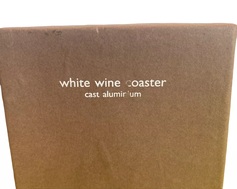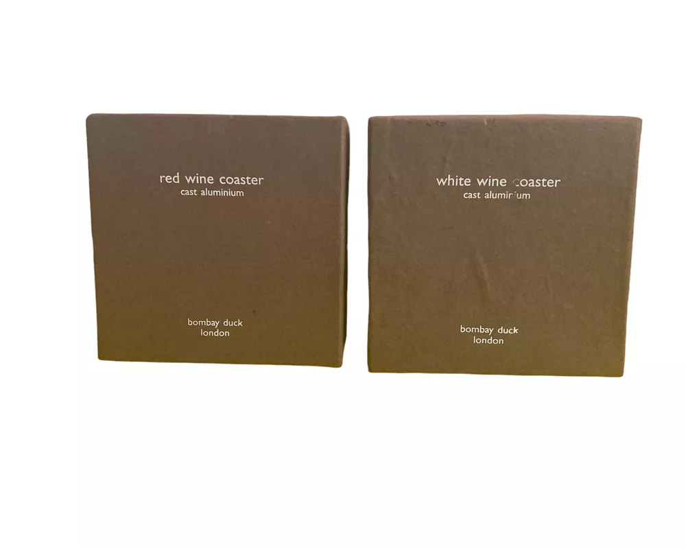 Set of 2 Bombay London Wine Coasters Etched Aluminium Boxed Red White Wine Measure approx 4" D X 1' H Set of 2 Cast Aluminum Coasters White Wine has etched Pinot Grigio, Pouilly Fume, Sanceree, Chablis, Chardonnay Red Wine has etched Burgandy, Bordeaux, Marguex, Beaujolais, Cotes du Rhone. Smoke free home Please visit my store at https://www.ebay.com/str/theuniqueredhead . Thank you for your consideration. Please message me if you have any questions. I do combined shipping on my items in the store.