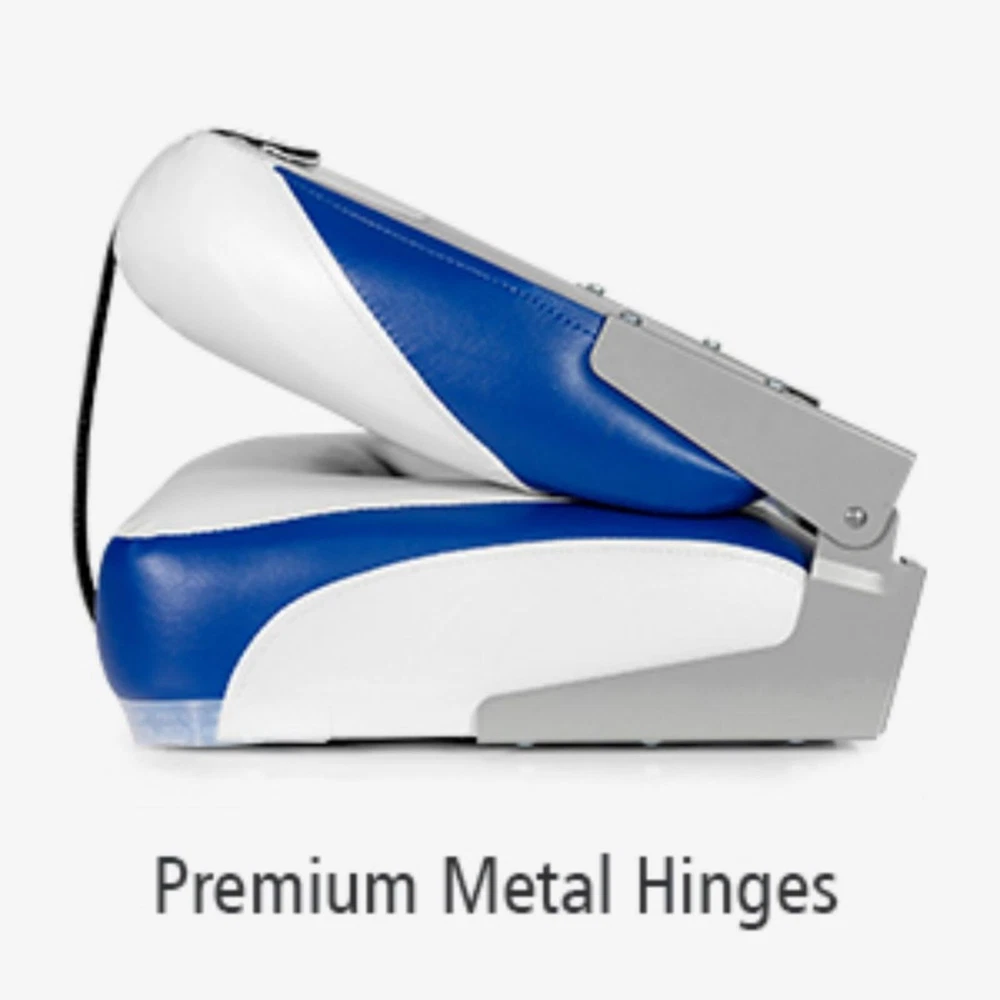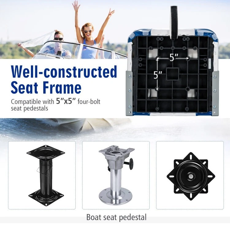 Set of 2 Folding Low Back Fishing Boat Padded Marine Large Seats W/ Steel Screws ● 2-Pack Boat Chair with Large Seat: There are 2 fishing boat chairs in one package, allowing pairs to use together. What's more, this comfortable chair has a large seat, 16" x 15.5", providing luxury using experience on the shaky boat. This sturdy boat seat can load up to 250 lbs, ensuring high stability and excellent sturdiness. ● Comfortable Sitting Experience Provided: This boat chair is fully filled with high elastic foam, providing cozy sitting experience. And the curved back provides strong support to reduce sedentariness pressure. Besides, the armless design offers you flexible sitting options. ● Weather-Resistant Material for Outdoor Use: Covered by premium PVC and PP, this fishing boat chair can withstand long-term rigors of a marine environment. Weather resistant surface ensures long-term outdoor use, and the tight stitching craftsmanship showcases lasting durability. ● Folding Design for Better Storage: This fold-down boat chair creates more space when it is not in use. And the long fixation strap is designed for space-saving storage, also good for prolonging the service life. In addition, the durable metal hinge ensures smooth flipping down and up. ● Simple Installation Steps Required: Included with stainless steel screws, this yacht seat can be simply assembled on the stand (not included) by following the detailed instruction. And the chair fits standard 5" x 5" mounting bolt pattern, any standard 4-bolt swivel or pedestal will be fine. If you have any questions, please feel free to contact us. Color: Blue Material: PVC, PP, Foam Product dimension: 19.5" x 16.5" x 20.5" (L x W x H) Seat dimension: 16" x 15.5" (L x W) Backrest dimension: 16" x 15" (L x W) Thickness of seat foam: 4.3" Load capacity: 250 lbs (per seat) Net weight (2 Pack): 22 lbs