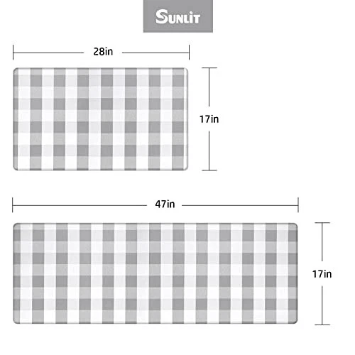 Return Policy Fast Delivery Trusted seller Set of 2 Anti Fatigue Kitchen Floor Mat, Non Slip Waterproof Comfort Standing Mat, 0.4 Inch Thick Cushioned Farmhouse Kitchen Rug Runner, Gray and White Buffalo Plaid(Size:17"x28"&17"x47") Product Description [Soft and Thicker Cushioned] E kitchen mats are made of premium 10MM PVC material, phthalate-free and latex-free. This material gets great strength and even it is extended or put under weights, it will keep its shape. The middle part of our carpets are filled with memory foam, soft and comfortable to step on. Great for someone who gets aching feet and backs that can't hold up to a hard floor. [Non-Slip Backing] Our cushioned kitchen mat and runner sets are designed with non-slip backing and you could put them on marble, wood, laminate, or any type of floor. However, slippage will still happen if you put them under the wet or watery ground. For safer use, you'd better put them under dry surfaces. [Waterproof, Oil-proof & Easy to Clean] These cushioned kitchen mats set are waterproof, oil resistant, durable and easy care. Simply wipe the dirt off with a damp cloth or use a hand-held vacuum as needed. It’s also machine washable. [Versatility] You can use them not only in kitchen, but also in bathrooms as knee mat, bedrooms as door mat, kid's room, laundry rooms, restaurant, hotel, banquet or anyw you need to stand for a long time. And they are perfect gift for friends and family! [Two Size & Unique Design] 2 piece kitchen mats included (size:17” x 28” and 17” x 47”). Environmental printing and dyeing process, non-fading and non-shrink. Design with elegant and stylish geometric pattern, perfect for any kitchen decor. Shipping Returns Payment Shipping Shipping is FREE to all addresses other than APO/PO boxes in the lower 48 states. All our stock ships from US-based warehouses. Shipped via USPS or UPS (depending on location and package weight) Unless stated otherwise, all orders will ship within 24-72 hours of your payment being processed. Check our feedback to see the great reviews of FAST shipping we offer. Returns Seller does not accept returns Payment We currently accept payment via eBay managed payments only. Once payment is cleared, we will dispatch your shipment within 1-3 business days. Please refer to the "Shipping" tab for more information regarding shipping speed to your destination.