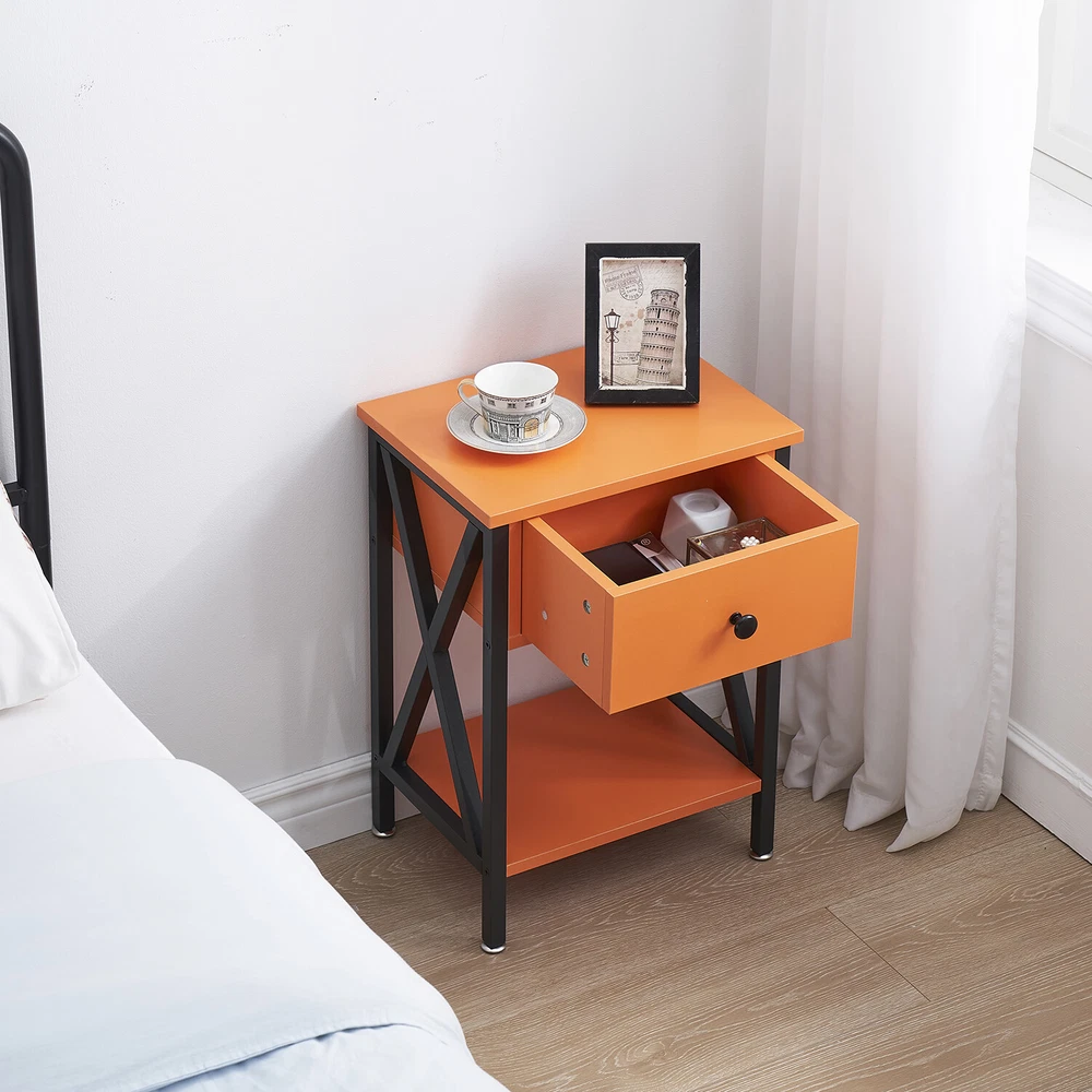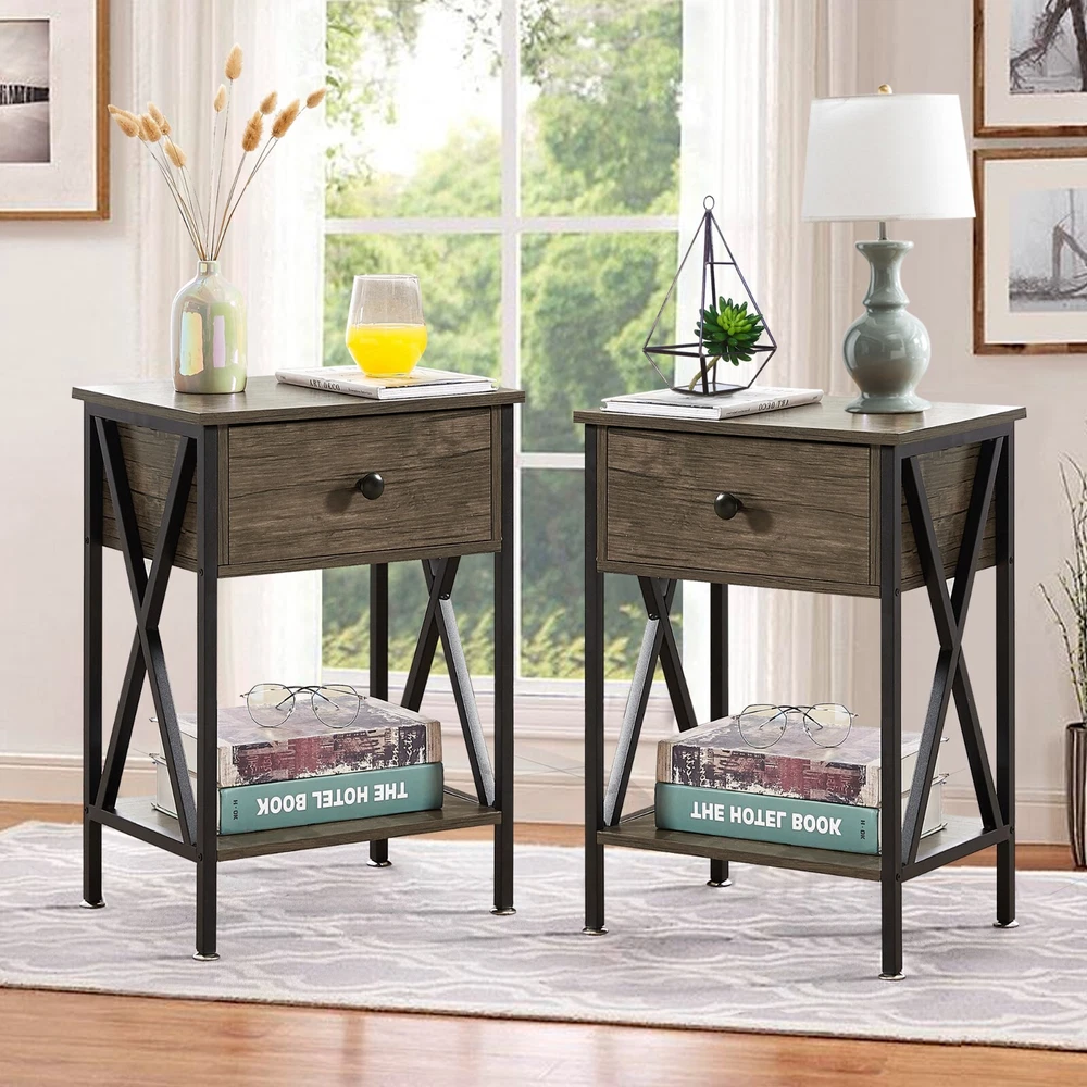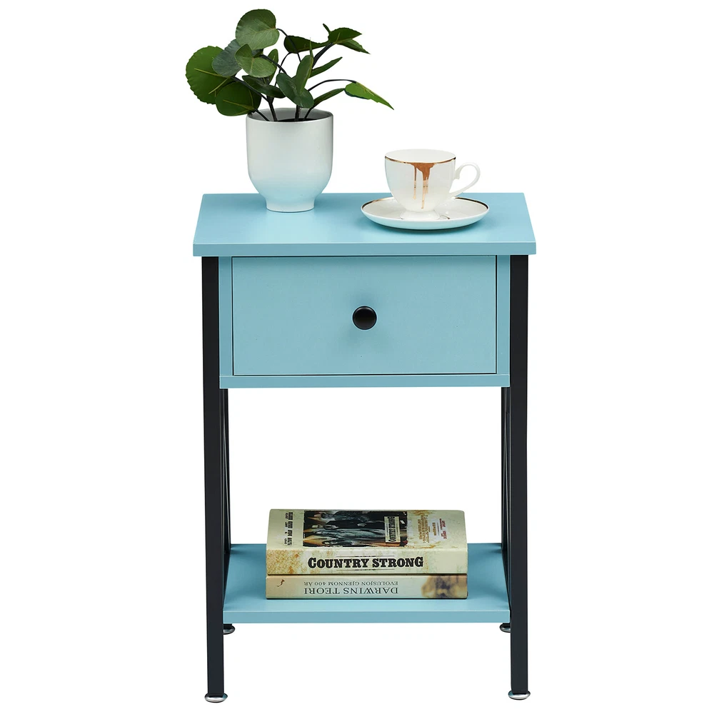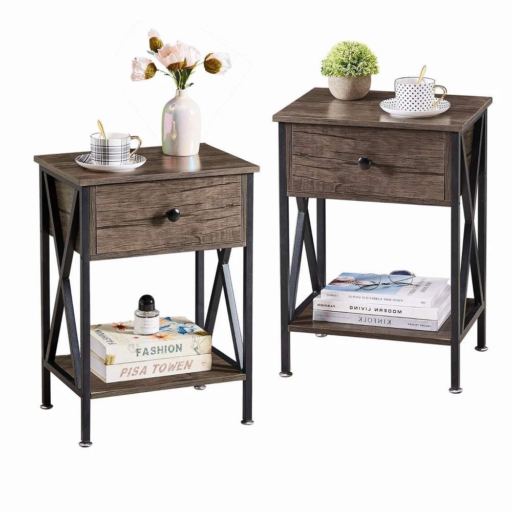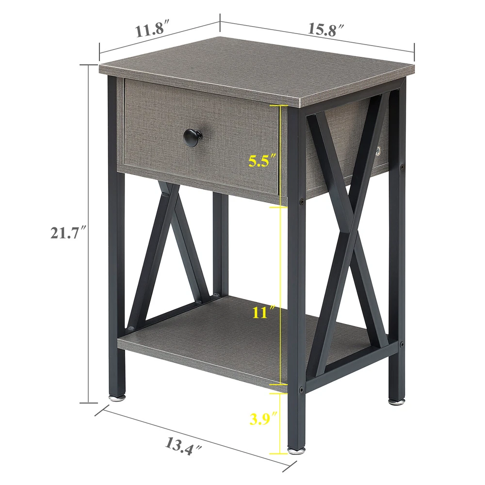 Features ² 【 Vintage appearance】The classical design and simple construction gives this modern nightstand a beautiful and elegant look. The nightstand is functional and suitable for any space. ² 【 Large Storage】Equipped with a pull-out drawer and a large-capacity lower cabinet, it is the perfect choice for bedside item storage, keeping your bedside tidy. ² 【 Multi-scenario use】You can put it in the living room as a side table, or a small coffee table. It can also be placed in the bedroom as a bedside table, next to the desk is also a good choice. Storage can be done better. ² 【 Reliable Quality】Made of high-quality MDF and metal, coupled with an X-shaped frame design, strong and stable. Four adjustable metal foot pads keep the nightstand balanced on uneven ground and increase its stability. ² 【 Easy Assembly】 Detailed instructions and all labeled parts and accessories are included, Just following the easy-to-understand and finishing the assembly quickly .The end table wipe-clean surface, and is easy to clean. Specifications Nightstand Color: Brown, Black, White, Walnut Brown, Hemp Gray, Gray, Antique Brown, Light Blue, Orange, Pink Material: Manufactured Wood; Metal. Size:21.7'' H X 15.8'' W X 11.8'' D Weight: 60 lb. Package Includes: 2 x End tables 1 x Instructions 1 x Assembly Bag Note: 1. When viewing the color of the product on your monitor, it may differ from the actual color of the item. 2. Please allow ±1/0.5'' error due to manual measurement.