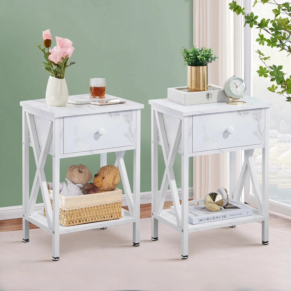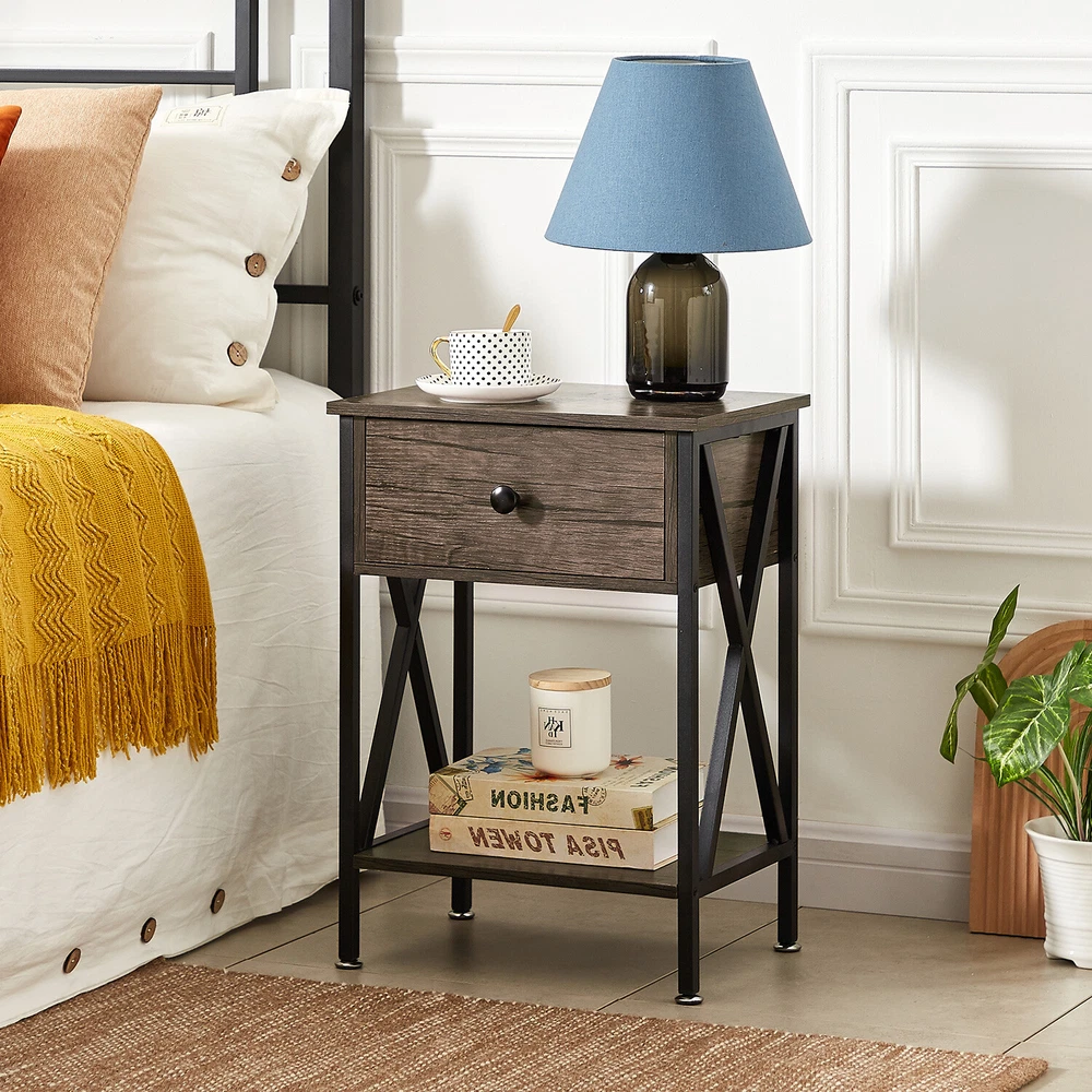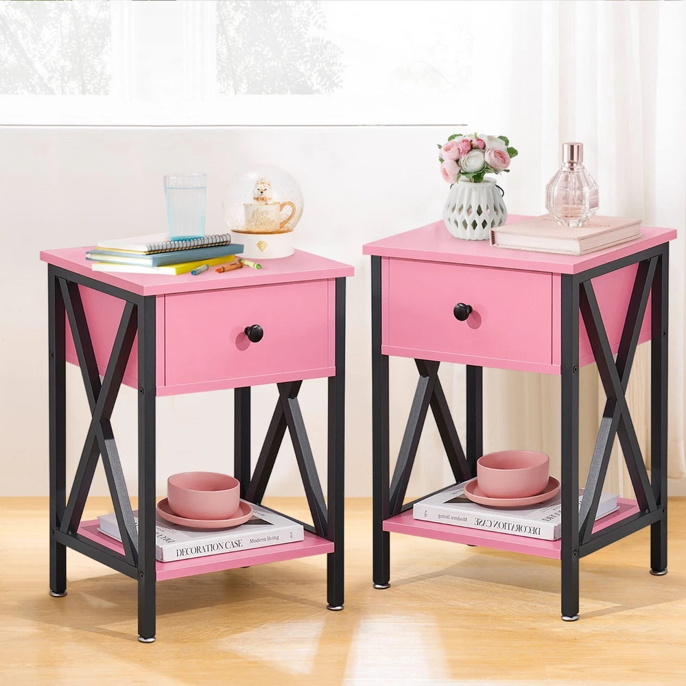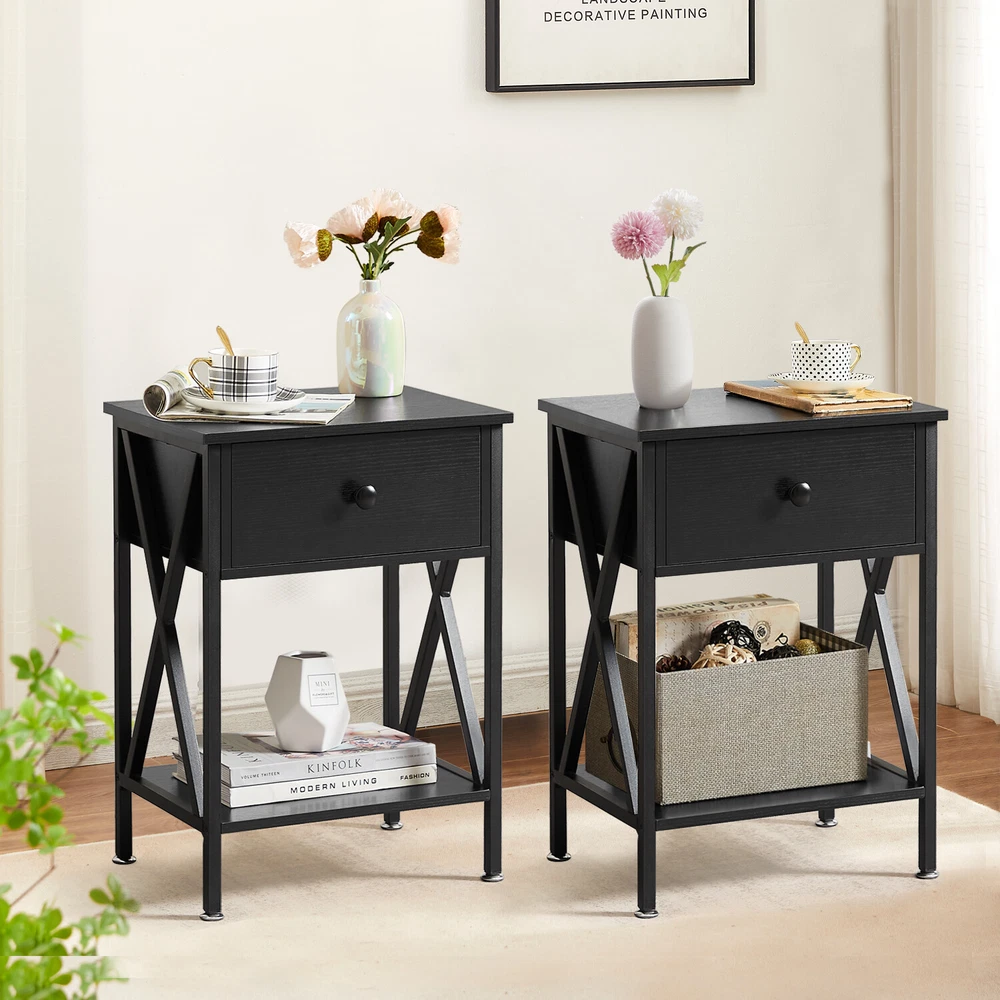 Features ² 【 Vintage appearance】The classical design and simple construction gives this modern nightstand a beautiful and elegant look. The nightstand is functional and suitable for any space. ² 【 Large Storage】Equipped with a pull-out drawer and a large-capacity lower cabinet, it is the perfect choice for bedside item storage, keeping your bedside tidy. ² 【 Multi-scenario use】You can put it in the living room as a side table, or a small coffee table. It can also be placed in the bedroom as a bedside table, next to the desk is also a good choice. Storage can be done better. ² 【 Reliable Quality】Made of high-quality MDF and metal, coupled with an X-shaped frame design, strong and stable. Four adjustable metal foot pads keep the nightstand balanced on uneven ground and increase its stability. ² 【 Easy Assembly】 Detailed instructions and all labeled parts and accessories are included, Just following the easy-to-understand and finishing the assembly quickly .The end table wipe-clean surface, and is easy to clean. Specifications Nightstand Color: Brown, Black, White, Walnut Brown, Hemp Gray, Gray, Antique Brown, Light Blue, Orange, Pink Material: Manufactured Wood; Metal. Size:21.7'' H X 15.8'' W X 11.8'' D Weight: 60 lb. Package Includes: 2 x End tables 1 x Instructions 1 x Assembly Bag Note: 1. When viewing the color of the product on your monitor, it may differ from the actual color of the item. 2. Please allow ±1/0.5'' error due to manual measurement.