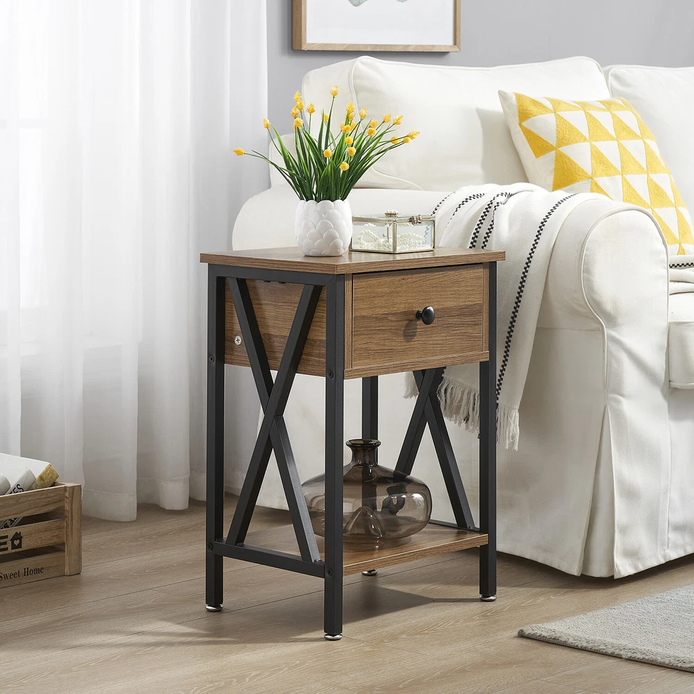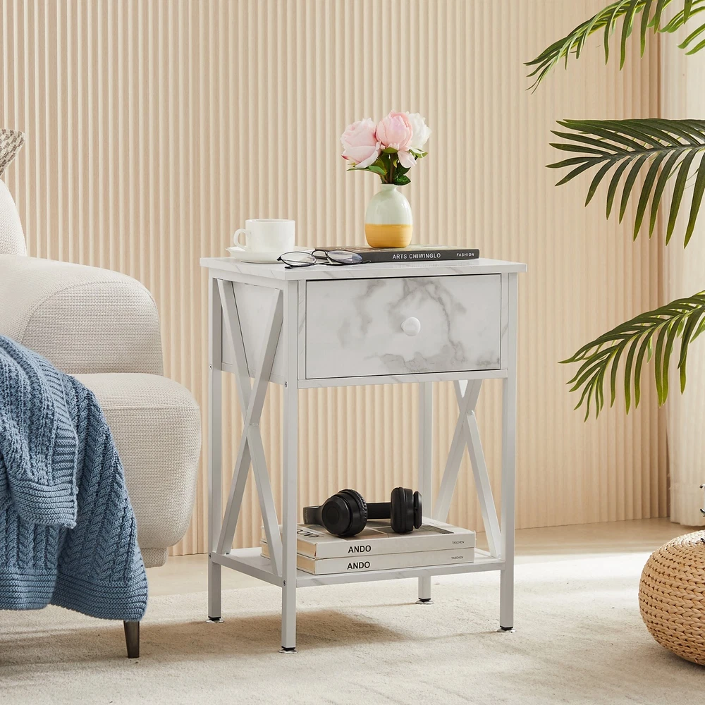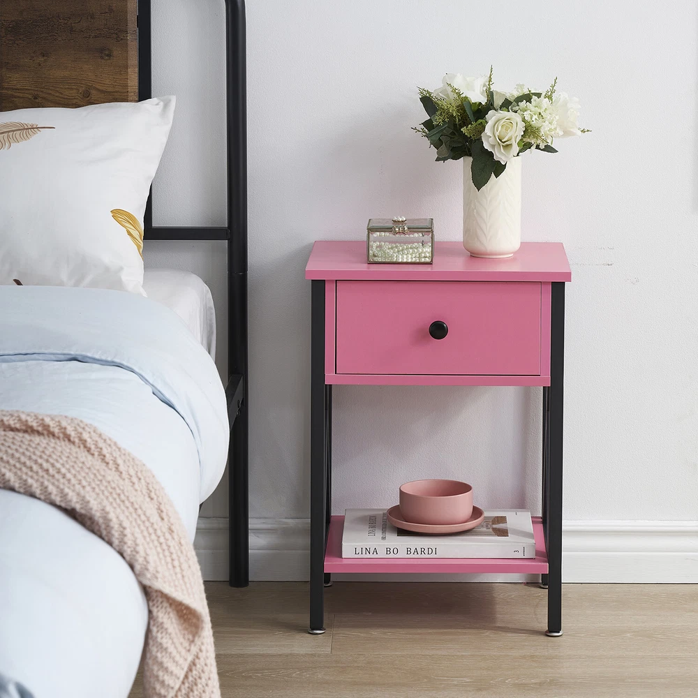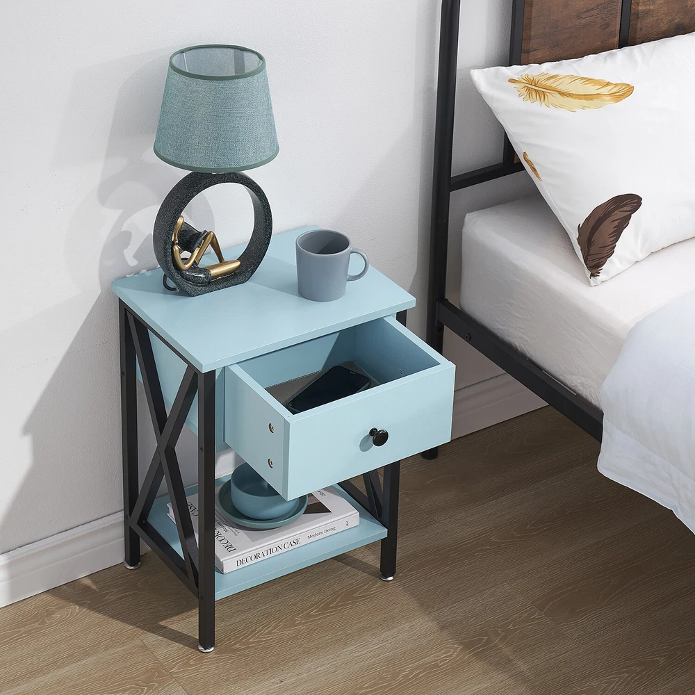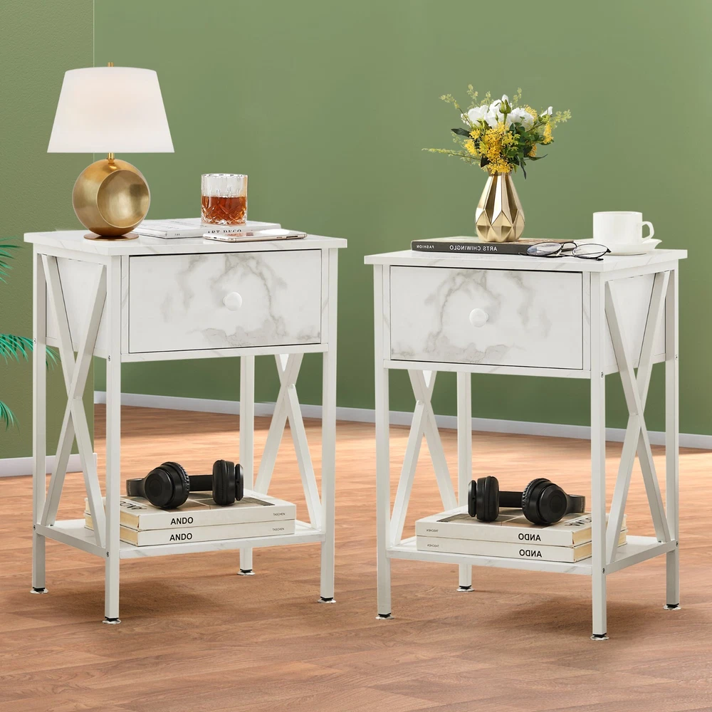 Features ² 【 Vintage appearance】The classical design and simple construction gives this modern nightstand a beautiful and elegant look. The nightstand is functional and suitable for any space. ² 【 Large Storage】Equipped with a pull-out drawer and a large-capacity lower cabinet, it is the perfect choice for bedside item storage, keeping your bedside tidy. ² 【 Multi-scenario use】You can put it in the living room as a side table, or a small coffee table. It can also be placed in the bedroom as a bedside table, next to the desk is also a good choice. Storage can be done better. ² 【 Reliable Quality】Made of high-quality MDF and metal, coupled with an X-shaped frame design, strong and stable. Four adjustable metal foot pads keep the nightstand balanced on uneven ground and increase its stability. ² 【 Easy Assembly】 Detailed instructions and all labeled parts and accessories are included, Just following the easy-to-understand and finishing the assembly quickly .The end table wipe-clean surface, and is easy to clean. Specifications Nightstand Color: Brown, Black, White, Walnut Brown, Hemp Gray, Gray, Antique Brown, Light Blue, Orange, Pink Material: Manufactured Wood; Metal. Size:21.7'' H X 15.8'' W X 11.8'' D Weight: 60 lb. Package Includes: 2 x End tables 1 x Instructions 1 x Assembly Bag Note: 1. When viewing the color of the product on your monitor, it may differ from the actual color of the item. 2. Please allow ±1/0.5'' error due to manual measurement.