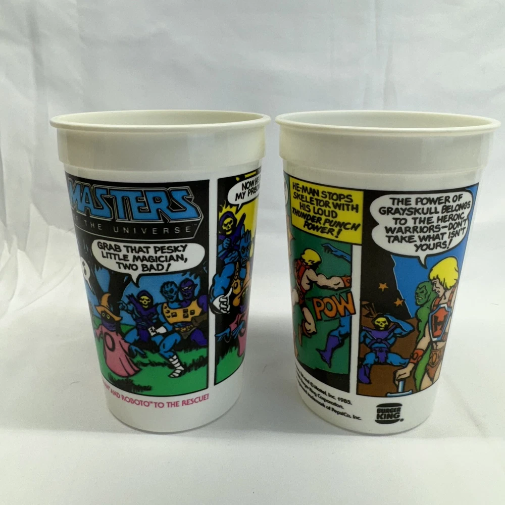 Set of 2 Plastic Cups He-Man Masters of the Universe 185 Burger King Mattel Great condition no cracking or fading Great collectors piece 100% authentic or moneyback guaranteed ——————————————————————————— Return Window: We Gladly accept Returns within 30 Days of your transaction. Condition: The item must be in the same Condition as Received along with the original packaging. Return Shipping: The buyer is responsible for return shipping costs unless the return is due to an error on our part. Refund process: Once we receive the returned item we will process your refund. Refunds will be issued to the original payment used for the purchase.