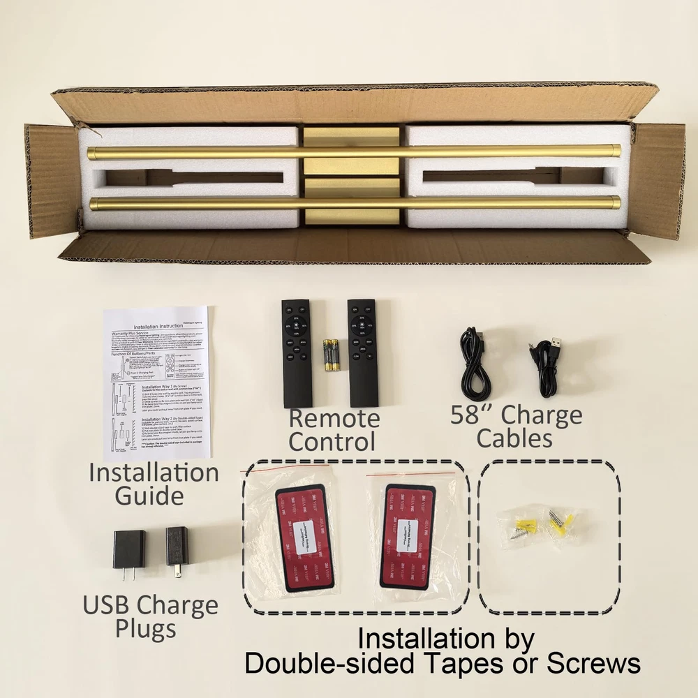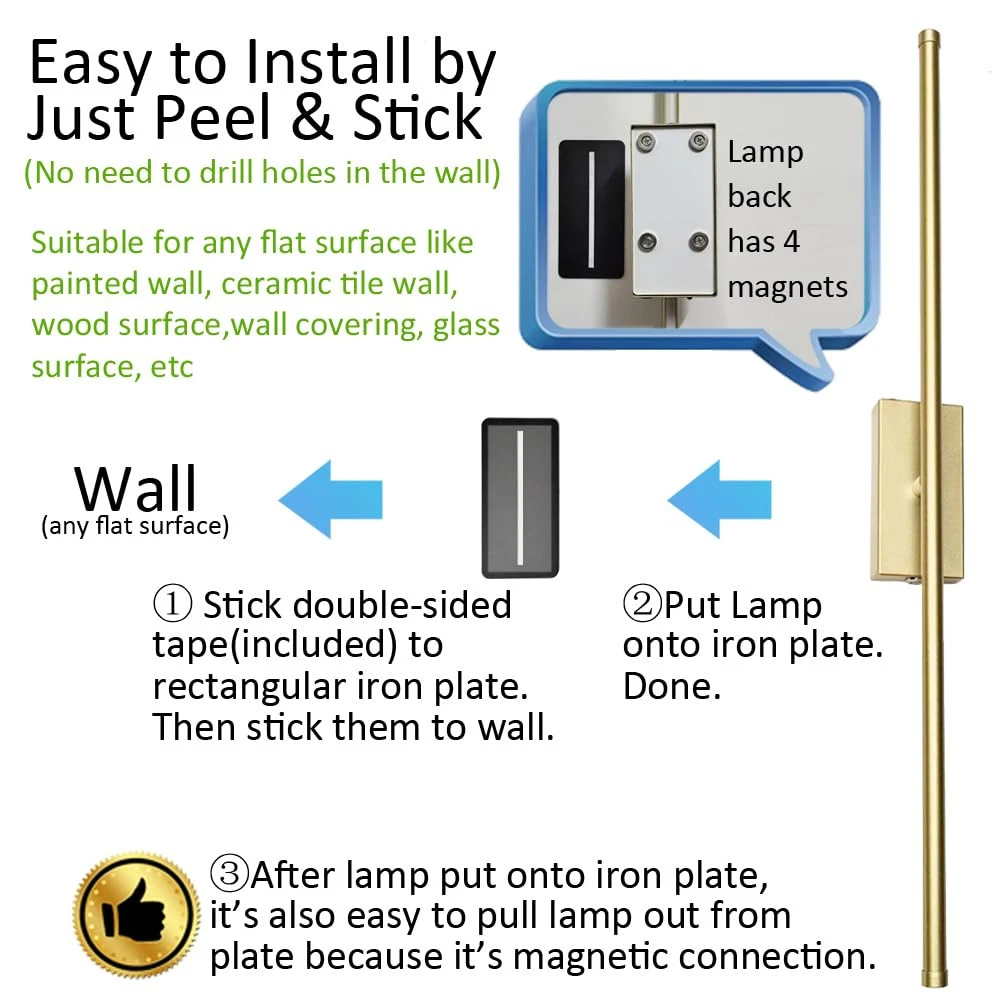 【Excellent Design】This set of 2 rechargeable wireless wall sconces use narrow base design which make the whole lamp looks slim and elegant. They are made of strong metal and dimmable. You could use remote control or touch switch to control light on/off, change brightness and color temperature among cold white/warm white/neutral white. 【Don’t Need Electrician and Super Easy to Install】These gold cordless wall sconces are battery operated so they don't need wiring. Installation iron plate was included you could fix it to wall by either double-sided tape or screws. As lamp back has magnetics so you just put lamp onto iron plate (magnetic connection). Done. Later it's also very easy for you to pull out the lamp from iron plate. The installation way by double-sided tape is suitable for almost every installation surface like painted wall, ceramic tile wall, wood surface, wall covering, glass surface, mirror etc. 【Super Easy to Charge】Each package includes 2 pieces of long (58’’) USB-C charge cables AND 2 pieces of charger plugs so it’s super easy to charge if you have outlet nearby. You could also pull wall sconce out from iron plate to charge. 【Long Endurance】Each battery operated wall sconce has big capacity battery inside. After full charged, lamp could keep working for 10~80+ hours (depends on brightness). Press down the touch switch on lamp could get lowest brightness. 【Various Applications】These modern and minimalist cordless wall sconces are ideal for living room, bedroom, corridors, entryway, bathroom, dining room, etc.