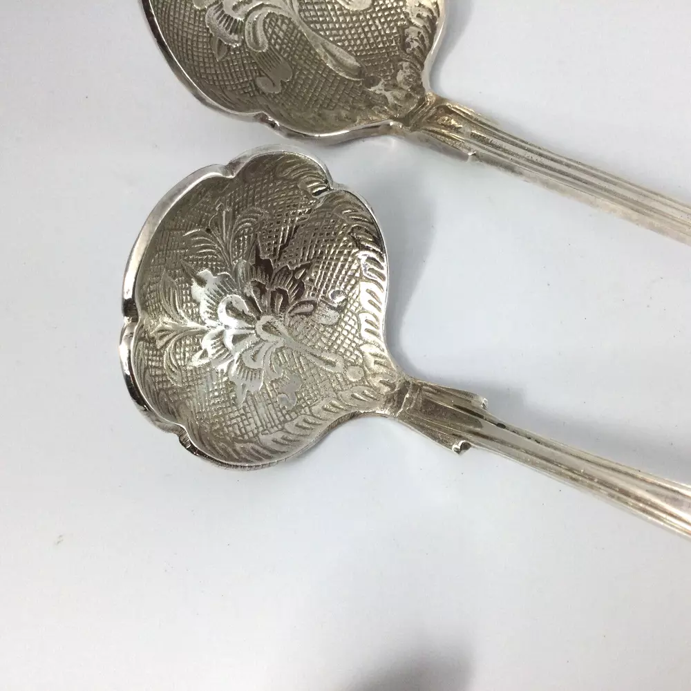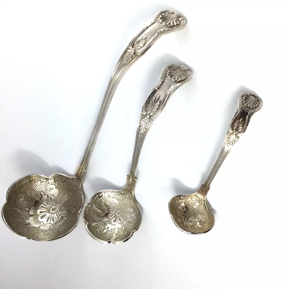 Set of 3 Ladles Serving Utensils Stainless Steel Scalloped Edges. Very good condition, no damage. The biggest is 11" L, medium one is 8" L and smallest is 5" L. Beautiful floral design on inside part of all ladles. InvN/GS/4