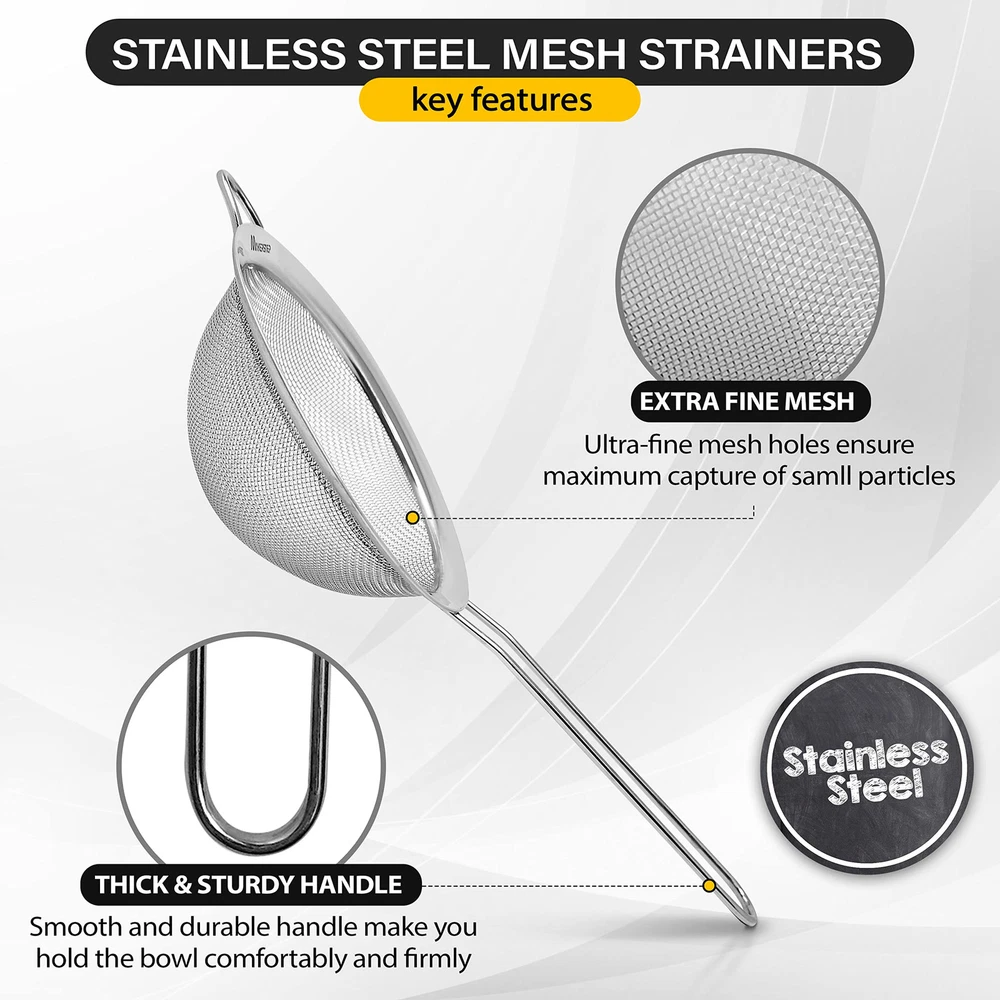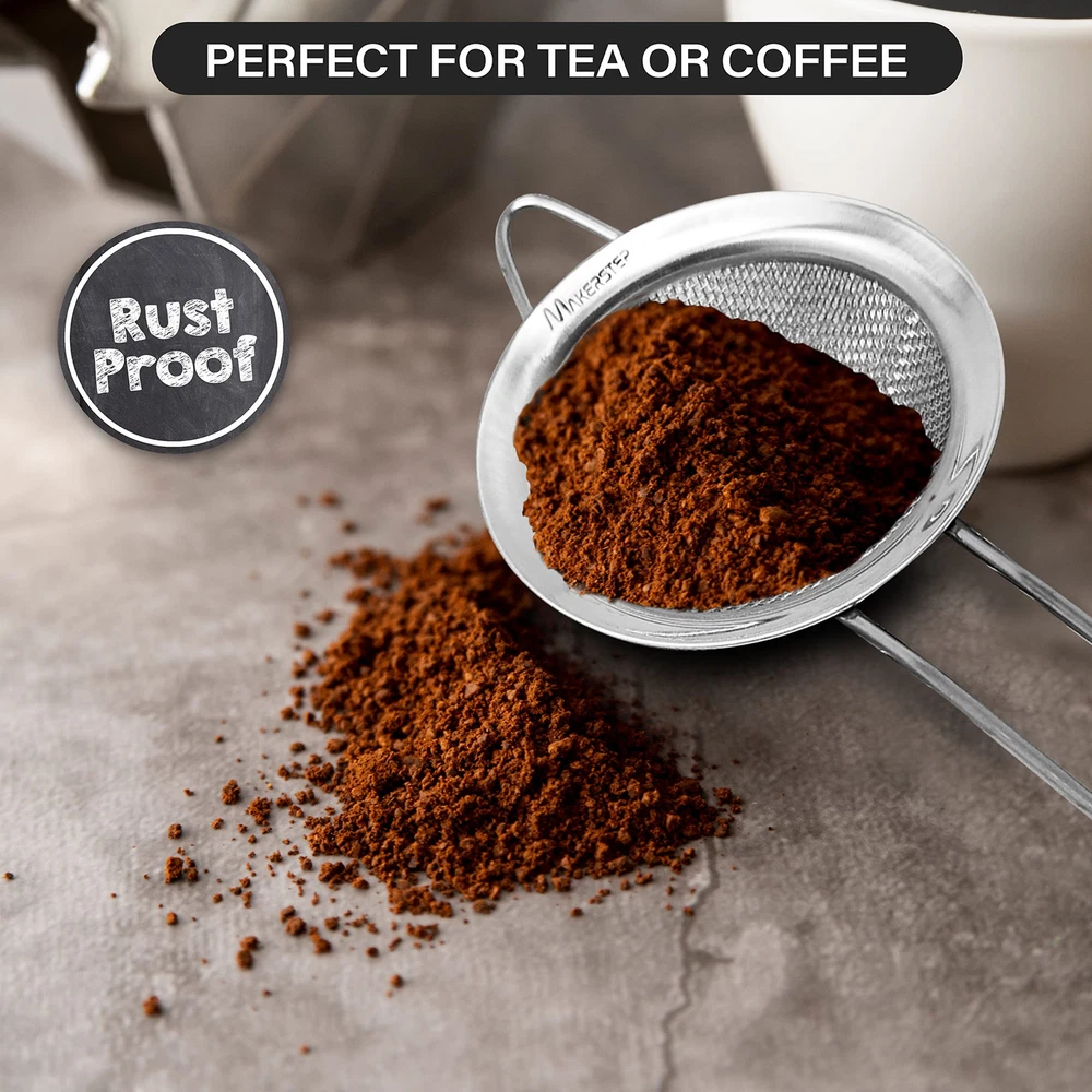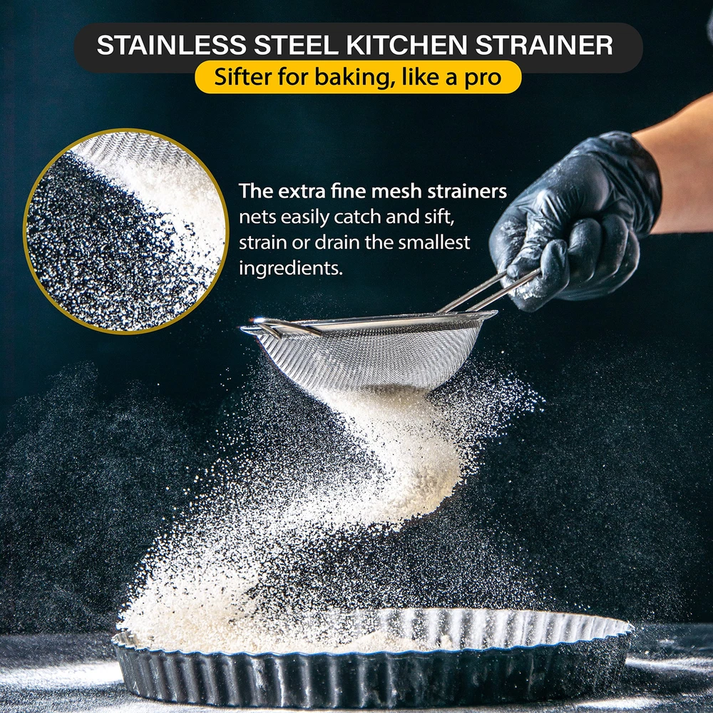 Strainer 3 fine mesh strainers set of the sizes: 3 3/8", 5 1/2", and 7 7/8" strainer. Get these ultimate wire sift sieves to complete your Home and Kitchen Essentials collection High-Quality stainless-steel fine wire that will not rust or corrode. Easy cleaning. Dishwasher safe and can handle boiling liquids when straining pasta or hot vegetables The handles are ergonomic and feel comfortable even for long periods of use Loop for Hanging built-in to the top of each strainer. Hang them for easy access and to free up more space in your kitchen cabinets and drawers. The sieves will always be right where you need them. Ideal for straining flour, sugars, coffee, and other dry items. Also use as sifter for baking Lets you remove impurities for safer use and improved flavor.