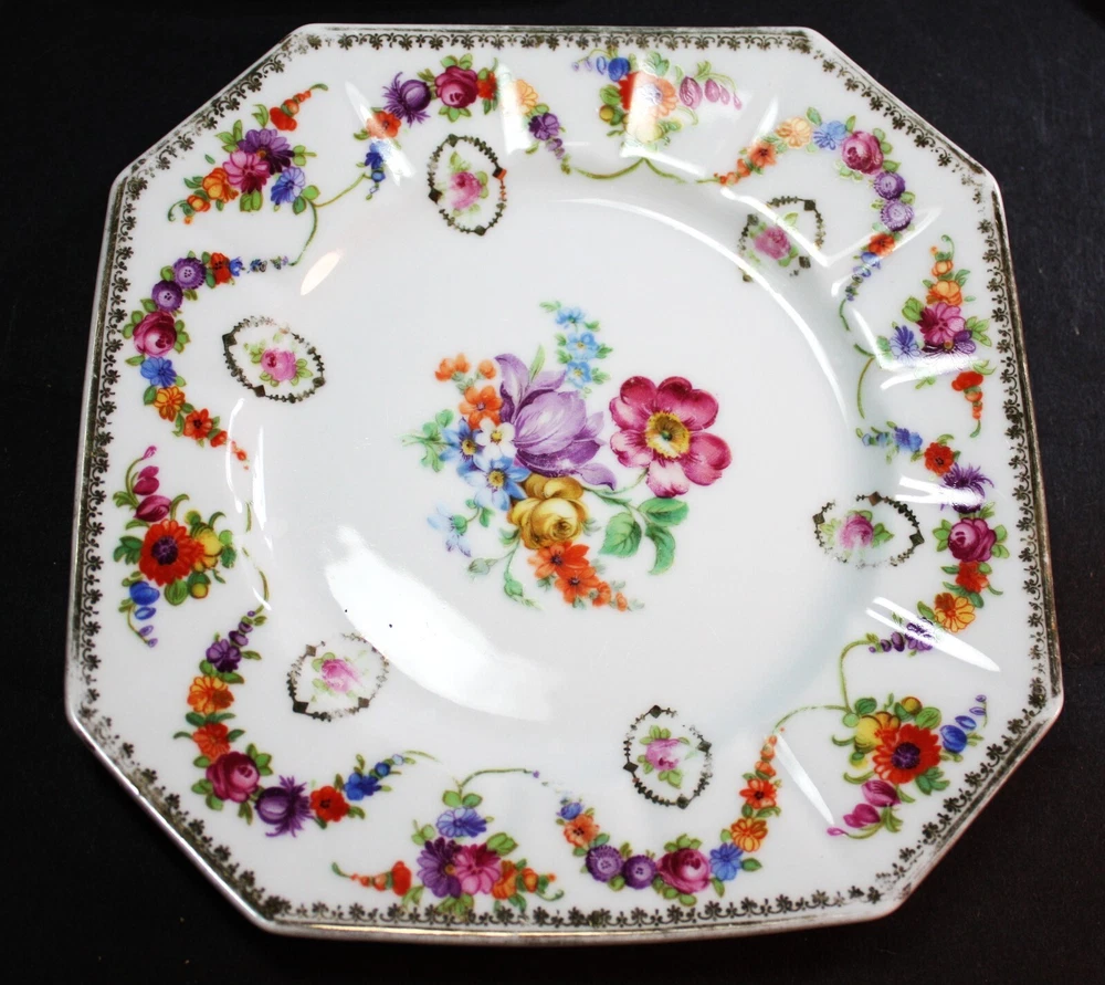 Discover the elegance of early 20th-century art pottery with this set of 4 Schumann Bavaria octagonal salad plates. Each plate showcases the vibrant Orange Tulip pattern, expertly crafted in Dresden, Germany, and features a stunning array of multicolor florals that bring a touch of Victorian charm to any table setting.These 7 1/4 inch porcelain plates are genuine antiques, produced between 1920-1929, and bear the original printed backstamp of Schumann Bavaria. Their decorative style and fine craftsmanship make them ideal for all occasions, requiring only hand washing to maintain their exquisite beauty.