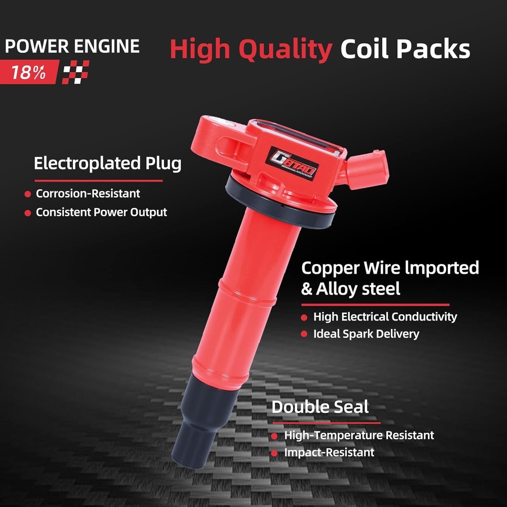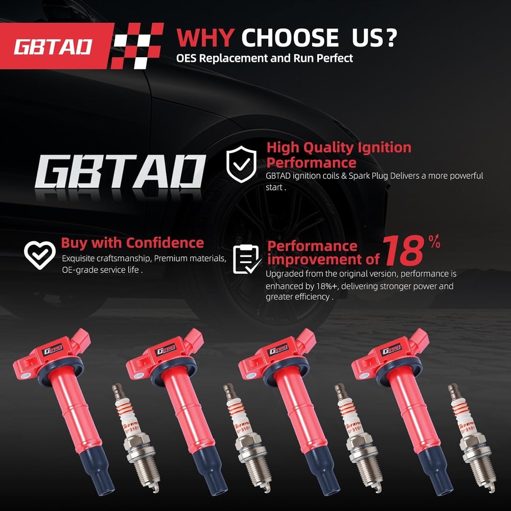 Set of 4 Ignition Coil Pack and Iridium Spark Plug for 2.4L 2002-2009 Toyota Camry Matrix RAV4 Solara Highlander Scion TC xB Lexus HS250h Replaces UF333 UF494 90919-02244 About this item 【 Compatible Vehicle 】Ignition Coil Pack and Spark Plug for Toyota 2002 2003 2004 2005 2006 2007 2008 2009 Camry 2.4 L4 | for Toyota 2001 2002 2003 2004 2005 2006 2007 2008 RAV4 | 2005-2010 Scion tC 2.4 L4 | 2010-2015 Scion xB 2.4 L4 | for Toyota 2002-2006 Solara 2.4 L4 | for Toyota 2001-2007 Highlander 2.4L L4 【 Premium Quality】: Premium-Grade Ignition Excellence. Precision-engineered to deliver OEM-compliant performance with enhanced durability. Aerospace engineering grade copper wires and high-density epoxy resin results GBTAD coils superior conductivity and more safety. 【 Part Number 】Coils:UF494, UF333, C1330, GN10313, 5C1299, 9091902266; Perfect collaboration of GBTAD ignition coils and Spark Plug to optimize engine performance. Easy installation on 2002-2012 Camry Matrix RAV4 Solara Highlander Lexus Scion TC xB Lexus 2.4 liters 4 cylinder. 【 High-Performance 】GBTAD enhanced coils and spark plugs will significantly fix ignition problems like high fuel consumption, misfires, poor power, check engine lights, etc.Enhanced ignition coils and spark plugs offer an 18% performance boost, significantly enhancing engine efficiency.