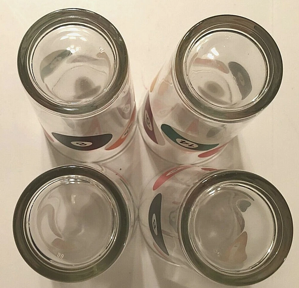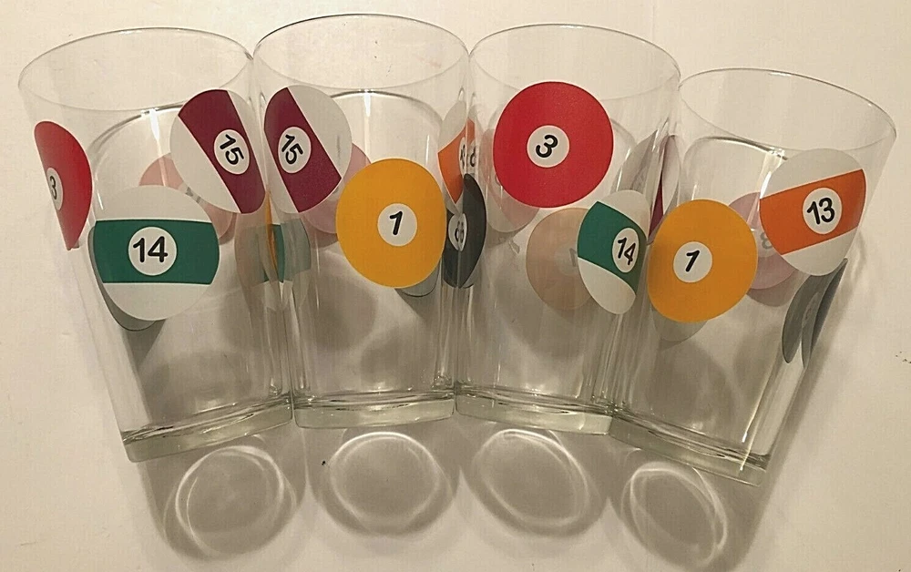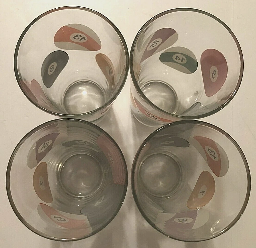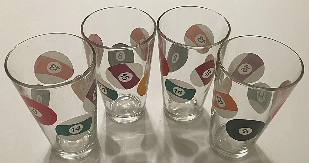 Set of 4 Libbey "Billiard Pool" Highball Drinkware Glass Tumblers 16 oz *Dimensions: 5 3/4" H x 3 3/4" D *Weight: 15 oz. (ea) *Dishwasher Safe *Capacity: 16 oz. *Medium Thickness and Sturdy Condition: Pre-owned. Like new.
