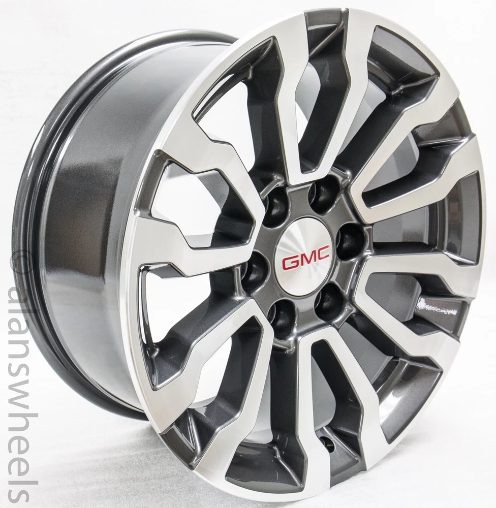 Set of 4 New GMC AT4 Sierra Yukon Denali Replica 18" Wheels Rims 5909 FREE SHIPPING! Email o r call Alan ’ s Wheels in SC with any questions. Reference item # 392904123014 New Set of FOUR (4) Factory Replica GMC Sierra AT4 Charcoal Machined Aluminum 18” Wheels The wheels are brand new in the box. Wheel Diameter: 18" Wheel Width: 8.5" Bolt Pattern: 6x5.5" Offset: 24 Hollander # 5909 Fits the following 6 lug bolt pattern vehicles: Avalanche/Escalade/Denali 1500 - all years Sierra/Silverado 1500 - 1999-2023 2WD & 4WD, 1988-1998 4WD only Yukon /Suburban/Tahoe 1500 - 2000-2023 2WD & 4WD, 1992-1999 4WD only Four GMC center caps are included. Lug nuts are not included. TPMS sensors are not included . If your vehicle has TPMS sensors, you can have them removed and reinstalled into these wheels, or a new set of factory GM TPMS sensors can be installed into these wheels for an additional $120 total for all four ($30 per wheel). My sensors are compatible with 2005-2019 vehicles. Please let me know before you pay if you need the TPMS, so I can adjust the Paypal invoice. We will need the year, make & model of your vehicle to ensure the correct sensors are installed. When you select "Quantity of 1" you will receive FOUR wheels, FOUR center caps with shipping included. Shipping and insurance is free. Shipping to US lower 48 states only. I usually ship within 1-2 business day of purchase date via Fed Ex Ground. Also can be picked up in Greenville, SC. Payment due within 3 days of purchase date. I accept Paypal or I can also accept a credit card payment by phone. Click on the alan'swheels store link and check out my other items. Thanks for looking! _gsrx_vers_1251 (GS 8.2.1 (1251))