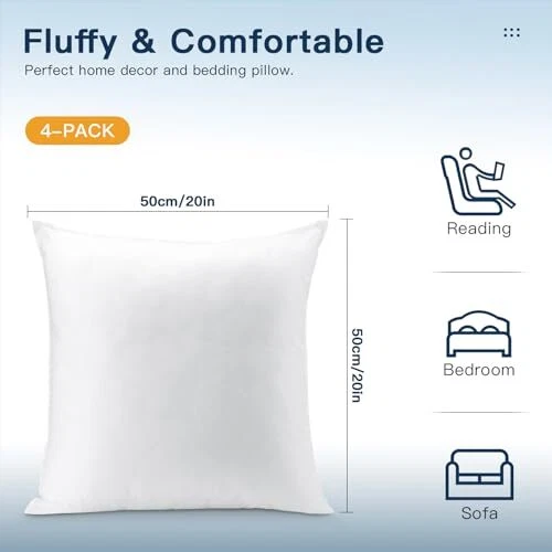 Return Policy Fast Delivery Trusted seller Set of 4 Pillow Inserts 20x20 Inch, Decorative Square Throw Pillow Inserts, Premium Fluffy Pillow Forms Sham Stuffer for Sofa Bed Couch Living Room- Indoor Product Description SIZE: Including four 20x20 Inch/ 50x50 cm pillow inserts. Please allow 1-2cm deviation because of hand-cutting and sewing.(If you prefer a fuller pillow, please choose a pillow insert size larger than the pillow cover.) SOFT BUT SUPPORTIVE: Filled with high-grade 7D polyester, provides extra resilience and comfort. Plump enough for lumbar support. You will feel great to lay your head on or use as a back support in a chair or sofa. COVERS ARE MADE BY NON WOVEN FABRIC WHICH IS MORE BREATHABLE. GOOD MULTIPURPOSE: Easily fluffy up, different sizes of throw pillow inserts provide vary choices for different requests, you could use them at many places, bed, couch, car seats, or chairs. BEST GIFT: This pillow is a great gift for family and friends, Weddings, New years, birthdays, Valentine's day, mother's day, father's day, graduations and more. WARM HINT: The pillow is compressed and vacuum sealed in plastic bag for shipping purpose. For optimal use, if you want it to be more fluffy, please heat it twice in the dryer, and the pillow insert will become very, very full. Shipping Returns Payment Shipping Shipping is FREE to all addresses other than APO/PO boxes in the lower 48 states. All our stock ships from US-based warehouses. Shipped via USPS or UPS (depending on location and package weight) Unless stated otherwise, all orders will ship within 24-72 hours of your payment being processed. Check our feedback to see the great reviews of FAST shipping we offer. Returns Seller does not accept returns Payment We currently accept payment via eBay managed payments only. Once payment is cleared, we will dispatch your shipment within 1-3 business days. Please refer to the "Shipping" tab for more information regarding shipping speed to your destination.