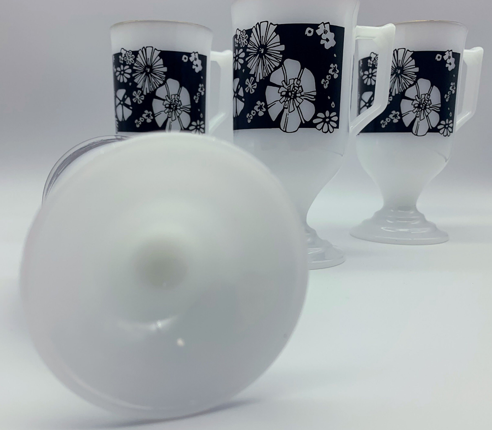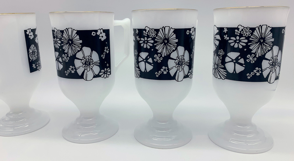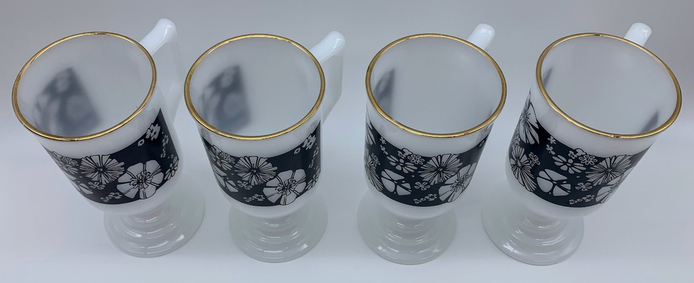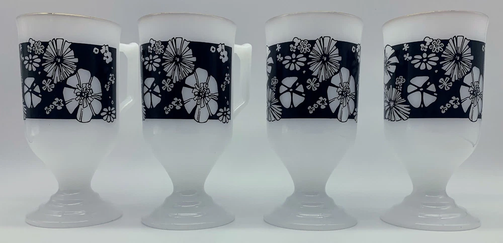 Set of 4 Vintage MCM Footed Milk Glass Handled Mugs Glasses Cups Black White Floral Pattern Hawaiian Midcentury Modern In fantastic condition, if used, it couldn't have been very much! Only some of the gold around the rims are starting to rub off. Please zoom in on photos for a better view of the item's condition. We do our absolute best to research all items we sell. If you ever have questions, please reach out to me! We will always package items securely and with care. Thank you for viewing and please visit our store for more awesome vintage goodies!