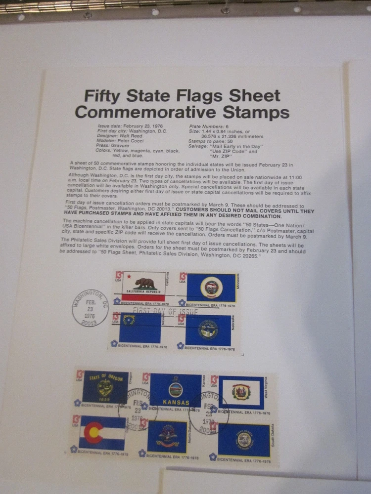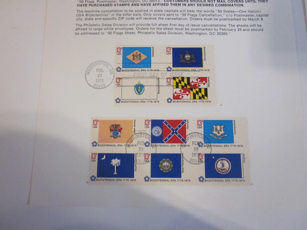 Explore the vibrancy of American heritage with this unique set of 50 State Flags from a 1976 First Day Cover, presented on advertising sheets. Each sheet features 10 colorful flags, capturing the essence of the United States' rich history and culture. These advertising sheets are a great way to display or store your collection, and they make for an eye-catching addition to any postal history collection. The flags are a denominational representation, each bearing the 13-cent stamp, and were issued between 1971 and 1980. Originating from the United States, the items are of used quality, multi-colored, and ungraded. The set celebrates the first day of issue, adding a special touch of nostalgia and authenticity to your collection.