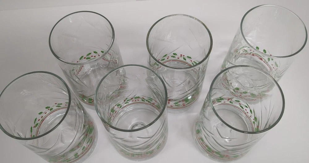 This set of 6 vintage Libbey Christmas flat tumblers features a festive design perfect for the holiday season. Each tumbler is made of clear glass with a red and green holly berry ribbon pattern, adding a touch of holiday cheer to any table setting. With a height of 5 inches, these round-shaped tumblers are ideal for serving drinks during Christmas gatherings. This set is a charming addition to your glassware collection and can accommodate a service for 6, making it perfect for hosting holiday parties or dinners.