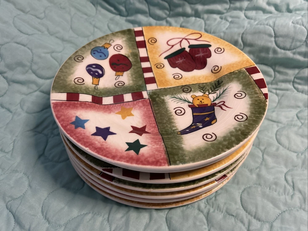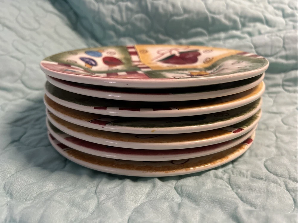 Set of 7 salad plates in very good condition. One plate has a chip on the bottom which is not visible and does not impact usage. No other cracks or chips. Please see attached photos.