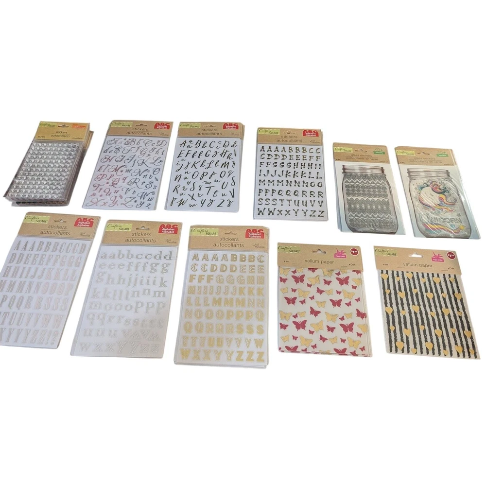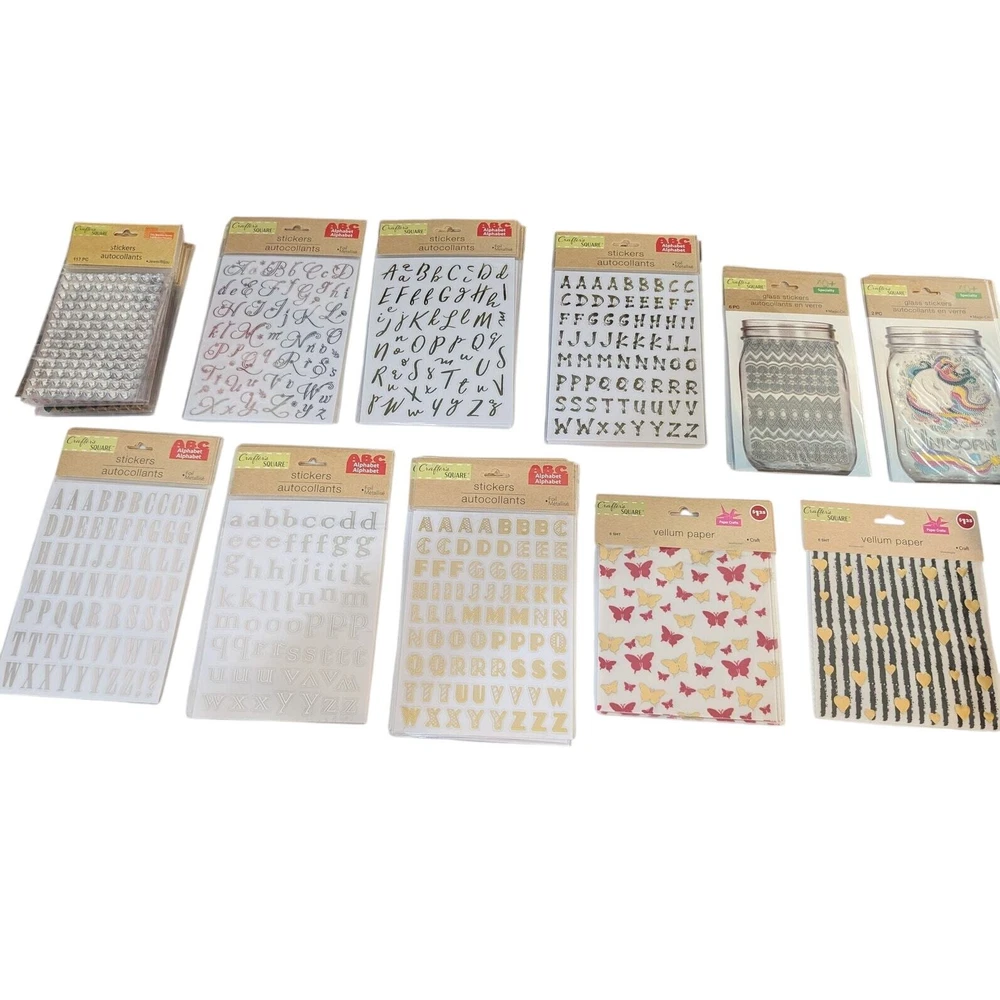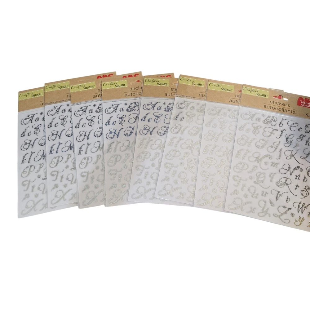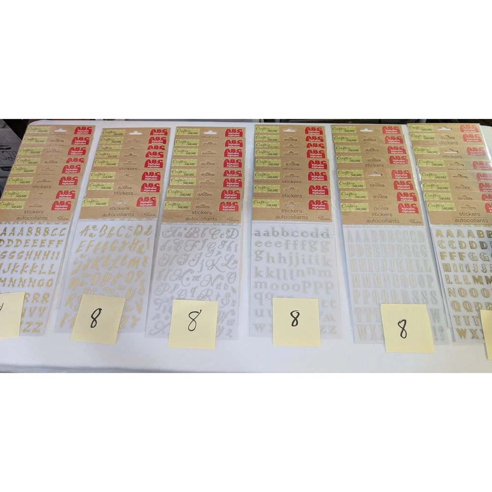 Set of 79 Packs of New Rhinestone Script Alphabet Stickers Set of 79 Packs Crafters Square There is a lot of different styles on the alphabet stickers. (See pics) Over $98.00 ratail for all of them. There is Glass stickers. (See pics) Vellum paper. I am selling all my craft supplies so if you are looking for other things, please let me know. I have alot! If you have any questions about this lot, please let me know as well.