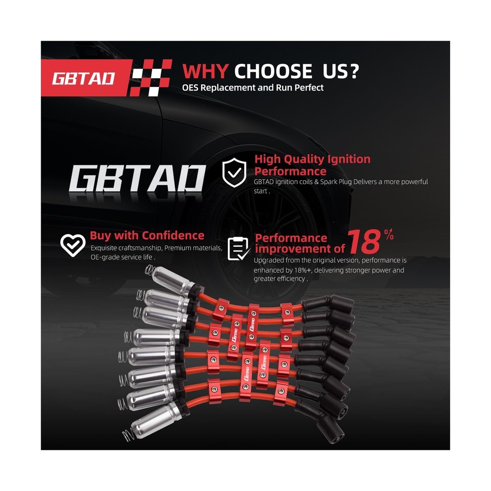Set of 8 Square Ignition Coil Pack and Spark Plug Wires Harness for 5.3 V8 2007 2008 2009 2010 2011 Chevy Silverado 1500 Avalanche Tahoe Suburban GMC Yukon Sierra Coils 5.3L Replaces UF413 Description Features: Compatible Vehicle 1Ignition Coil Pack and Spark Plug and Wires Harness Compatible with Chevy Chevrolet Avalanche Camaro Colorado Corvette Capricec Express 1500 2500 Impala Monte Carlo Silverado 1500 2500HD 3500HD SS SSR Suburban 1500 2500 3500HD Tahoe Trailblazer EXT | Compatible with GMC Canyon Envoy XL XUV Savana 1500 2500 3500 Sierra 1500 2500HD 3500HD Yukon XL 1500 2500 | Compatible with Buick LaCrosse Rainier, Cadillac CTS Cadillac Escalade ESV EXT. Premium Quality: Premium-Grade Ignition Excellence. Precision-engineered to deliver OEM-compliant performance with enhanced durability. Aerospace engineering grade copper wires and high-density epoxy resin results GBTAD coils superior conductivity and more safety. Part Number Coils:UF413, 12570616, D510C, 12611424, 8125706160, C1511, 5C1554, 41962, 748UU; Perfect collaboration of GBTAD ignition coils and Wires Harness to optimize engine performance. Easy installation on 2007 2008 2009 2010 2011 Chevy Silverado Avalanche Tahoe Suburban GMC Sierra Yukon 5.3 liters 8 cylinders. High-Performance GBTAD enhanced coils and spark plugs wire Harness will significantly fix ignition problems like high fuel consumption, misfires, poor power, check engine lights, etc.Enhanced ignition coils and spark plugs offer an 18% performance boost, significantly enhancing engine efficiency. After-Sales ServiceIgnition Coil Pack and Spark Plug and Wires Harness have quality assurance service. If your product has any quality problems, please contact our customer service. Product Details: Brand: GBTAD Vehicle Service Type: Car Item Weight: 3.35 Kilograms Connector Gender: Male Installation Type: Plug In Brand: GBTAD Vehicle Service Type: Car Item Weight: 3.35 Kilograms Connector Gender: Male Installation Type: Plug In Manufacturer: GBTAD Automotive Fit Type: Vehicle Specific Fit OEM Part Number: UF413, 12570616, D510C, 12611424, 8125706160, C1511, 5C1554, 41962, 748UU Ignition Coil Pack Spark Plug Wires Harness Model: Ignition coil UF413 & Spark Plug 41962 & Wires 748UU Item Weight: 7.37 pounds Package Dimensions: 9.69 x 6.97 x 4.69 inches Item model number: UF413 Ignition Coil Spark Plug Wires Exterior: Textured Manufacturer Part Number: STIC460508SP120108STWS440101C120101 Date First Available: October 11, 2022 Delivery We Do Not Ship Outside of the Continental US. Return Policy All items qualify for returns within 30 days of receipt. Buyer is responsible for return shipping on any item that is not damaged. Feedback We take our reputation seriously, we buy and sell online, so we understand the value of trust. If you are unsatisfied with your order, please contact us and we will work with you to resolve it to your satisfaction.