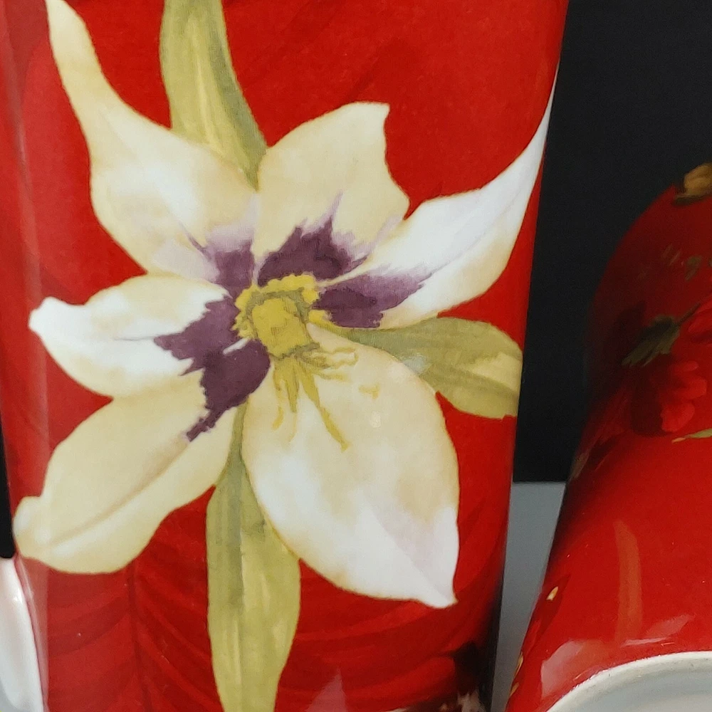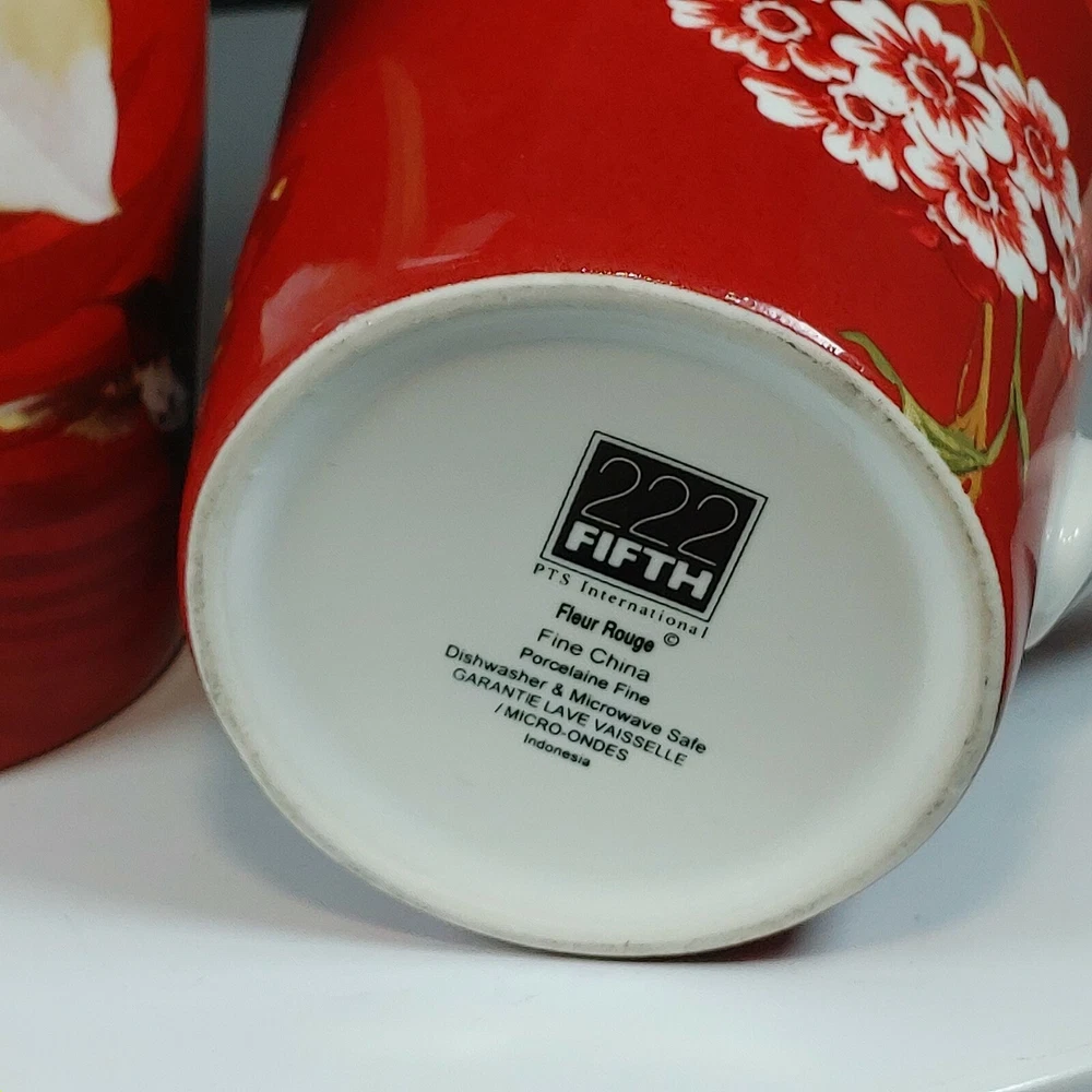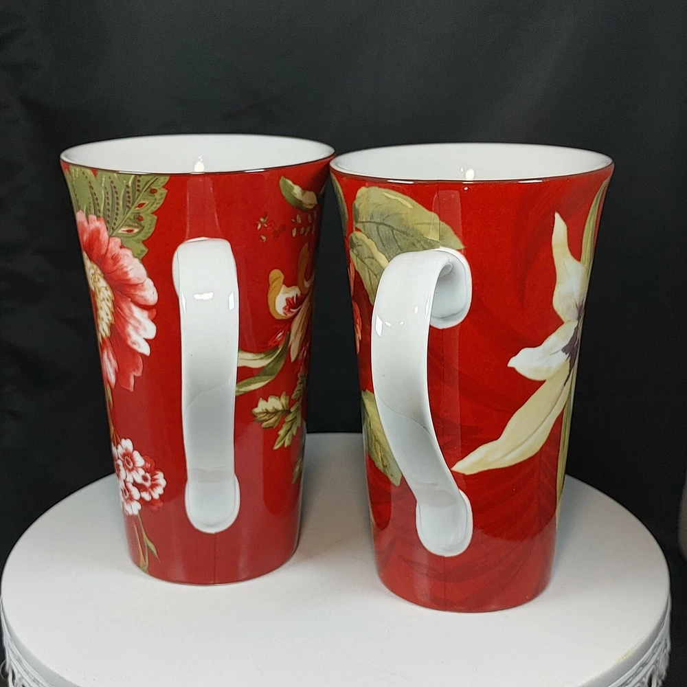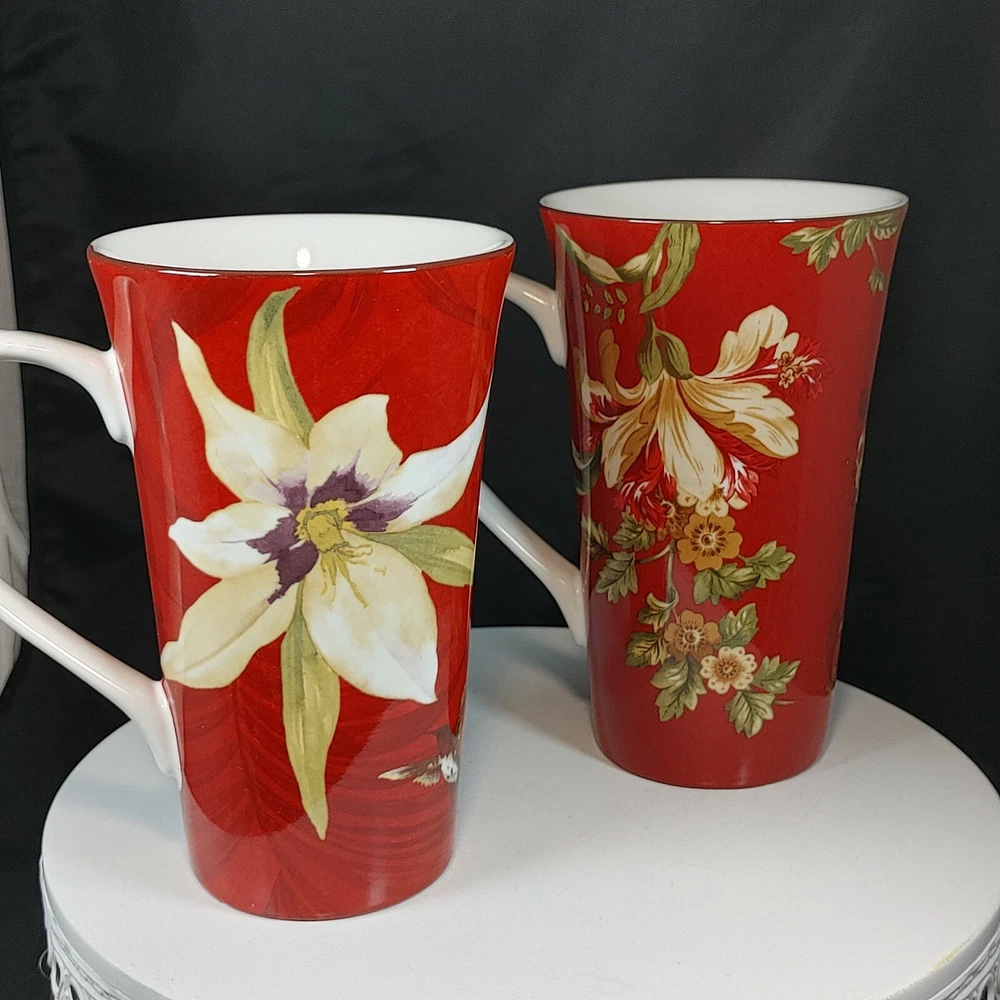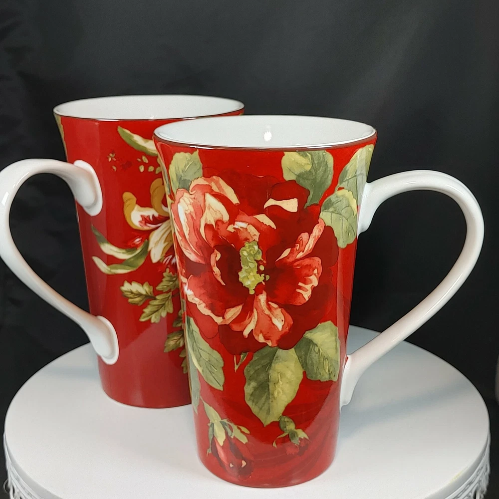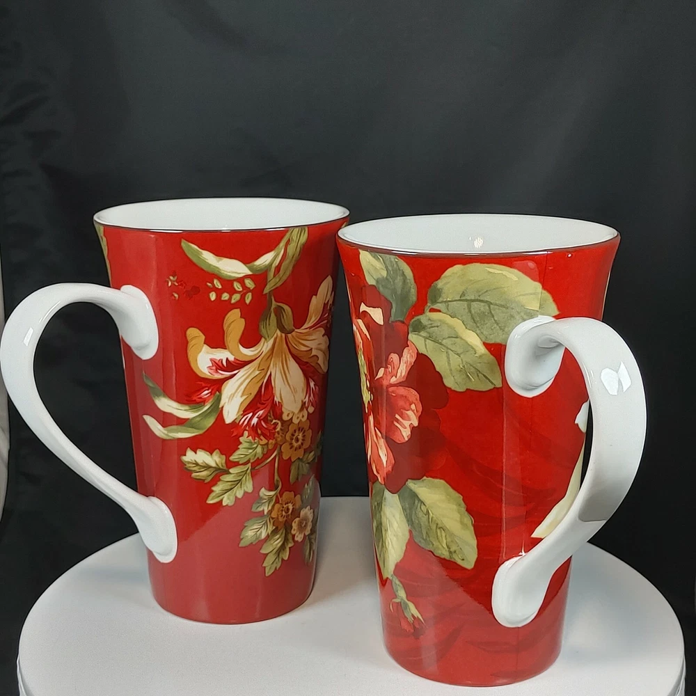 Set of Two Large Coffee Mugs Red Floral 222 Fifth International 16 oz Size Two patterns, Belize and Fleur Rouge. Extra Large mugs, hold appx 16 ounces Like new condition Tall, 6-1/2" Ships FAST from Canada with Tracking Thanks for shopping our store We take extra care in packaging to ensure safe arrival of your item. All parcels are shipped with tracking so that you can monitor the shipment progress and delivery. CDN to USA Currency exchanges upon payment Please Follow Our Store for Updated Weekly Items . ** Have a Great Day!. Happy Holidays! USA buyers save with currency exchange on purchase.We ship UPS, Canada Post and Fedex as postage requires. Thank you for being a valued customer!
