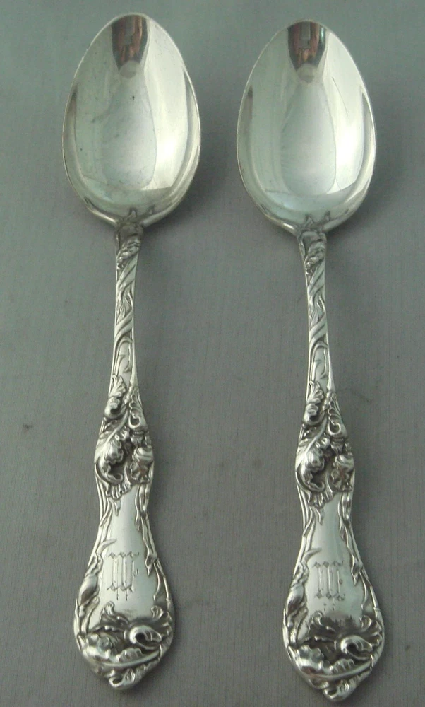 Here is a set of two coffee spoons in the sterling silver pattern Les Cinq Fleurs by Reed and Barton. These pieces are in very good condition and they measure 5 1/4" long each. They are both monogrammed on the front of the handle with a single letter mono as shown. FREE SHIPPING.