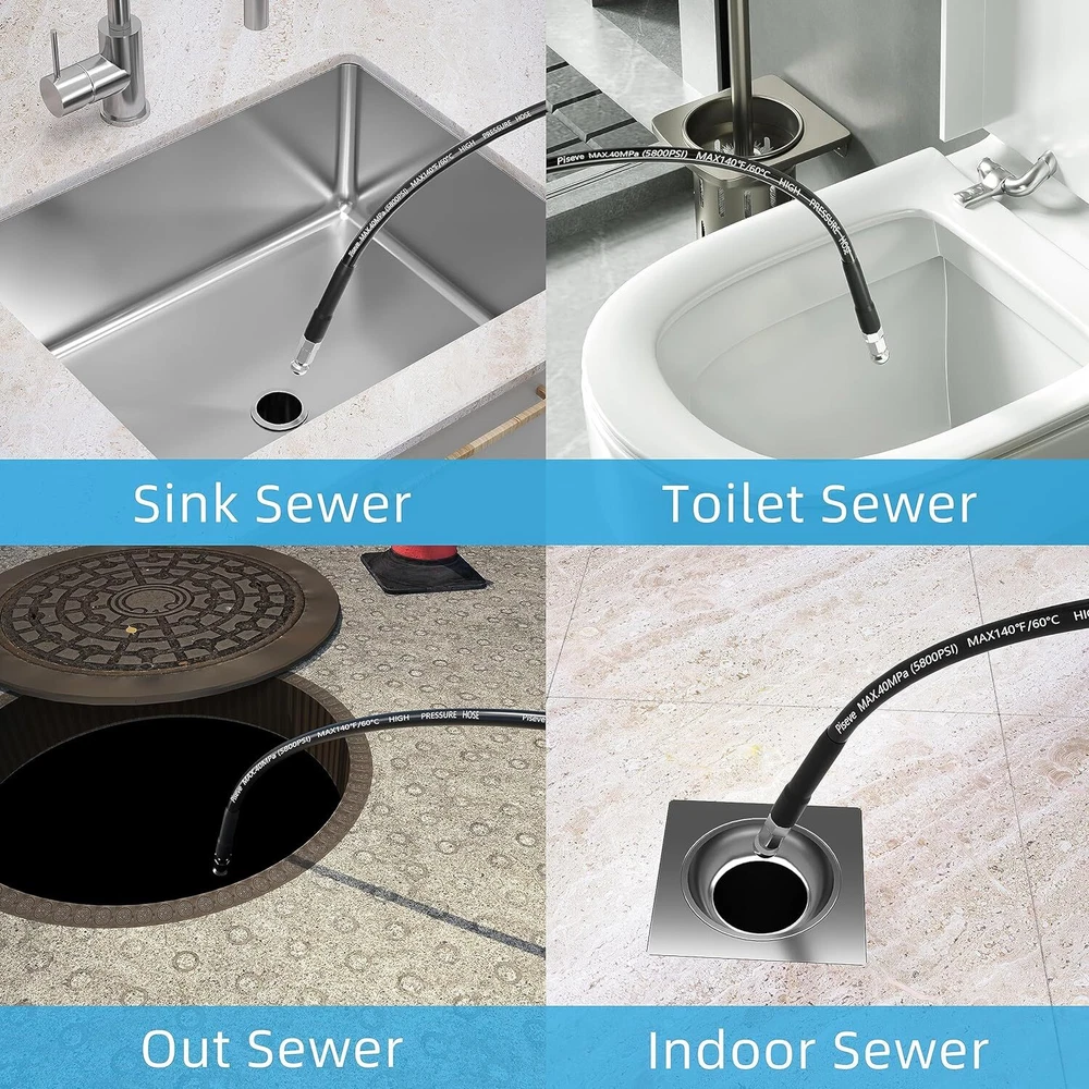 Product Description Sewer Jetter Kit 100FT for Pressure Washer 5800PSI Drain Cleaner Hose With 1/4 Inch Female NPT Button & Nose Rotating Sewer Jet Nozzle Pressure Washer quick connect Set 【Professional Sewer Jetting Kit Includes】 1× sewer jetter hose,1×button nose sewer jet nozzle,1×Mushroom Nose Nozzle,1×Rotating Nozzle,1×M22 female to 1/4’’ female NPT coupler(M22-14),1×1/4’’ quick connect plug(Female),1×1/4’’ quick connect plug(Male),1×waterproof tape, 2×spanners, 1×box of pearl corsage pin,1×instructions manual. 【High Quality 5800PSI Cleaner Hose】 sewer dredge hose are compatible with many air and electric pressure washers up to 5800 PSI.The hose is composed of 4 layers, the first layer is a PVC shell, the second layer is a fiber protection, the third layer is a steel wire braid, and the last layer is a PE inner tube.Therefore, the hose has excellent heat resistance, oil resistance, wear resistance, ozone resistance, pressure resistance, durability, explosion-proof and other characteristics. 【3 Efficient Sewer Jetter Nozzles】The set comes with 3 high efficiency sewer nozzles.Mushroom Nose Nozzle:One 0° rear nozzle can remove the blockage in the corner. Three 33° rear nozzles flush loose debris from the front nozzles.Button Nose Nozzle:One 0° rear nozzle for removing blockages from blocked pipes. Three 33° rear nozzles flush loose debris from the front nozzles. Rotating Nozzle:Three counter-rotating sprayers shoot at the blocked pipe. 【Quick Connect Plug And Female Metric M22-1/4 Inch Female NPT Fitting】Quick Connect Plug used in a lot of situations where high pressure connections are frequently assembled or disassembled.Ideal for quick exchange of pressure washer outlet, sewer jetter hose, guns and nozzles.It makes a solid connection with quick coupler each time.Pressure washer coupler convert metric M22 14mm female NPT thread to 1/4" Female NPT.And we have male and female fittings to make the hose fit more machines. 【Multifunctional Hose Set】High-pressure cleaning hoses can be used to clean cars, motorcycles, floors, Windows, driveways, roofs, siding, sinks, toilets, outdoor, indoor, etc.The piseve sewer spray kit can meet all your needs.We add a variety of common and needed accessories to facilitate your daily use, so the set is ideal for family purchases.Thank you for choosing . During transportation, the outer box may be squeezed, but it will not affect the use of the hose. About Us We are a reputable seller with many years of experience selling on eBay. Our goal is to provide high-quality products and excellent customer service. Shipping Items will be shipped within 1-3 business days when we received payment. (Orders are not processed on weekends & holidays) Tracking information will be sent once item is shipped. Delivery time depends on destination and other factors Item is shipped to ebay address. Leaving correct address can minimize delay. For international shipping and shipping to Guam, Hawaii and Alaska, Please contact us before placing the order. International buyers please note: Import duties, taxes and charges are not included in the item price or shipping charges. These charges are buyer’s responsibility. We will try our best to reduce the risk of the custom duties. Local pick-up is unavailable at the moment. Contact Us We reply any email messages within 1 business / working days(off-duty at weekend). If you do not get a response from us, then please check your junk or spam mailbox. Our Business hours: Mon-Fri 9:00-18:00, UTC/GMT +8 hours. Please contact us either by clicking "contact seller" in the "purchase history" section or simply click "ask a question" at the bottom of this page. If you are unsatisfied with our item or service, please contact us before leaving any feedback. We are committed to resolve all issues in a friendly and satisfactory manner.