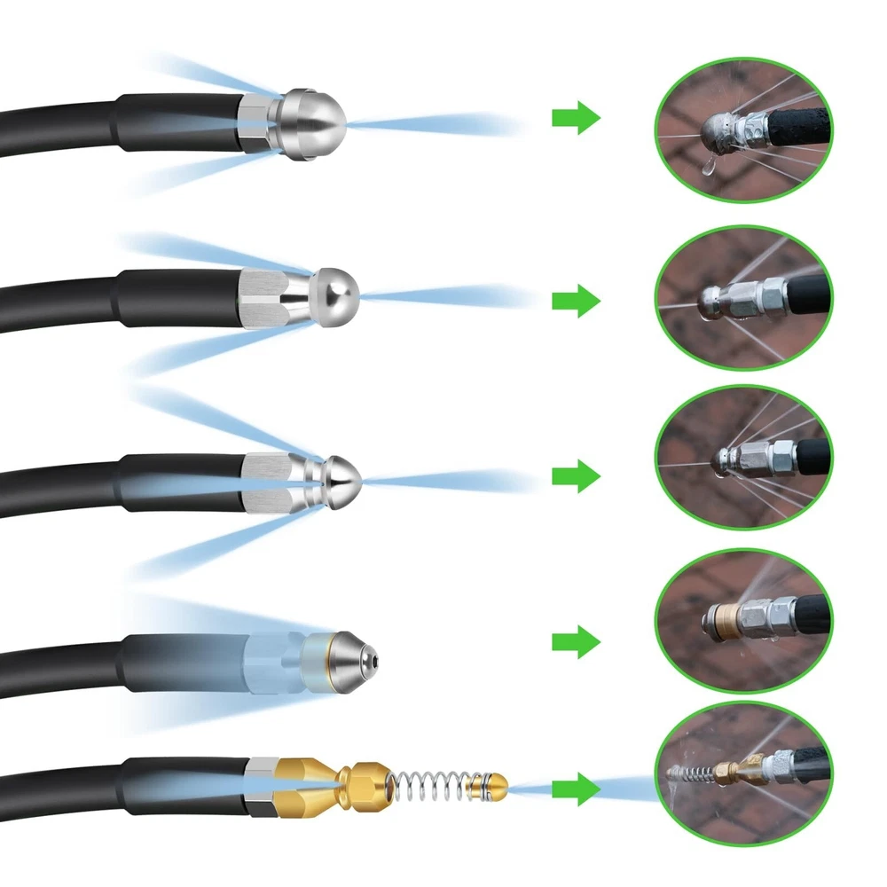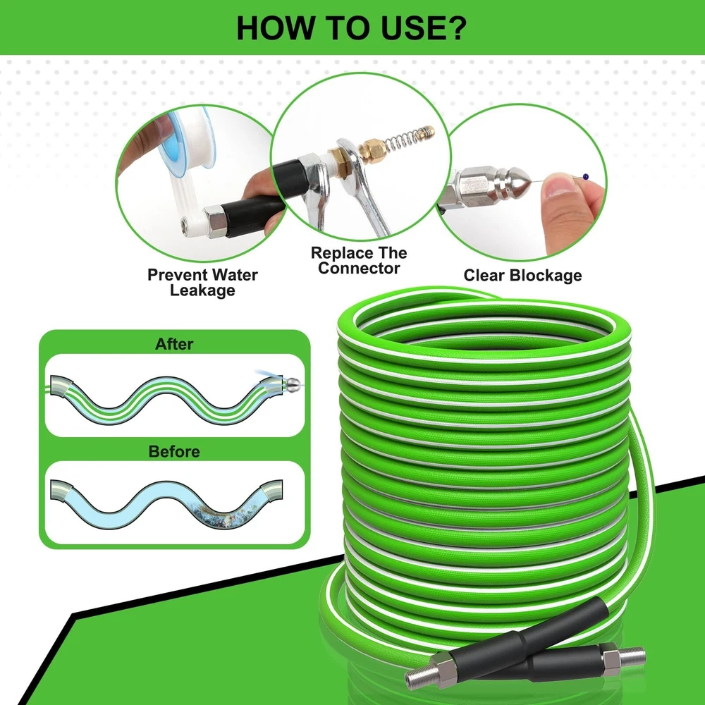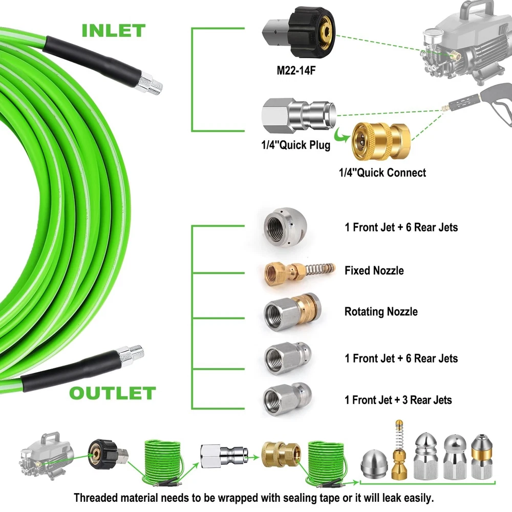 Sewer Jetter Kit for Pressure Washer 100 FT, 5800 PSI Pressure Drain Cleaner Hose for 1/4 Inch NPT Corner, Pressure Washer Cleaning Kit with 5 Pcs Sewer Jetting Nozzle, Pearl Corsage Pin (Green) Product Details Brand: Tayapura Material: Plastic Color: Green-White Item Weight: 3.14 Kilograms Maximum Pressure: 5800 Pound per Square Inch Item Length: 1E+2 Feet Number of Flutes: 5 Manufacturer: Tayapura Brand: Tayapura Material: Plastic Color: Green-White Item Weight: 3.14 Kilograms Maximum Pressure: 5800 Pound per Square Inch Item Length: 1E+2 Feet Number of Flutes: 5 Manufacturer: Tayapura Part Number: Sewer Jetter Kit-100Ft(Green&White) Item Weight: 6.91 pounds Country of Origin: China Item model number: Sewer Jetter Kit-100Ft(Green&White) Power Source: NO Batteries Included?: No Batteries Required?: No Date First Available: March 7, 2024 SEWER JETTER KIT: Includes all the accessories you need. It comes with 1 x 100 ft sewer jetter hose (green with white line), 1 x M22-14 NPT coupler, 1 x 1/4'' quick connect, 1 x 1/4'' plug, 5 x sewer nozzles,1 x pearl corsage pin and 2 x spanners THICKER CLEANER HOSE with EXCELLENT MATERIAL: The outer layer of the upgraded hose is made of thicker material, which can delay aging and increase wear resistance. The reinforcing layer is a chemically bonded 1/4 " high-tenacity polyester fabric WORKING PRESSURE with 5800 PSI: With working pressure up to 5800 PSI and temperatures up to 40F/+140F, blockages can be easily cleared QUICK CONNECT: Both ends of the hose are equipped with a 1/4" M-NPT quick connect, which is suitable for assembling and disassembling high-pressure fitting. Sewer jet hoses can be connected to the pressure washer machine by M22-14F to a 1/4'' connector DIFFERENT SEWER JETTER NOZZLES: More powerful and unique nozzle design, suitable for general water pipe cleaning, for sewer clogging to provide better results GREAT NOZZLES: The fixed nozzle is used to dredge the sewer pipe that needs to be turned; Rotating sewer jet nozzle can provide debris flushing; 1 front jet and 6 rear jet designs can clean and unclog drains laterally, remove clogs in corners WIDELY USED: Our sewer jetter kit can be widely used to clean indoor & outdoor sewers, such as sinks, toilets, drains, etc. It can also be used to clean cars, floors, driveways or roofs. Tape can help prevent leaks, pearl pin can clean the clogged nozzle