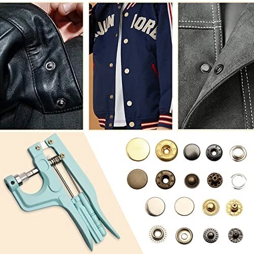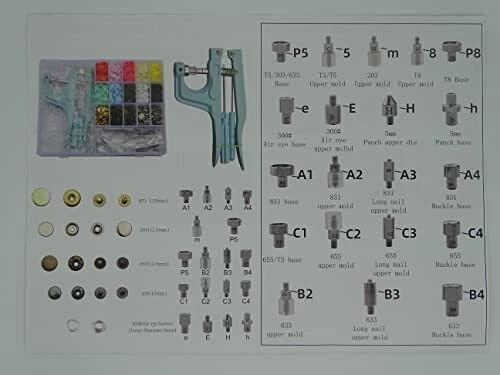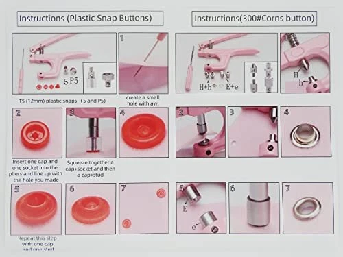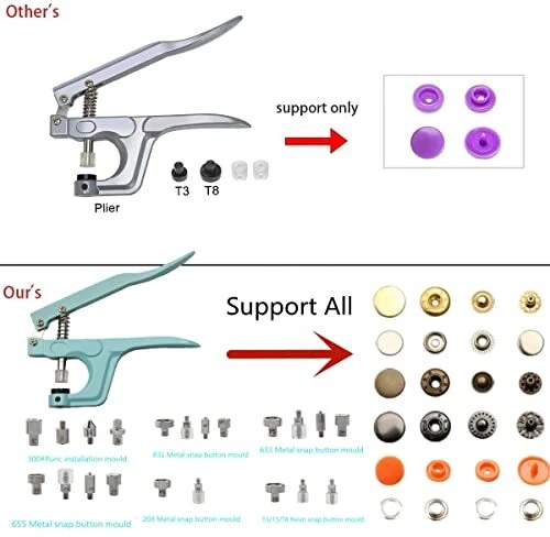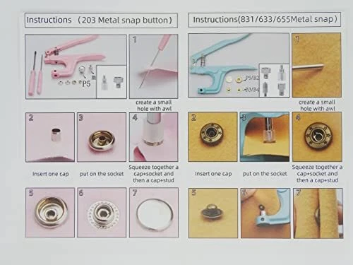 About Snap Pliers Set: - Pliers can be used with T3, T5, T8 Buttons and 831(15mm)203(2.5mm)633(12.5mm)655(10mm) 300# Air eye button - Awl to poke holes in your fabric for easier snap placement How to Install plastic snaps with the press pliers: - 1. For each snap, you will need two caps, one socket and one stud . - 2. Make sure your pliers match the size of the snaps you plan to fasten (T5 was install into the snap pliers set). - 3. Choose your spot to install the snap and stick your awl into your fabric to create a small hole . - 4. Insert one cap and one socket into the pliers and line up with the hole you made with your awl . Repeat this step with one cap and one stud where you plan to install the other side of your snap . - 5. Squeeze together a cap+socket AND THEN a cap+stud . - 6. Once you have each side of your snap installed, the socket and stud will click together! If either side feels loose,simply set the one side of the snap in the pliers again and squeeze . Package Includes: - 10 colors plastic snaps, each 15sets ( size T5 12mm) - 10 copper eyelets -40 sets metal snaps. Each 10 set (size: 12 10mm) - 1 x Snap Press Pliers - 1 x Screwdriver - 1 x Awl Multifunctional Tool & Widely Used: Snaps and snap pliers set is suitable T3 T5 T8 Plastic Button, marine-grade snap(Other tools can not), and plastic snaps. Can be used for fastening, replacing metal snaps, repairing boat covers, canvas, sewing, tarp, outdoor tablecloth, and so on. The reasonable tool kit is enough for meeting your different needs in clothes/leather/bag/belt/hat/ pet clothes/crafts DIY. Heavy-Duty Snap Tool: Heavy-duty snaps pliers use on METAL and PLASTIC button snaps. This complete snaps fastener kit included 6 sets of components, which are sufficient for most snap-fit installations. Could use on metal snap buttons #655(10mm)#633(12.5mm)#203(12.5mm)#831(15mm)#300 Air eye button and for T3 T5 T8 plastic resin snap button. Various Snap Buttons:10 rainbow colors plastic snaps which 10 set each colors. and 40 sets metal buttons:10 sets golden (#831 15mm) 10 sets sliver (#203 12.5mm),10 sets copper (#633 12.5mm),10 sets black(#655 10mm), and 20sets 300# air eye buttons.Intotal 160sets buttons. What Will You Get: You can get a set of sewing snaps fasteners kit with press pliers installment tool, including 100 sets 10 color plastic snap buttons; every 10 sets of 4 colors metal snap buttons; 20 sets air eye buttons, 1Pcs 6.4In snap pliers; 1Pc 5In fader; 1Pc 5.3In Screwdriver; each of T3/T5/T8 base and press head; 6 sets of components. There are many styles and quantities of this package and can meet 99% of your daily sewing and handicraft needs. Different from tool sets on the market that can only be used for plastic buttons.our pliers set come with T3 T5 T8 metal base ,could heavy-duty aluminum alloy snap tool could work on metal snap.