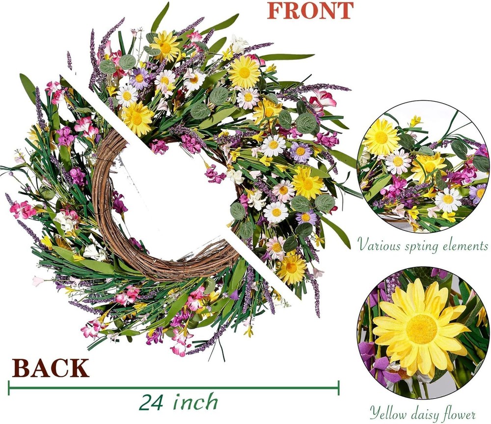 Sggvecsy Daisy and Lavender Wreath 22’’ Wildflower Spring Summer Artificial Silk Wreath for Front Door Home Wall Wedding Festival Farmhouse Holiday Decor Item Description About this item HIGH QUALITY WREATH: This artificial spring wreath is made of premium plastic. The base is durable natural grapevine full of colorful daisy, lavender, jasmine, orchids, dancing lady, clusters of big green berries, red pip berries and other wild flowers. The entirely realistic wreath has bright color and vibrant looking. PROPER SIZE: 24 inches after fluffing. Since the wreath is packed in a relatively small box to satisfy transportation requirement, you need to expand the branches and adjust flowers into best shape and you'll get a 24 inch full wreath of enough size. VERSATILE DECOR:This colorful floral wreath is suitable for front door, wall, indoors,outdoors,window,fireplace,farmhouse, living room, porch, centerpiece party, wedding, holiday and festival celebration. It will provide your home a feeling of natural and vatality. EASY CLEAN: The handmade wreath is convenient to clean, just wipe it with a try towel to make the wreath like brand new. The green leaves and branches are not easily falling apart. This wreath can be used for a long time. NOTES: If used outdoors, please make sure to hang it under the cover to avoid rain and snow. Please don’t hesitate to contact us if you have any questions, we will try our best to help you! › See more product details *Materials: high quality silk, foam and natural grapevine *Package Included: 1×artificial spring wreath in a box *Application: front door, window, indoors, outdoors, window, fireplace, farmhouse, living room, porch, centerpiece party, wedding, holiday and festival celebration *This artificial spring wreath has a longer lifetime compared to the real one, the shape and color will stay fresh even a few years later, no need to water or sunlight. *This handmade wreath can be used as a gift for holiday decoration, festival gift, wedding,anniversary and christmas day etc. *This colorful floral wreath has special design, made of plastic with purely manual process. The appearance of the wreath is very natural, just like the real one. *If used outdoors, please make sure to hang it under the cover to avoid rain and snow. Sggvecsy is an online home & kitchen brand passionated about providing our clients with the high quality products and inspiring them with the design trends. You will find artificial flowers, artificial plants and artificial wreath in MAFRY HOUSE. Our hand-made crafts can bring the realistic feeling for home decoration, Wedding, garden, offices, galleries,shopping malls, hotels, store, apartments, restaurants,etc. We hopes that our products could make your life better. The spring/summer wreath can be hanging anywhere according to your need to decorate your space. They can bring natural and realistic feeling to your home and they will stay fresh and realistic appearrance no need extra care all year round. The front door decoration is very important for people, a good front door decoration can sporce up your house and draw other’s attention. This virant artificial flower wreath can bring your house a special feeling and add beauty. This artificial yellow daisy wreath is suitable for porch, hallway, attic, stairway and the cornor. It can adds color and bring vivid looking to your space belong yourself. Just need to easily hanging it on the wall, your porch will totally different from previous time. This fake silk floral wreath size is very large, you have better to find a wide place to hang it. The wreath is fully handmade, therefore the outside looking is really realistic just like the real one. It will be a good choice if you hang it on the window. The wreath may be squeezed during transportation. The size is actually measured after fluffing, they will reach the size as described. Please shape it according to our picture instruction before hanging. Due to fully hand-made, it is normal if some petals or leaves fall off, it does not affect the overall image of the wreath. You can use the glue and manually stick the flower to the original place. All of our picture are actual shooted, we try our best to revert the real color for customer. Due to the shooting light and screen display, slightly color differences may exist. Payment We accept payment only through PAYPAL Shipping We ship products worldwide through standard express courier service, it will reach within 7 to 10 days to abroad buyers, we ship the product after recieved clear payment and give full information about shipment to the buyer Return We accept product return within 7 to 21 days from delivery date but product should be in original position and not in damaged condition,the return shipping charges will be buyer responsibility
