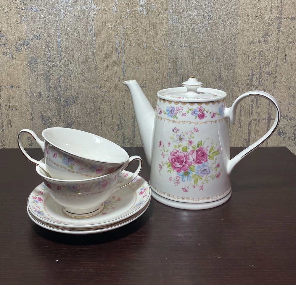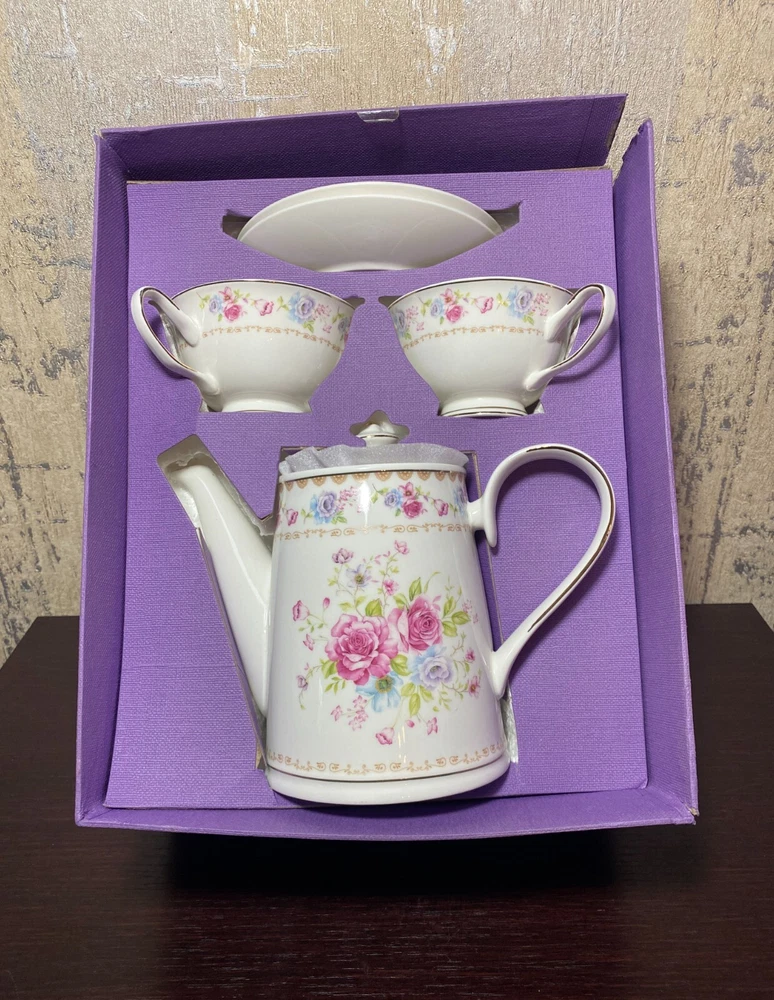 Shabby Chic Tea Ware 5 Piece Boxed Set Roses, Floral Pattern Crafted from high-quality porcelain materials, includes a teapot, two cups and saucers.
