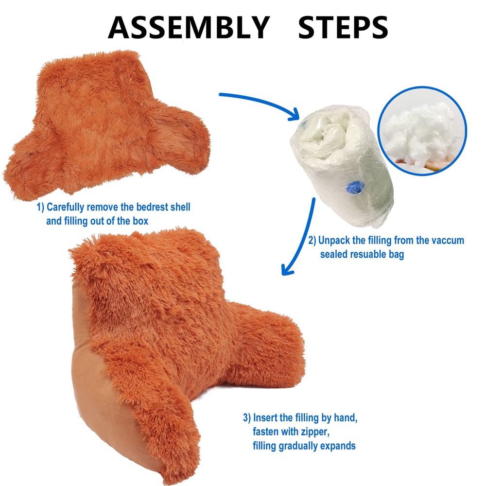 Well Crafted: Shell is made of 100% Polyester Knitted Fabric and Filling is made of 100% Polyester Fiber Size: Each bedrest measures 20 in x 18 in x 17 in and is offered in solid colors. The size of these bed rest loungers creates the great back support for almost anyone. You will find yourself changing positions less frequently since you will remain comfortable for longer periods of time, leaving you refreshed. You’ll see, these bed rest loungers are a bed sent Fun Idea: Put a smile on your loved ones faces by sending a Shaggy Faux Fur Bed Rest. Take delight in the DIY filling that is packaged in a vacuum sealed, space-saving reusable bag. Bed rest shell is included in the box, ready to be filled. Easy fill directions create a fun DIY atmosphere and allow you to take pride in your new home addition Relax In Comfort:Support your neck, back, and arms in comfort with a Shaggy Faux Fur Bed Rest. Enjoy your bed rest while watching TV, reading, or relaxing on your bed or couch. They make a great addition to family rooms and kid’s rooms and are easily transported from room to room with the sturdy handle. Sit back, close your eyes, and take pleasure in the support these bed rests provide Easy Care: Keeping your bed rest like new is just as easy as the DIY filling. Just remove the filling, and machine wash the shell Only. Machine wash separately, using cold water on a gentle cycle. Tumble dry on the lowest heat setting to avoid heat damage. Remove shell from dryer and re-stuff with filling, fluff, and re-use