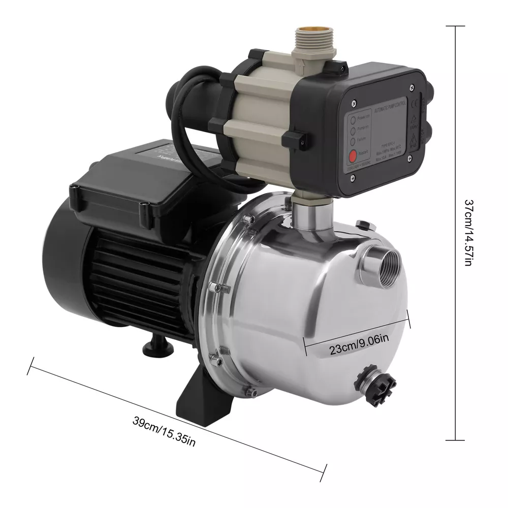 Shallow Well Pump Portable Garden Jet Pump w/ Auto Controller 1.5 HP 1200 GPH Shallow Well Pump Portable Garden Jet Pump w/ Auto Controller 1.5 HP 1200 GPH Description If you are looking for efficient and simple irrigation methods, take a look at our shallow well pump. Made of high-quality material, this pump provides quality assurance for your long-term use. Max 1100w power, 3420 rpm, and max.157.48ft lift make your work easier and more efficient. We believe it will be your assistant in agricultural production, breeding, or other work. Key Features Build to Last : The pump is made of high-quality cast iron, silicon steel, aluminum, stainless steel, and plastic, and adopts painting and polishing processes making it solid, and not prone to rust and corrosion, so it can keep beautiful and practical for a long time. High Efficiency: The 1100W pure copper motor, 3420rpm speed, 1200GPH maximum flow rate, 26.2 ft maximum suction, 87 psi maximum pressure, and tight bearing make your pumping and watering work faster and easier with less noise(30-50db). Large Delivery Lift: The maximum lift of the pump is 157.48ft, which allows you to irrigate farmland, fish ponds, and orchards for a long distance, saving the time and cost of manual transportation. Safety Guard: It has built-in thermal, IP44 waterproof level, overload protection, and is equipped with uniform heat dissipation holes and a fan, which can timely reduce the temperature during operation, and reduce potential safety hazards, thus extending the service life of the product. Protective Package: Our product is packaged with foam and air column bag to maximize protection from damage during shipping. Easy to Use: With a smart controller and an instruction manual, you just need to follow the steps in the manual to pump, sprinkle, etc. Customer Service: We aim to provide quality products and services. If you have any problems, please feel free to contact us. We will reply and solve the problem for you as soon as possible. Details Standard Water Inlet and Outlet: The pump adopts an NPT 1-inch large diameter water inlet and outlet, which can be matched with different types of water pipes and is very practical. Sealing Ring: The silicone sealing ring is used to avoid water leakage and reduce waste. Support Block: The support block at the bottom better maintains the stability of the product and ensures smoother operation. Drain Port: It can discharge the water in the pump body and improve the durability of the pump body. Application The pump can be widely used for long-distance water conveyance in farmland, large-area sprinkler irrigation in gardens, fire water, fish pond aquaculture, water exchange in swimming pools, water bed filling, water heater flushing, drainage in flood areas, etc. It is a practical tool for homeowners, RV owners, rowers, ranchers, and campers. It can be used as a sprinkler pump, well pump, or booster pump and can pressurize your home for solar, washing machine, water heater, tap water, shower, etc. Specifications Material: Cast Iron, Silicon Steel, Aluminum, Stainless Steel, and Plastic Color: Black Process: Painting and Polishing Motor: Pure Copper Motor Assembly Required: Yes Mounting Type: Floor Standing Plug Type: US Standard Number of Pieces: 1 Type: JS-110 Controller Type: EPC-1 IP Level: IP44 Waterproof Lever: IPX4 Capacitance: 35μF Controller Voltage: 220-240V, 50-60Hz Controller Fuse: 10A Max. Mpa: 1Mpa Max Temperature: 60°C/140°F Standard Voltage: 110V, 60Hz Maximum Voltage: 115V Input: 7.0A Power: 1100W(1.5hp) Rotating Speed: 3420rpm Water Pump Inlet: 1in Water Pump Outlet: 1in Max Sprinkler Volume: 3.4m³/h/898.18Gal/h Noise: 30-50db Maximum Delivery Lift: 48m/157.48ft Maximum Pressure: 87 psi Maximum Suction: About 8m/26.2 ft Maximum Flow Rate: 1200 GPH Gross Weight: 9.3kg/20.5lbs Package Size: 57*22*28cm/22.44*8.66*11.02inch Product Size: 39*23*37cm/15.35*9.06*14.57inch Package Included 1* Shallow Well Pump 1* Controller 1* English Manual Other Accessories for Installation Notes Please note that 115V refers to the standard voltage of 110V and up to 115V. Adding water to the pump head until it is full helps to speed up the inlet flow rate. The inlet pipe(Not Included) shall not be excessively bent and the end pipe (not included)shall be completely submerged. Please note that it is only suitable for clean water. Please read the operating manual completely before use, and pay particular attention to the safety instructions included. Please discharge the waste water if not used frequently and please do not run the pump without water. Please do not wet the motor before first use, and fill the pump head with water to wet the impeller. Please perform a water test after the installation is complete to check for leaks and other conditions. Please make sure that the air inlet joint or pipe is completely sealed and air-tight, and that hose used for the water inlet pipe is not sucked and deflated. Check the coupling to see if the internal drive is damaged. Please allow the slight color difference caused by the shooting light and 1-3cm error due to manual measurement, and make sure you do not mind before ordering. Payment Delivery details Terms of sales About us Contact us Payment We accept ebay payment 。 Fees such as import duties, taxes are not included in the item price or shipping costs. These charges are the buyer's responsibility. Delivery details Shipping: 2-9 working days to: USA Terms of sales We maintain high standards of excellence and strive for hundred percent customer satisfaction. Feedback is very important to us. We hope that you contact us immediately before you give neutral or negative feedback, so that we can address your concerns. It is impossible to address issues if we do not know about them! About us Your satis faction is our ultimate goal. We work hard to earn your trust and future business. Our certified technicians have tested each item before shipping. The unit comes with 1 year limited warr