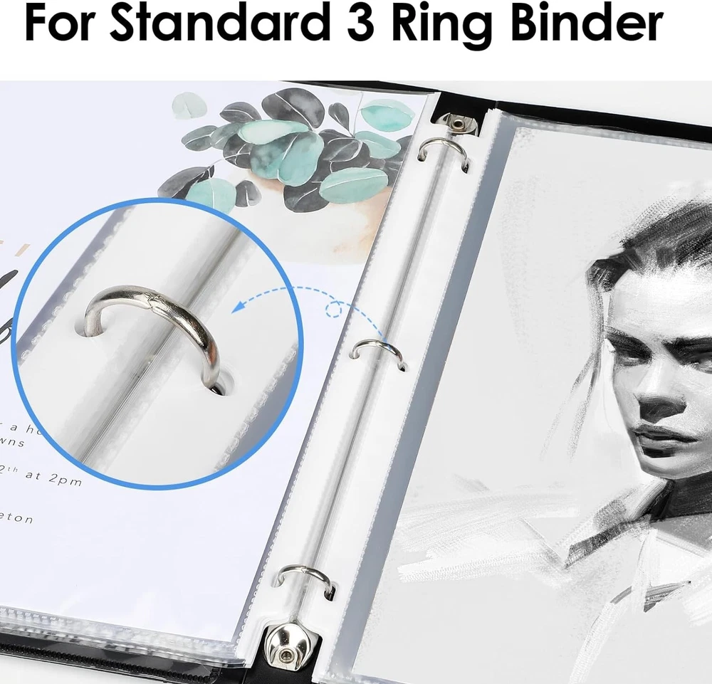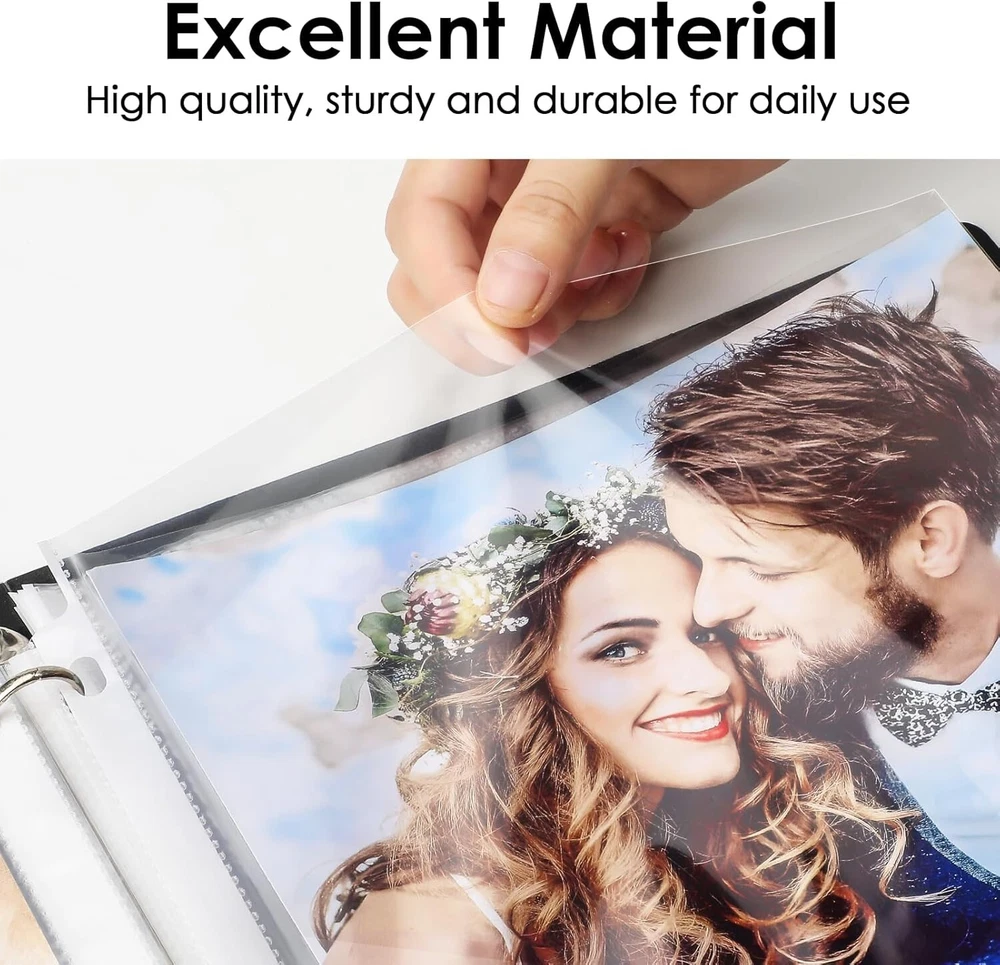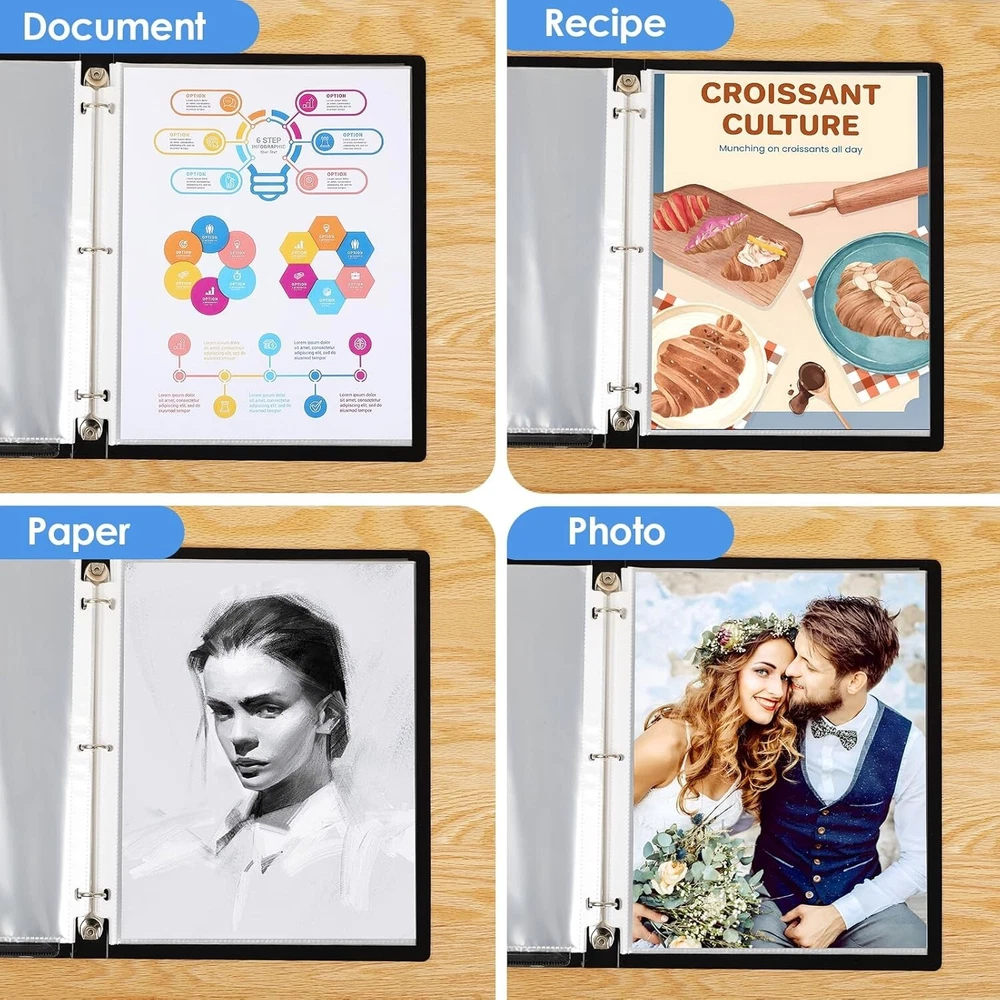 Sheet Protectors x 11 inch Clear Page Protectors for 3 Ring Binder, Plastic Sleeves for Binders, Top Loading Paper Protector Letter Size, 450 Pack Document Protection: Each x inch paper protector can hold x 11 inch letter size paper, 450 pack. 2 sheets of paper can be placed in one pocket. Easy Access Top Loading: Page protectors are for easy top loading, the sleeves are nonstick. Your document is easy to put in the take out, and it is writable for daily use, great for your office and school supplies. Crystal Clear Visibility: The 3 hole sheet protectors are super clear for you to read the document words and images. And Also provide good visibility. The document and photo will not fade, you can store them for a long time. Durable and Sturdy: Made of premium quality polypropylene, PVC free, reinforced edges, fit for standard 3 ring binder. No tear or damage over time. We provide good customer service, any quality issues, please feel free to contact me. Versatile and Practical: The paper protector is ideal for keeping and organizing recipes, photos, important documents, certificates, and music sheets.