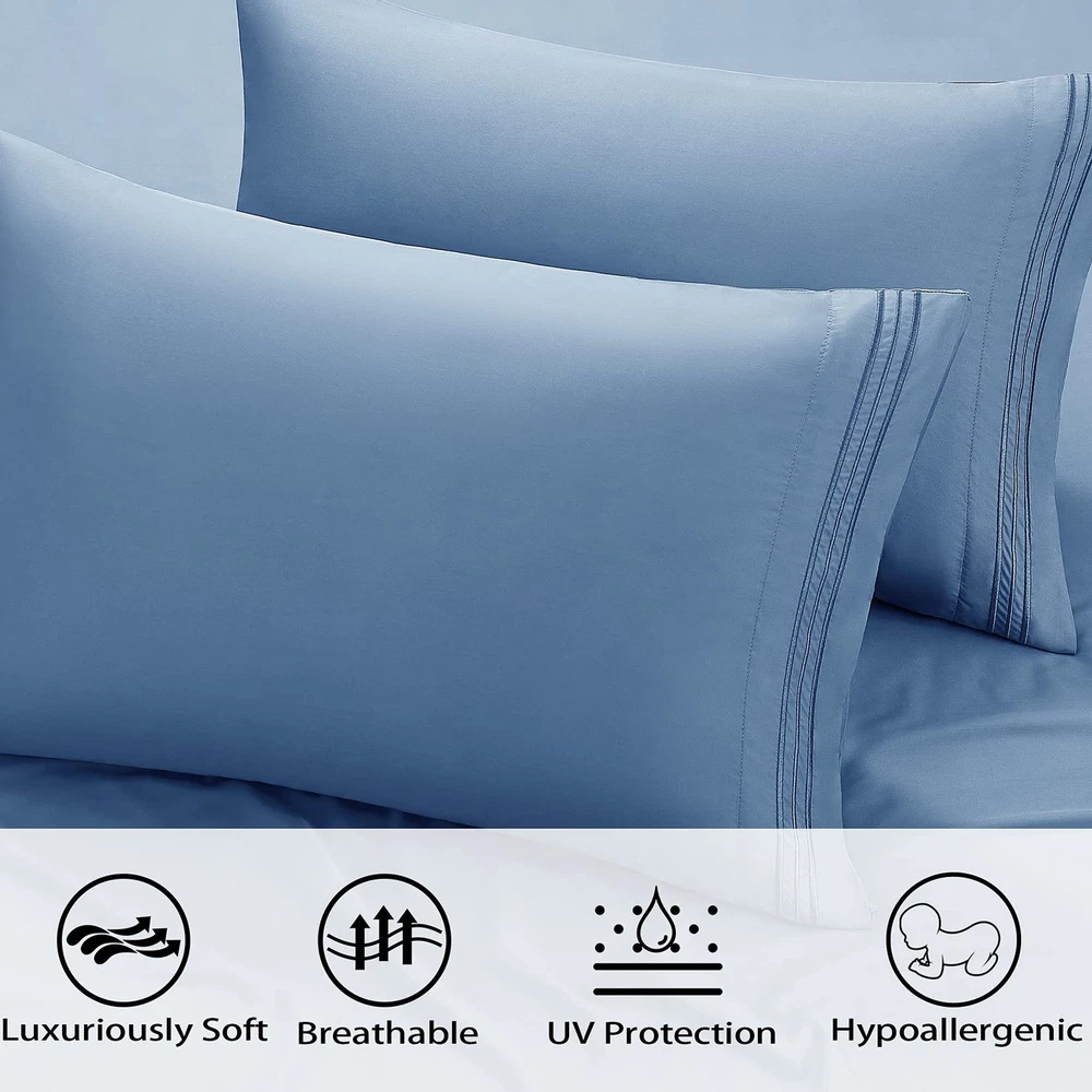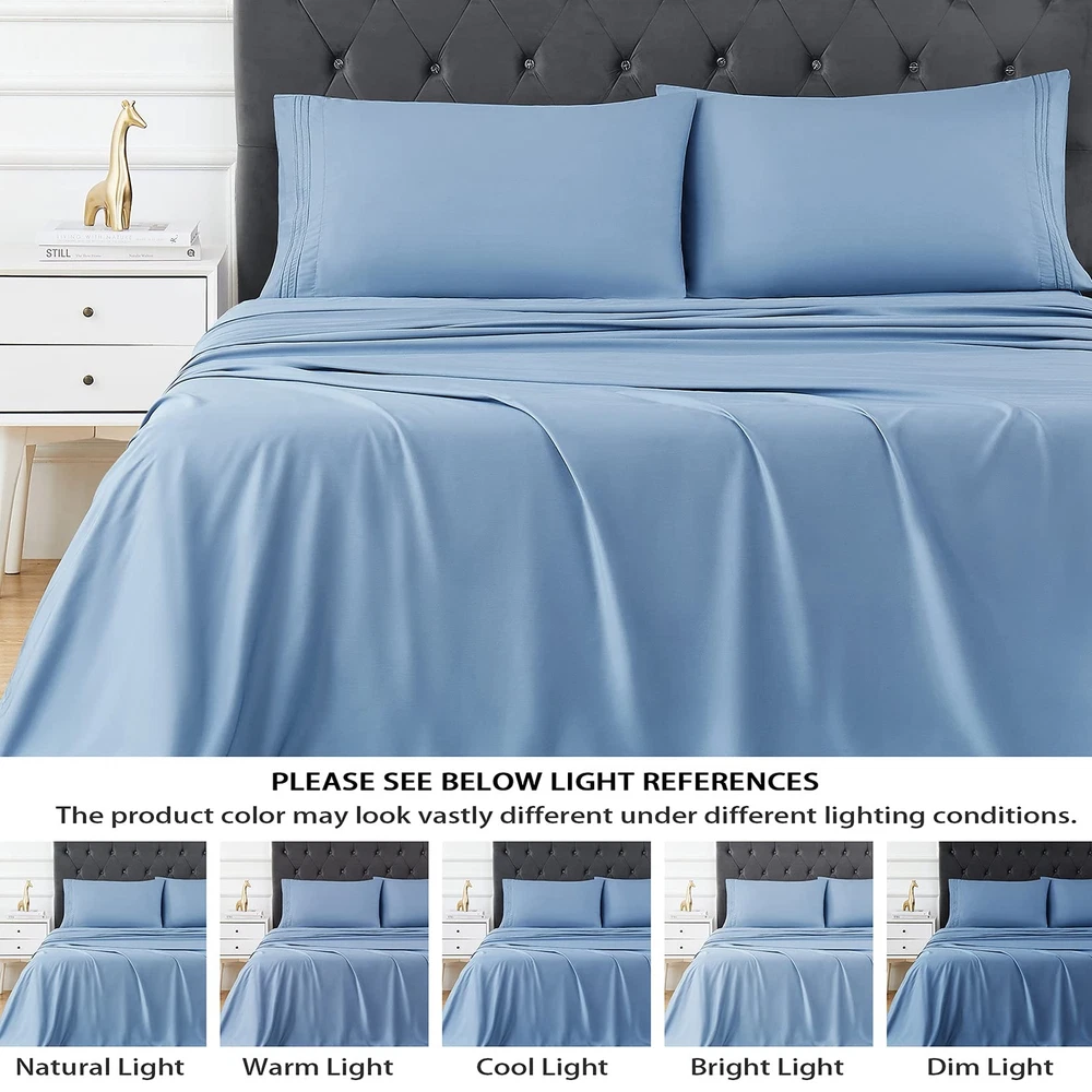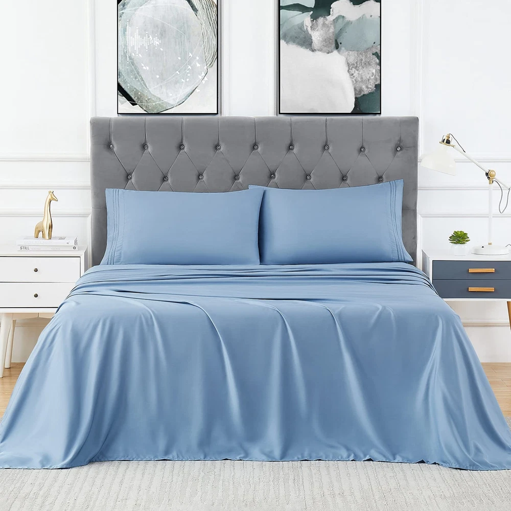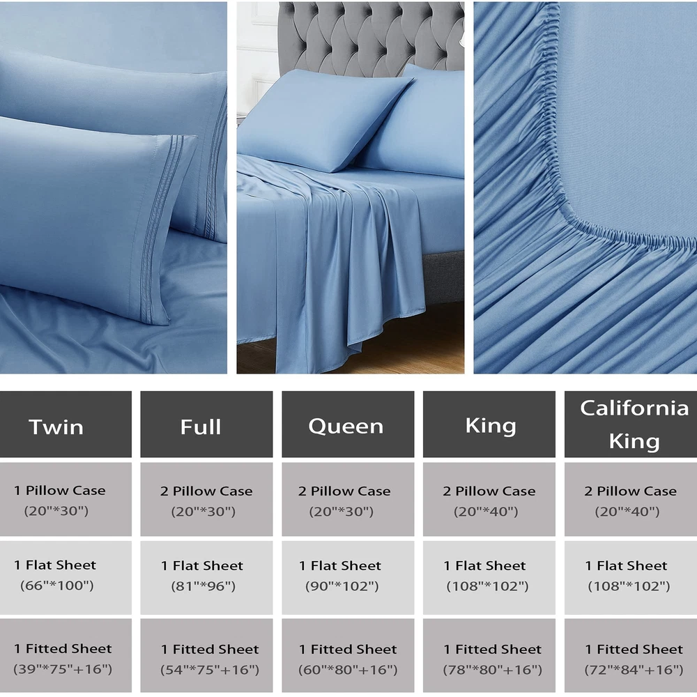 Material: Rayon Derived from Bamboo. The simple design, makes this bed sheet set a natural and stylish choice for your home Cool: Rayon Derived from Bamboo wicks moisture away, cooling sheets that keep you cool in summer or any season. Great help for people with night sweats. Sleep on Rayon Derived from bamboo sheets, you will sleep well overnight and enjoy sweet dreams. Excellent solution for hot sleepers at night. Providing more temperate conditions for a restful night’s sleep Silk Soft: With a twill weave for extra softness and smoothness. These bed sheets reduce tension on your hair and skin. Enjoy a gentle sleep experience that reduces wrinkles and hair loss 16" Deep Pocket: Expertly tailored fully elasticized fitted sheet with the durable elastic that goes all the way around the bed. Ensure a secure fit with DEEP POCKET that won’t move around in the middle of the night, staying smooth and snug, bring you a perfect restful sleep What You Can Get:Queen Size Luxury 4 pcs Bed Sheets Set - 1 flat sheet 90"x102", 1 fitted sheet 60"x80"+16", 2 pillow cases 20"x30"