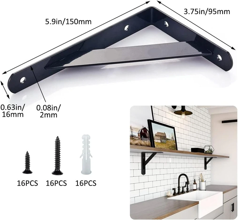 Store New Arrivals Add to Favorite View Feedback Contact Shelf Brackets 8 Pcs Heavy Duty Triangle Shelf Brackets 6 in X 4 in Metal Shelf Support Angle Brackets Black Wall Shelf Brackets with Screws for Shelves Support DIY Description Item model number Shelf Brackets Batteries Required? No Finish Glossy Mounting Type Wall Mount Color Black Country of Origin China Product Dimensions 5.91 x 3.74 x 0.63 inches Material Steel Item Depth 2 millimeters Item dimensions L x W x H 5.91 x 3.74 x 0.63 inches Item Weight 1.65 pounds Batteries Included? No Size 6 Inch Finish Type Glossy Included Components Bag 【Triangle Shelf Bracket】 The shelf brackets are made of high quality steel with black powder-coated finish is durable, corrosion-resistant. The smooth and rounded surface makes it easy to maintain. the Versatile shelf brackets with a 90-degree stable triangle structure can hold up to 66 lbs per pair. 【Save Space】This heavy duty Shelf Brackets saves space in your home, keeps your room tidy and keeps your household items neat and tidy. With the wall brackets for shelves for your storage space, even cluttered items can be hung in the area where the bracket is mounted. Makes your life more organized and tidy. 【Easy to Install】 The package comes with all hardware you need, includes 8pcs Metal Shelf Support Angle Brackets and all the screws & anchors. You just need to prepare a screwdriver to install easily. 【Decorative】The glossy black finish on the wall shelf brackets gives the stand set an elegant look that suits most furniture styles and will not go out of style. It will become a home decoration on the wall, making your home or garden more beautiful and bringing an artistic touch to your house. It’s practical and not expensive. 【Widely Application】 The Shelf Support Angle Brackets can be used to build a frame, serve as a corner connected as a bookshelf, kitchen shelf, exhibition stand, garden shelf, external wall bracket, etc. They are suitable for both indoor and outdoor, compatible with wood, plastic, or metal shelving boards. VILIVE high quality shelf brackets make the perfect addition to your space. playing a good storage and decoration role, making your home and garden more stylish and unique It is an ideal choice for decoration and space saving. Features of Our triangle shelf bracket: ✔The shelf bracket is made of high-quality steel, and the surface is matt black coating, smooth, rust-proof and durable, and can maintain a stylish appearance for a long time. ✔Stainless steel shelf brackets are more stable to use because of the triangular structure.The maximum load of each pair is 30 kg/66 lbs. ✔This heavy-duty shelf bracket set comes with all necessary accessories for easy installation. ✔Make full use of the wall space to help various kitchen supplies, books, daily necessities, etc. ✔Wall Shelf Brackets are perfect for indoor and outdoor such as bookshelf, exhibition stand, garden shelf, external wall brackets, Kitchen brackets, bathroom brackets, etc. Specifications: Material: High Quality Steel Color: Black Bracket Size: 15cm x 9.5cm / 6 inches x 3.8 inches Thickness: 2 mm/0.08 inch Hole Dimension: 5mm/0.2 inch Max. Load: Approx. 30KG/66Lbs Package Included: 8 x Shelf Brackets 16 x Long Screws 16 x Short Screws 16 x Wall Anchors ABOUT US We offer the best prices around on high quality products. Our E-store includes media such as books, movies, music and games while offering electronics, toys, sporting apparel, clothing, tools, general home, garden items and more. SHIPPING We are always working hard to ensure your package arrives as soon as possible. Please understand that some factors like weather, high postal traffic, and the performance of shipping companies are outside of our control. We offer free shipping to the lower 48 states and ship within 2 business days of payment, usually sooner. We do not accept P.O. Boxes. Please provide a physical address. RETURNS We offer a 30-Day Return Policy on items which you are not completely satisfied with. You have the option for a full-refund or an exchange of the item. No returns are available on items shipped outside of the USA. PAYMENT We accept PayPal. CONTACT US This page content is yet to come Please ad us to your favorite seller and visit again later Thank You CUSTOMER SATISFACTION We try our very best to make sure every customer is completely satisfied. If there's a problem, message us! We're happy to help.