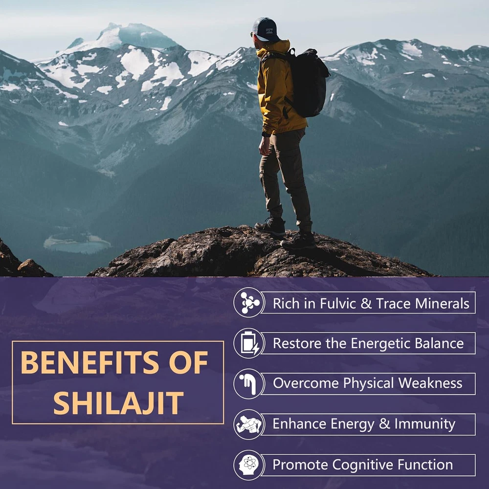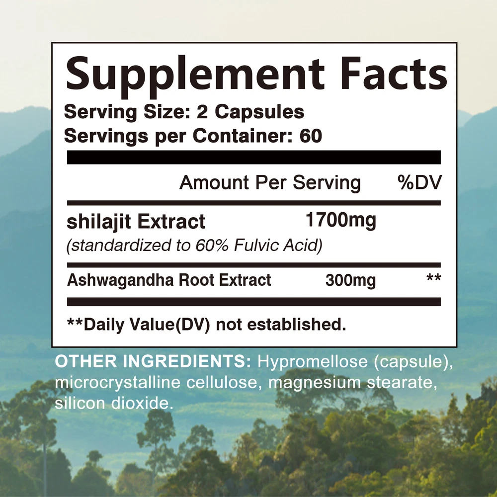 Effects: Cognitive Health,Immune Support Ingredients: Shilajit Exteact,Ashwagandha Directions: Take 2 capsules once daily after a meal. Shipping: Ships within 48 hours on working days. Shelf life: 2 years Description: Promotes overall well-being, providing potential support for all aspects of health. Whether it's boosting immune function, improving cognitive clarity or boosting energy levels, Shilajit Extract and Ashwagandha formula fits perfectly into your daily wellness regimen. Truly boost your overall health by rejuvenating the body, improving mental clarity, memory, energy, endurance and boosting the immune system. Free of Major Allergens: Free of wheat, gluten, soy, dairy, egg, fish/shellfish, peanuts/tree nuts and sesame; also suitable for vegetarians and non-GMO. Document