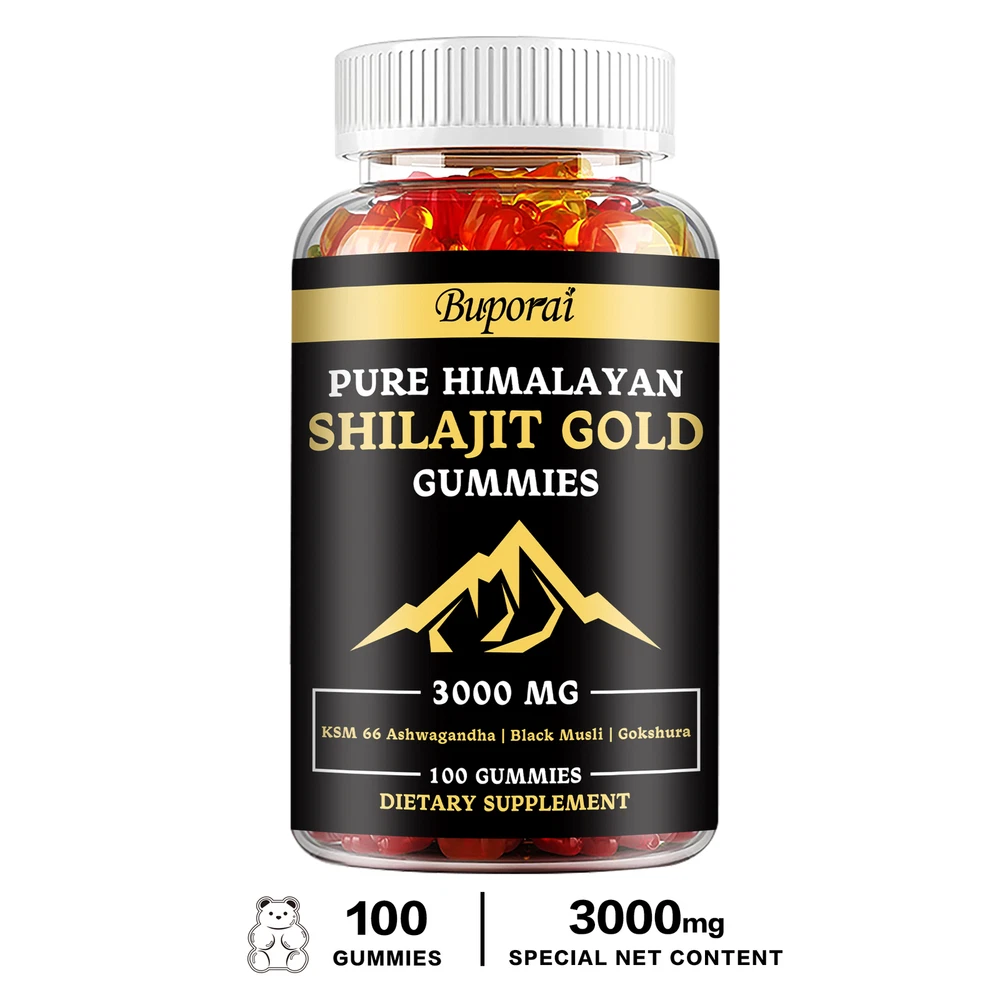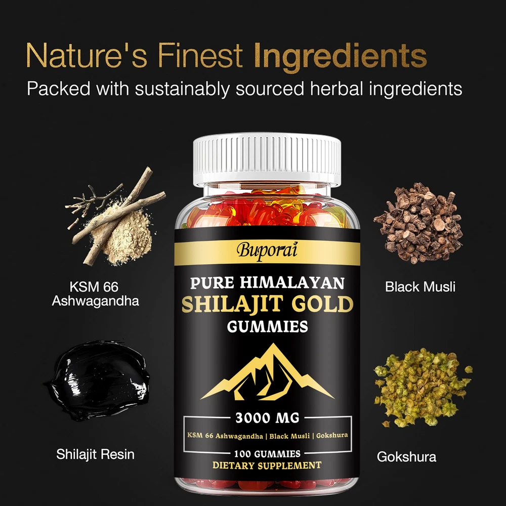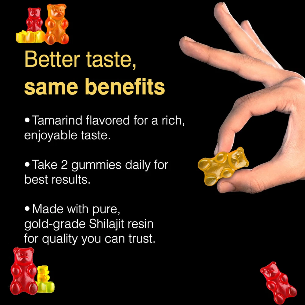 Effects: Muscle Health, Energy and Endurance Ingredients: Shilajit, Ashwagandha, Tribulus Terrestris, Panax Ginsengs Directions: Take 2 gummies once daily after a meal. Shipping: Ships within 48 hours on working days. Shelf life: 2 years Description: From the Himalayas: Sourced from the pristine highlands of the Himalayas, our Pure Himalayan Shilajit contains pure organic gold grade shilajit from 18,000 feet above sea level. Specially formulated to boost energy and help improve daily exercise and recovery to help you on your health transformation journey. Boost Vitality: Our powerful full-strength supplement combines potent extracts of Himalayan Shilajit Resin, Ashwagandha, Panax Ginseng, Tribulus Terrestris, and more. These ingredients help boost your overall well-being by helping to increase strength, aid post-workout muscle recovery, and reduce fatigue. Document