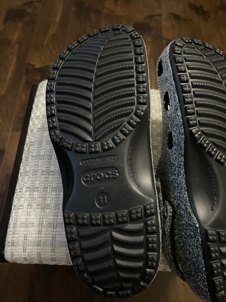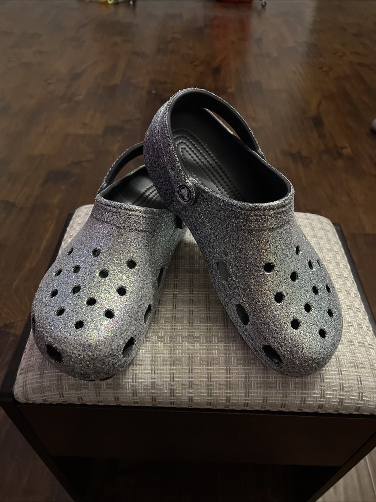 The "Glitter Crocs" are a pair of men's casual clog shoes in a size 11. They feature a glittery design on the rubber upper material, adding a touch of sparkle to the classic Crocs style. Perfect for lounging around the house or running errands, these Crocs combine comfort with a fun and stylish look.