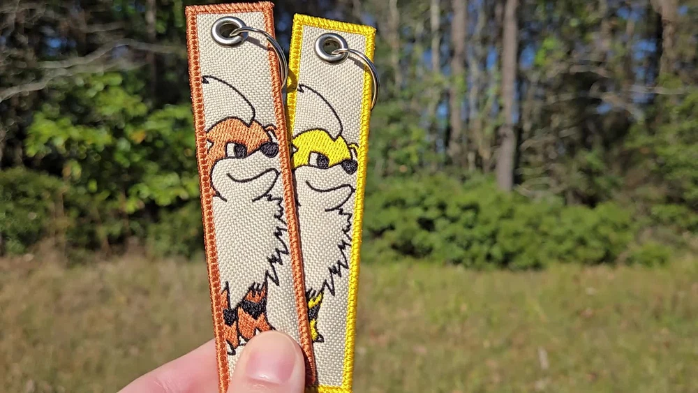 This is a Shiny Growlithe Jet Tag Keychain that I machine embroidered into waterproof canvas, it's perfect for accessorizing anything from your keyring to a lanyard or a backpack! This tag is made from waterproof canvas with a different design embroidered into the front and back. I also offer the option to have a custom name on the back of the Tag! The dimensions of this tag measure roughly 5x1in. If there is a certain character that you're interested in, please feel free to message me!