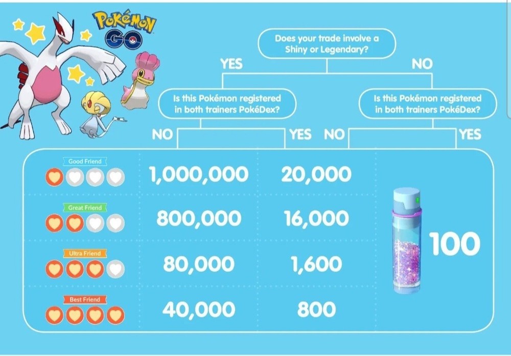 🔥 Registered trade (20k stardust) or 30 days friendship trade (80k stardust). 🔥 you have to use special trade of the day. Once purchased: 🔥 let me know what you want, Registered or 30 days trade. REGISTERED TRADE 1. I will contact you for your friend code, and location so I can teleport to you to trade. 2. Once you accept my friend request, I will send you a gift to open so we become 'good friends'. 3. Once Good friends',I will send you a trade request to begin trade. 4. Registered trade requires that you have the shiny Pokemon your buying in your Pokedex. 30 DAYS TRADE (ULTRA FRIENDS) 1. I will contact you for your friend code, I send/open gifts every day. 2. Once Ultra friends',I will contact you. 3. you give me your location so I can teleport to you to trade. During a trade, the CP and IV will be random . Feel free to ask any questions