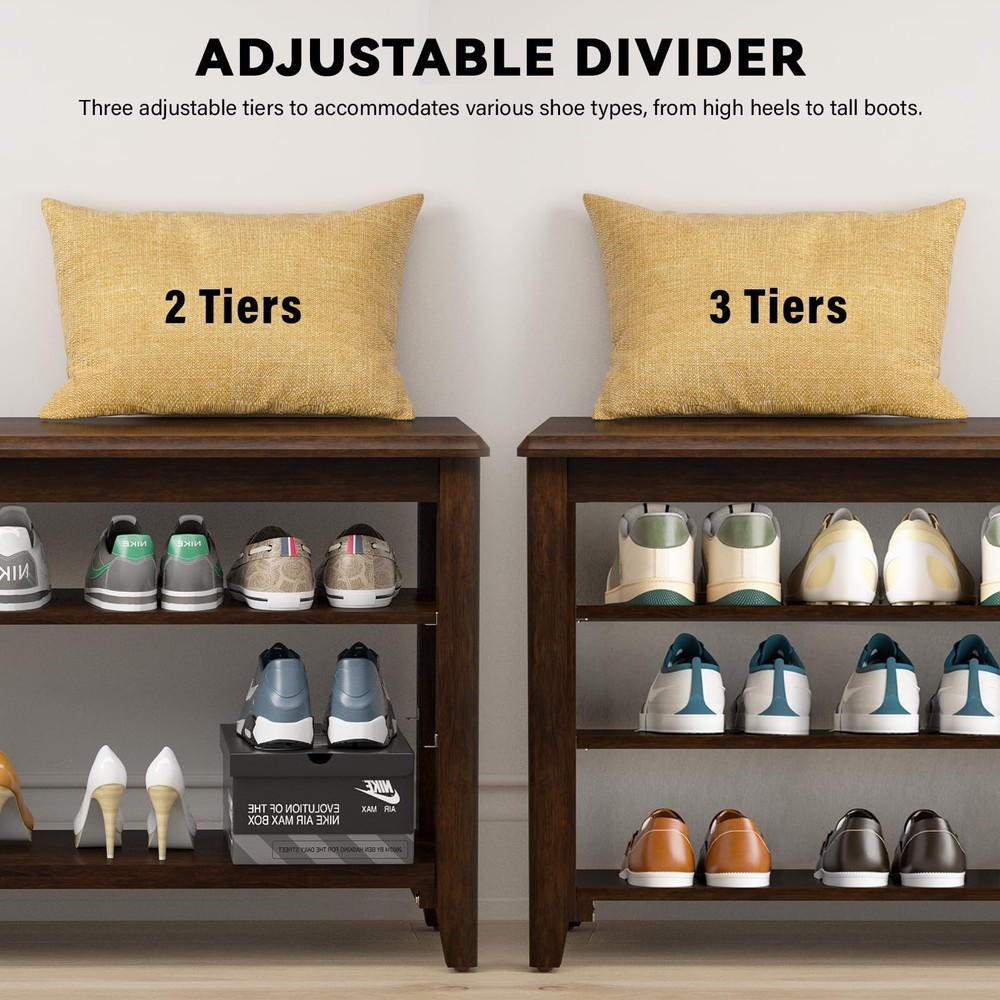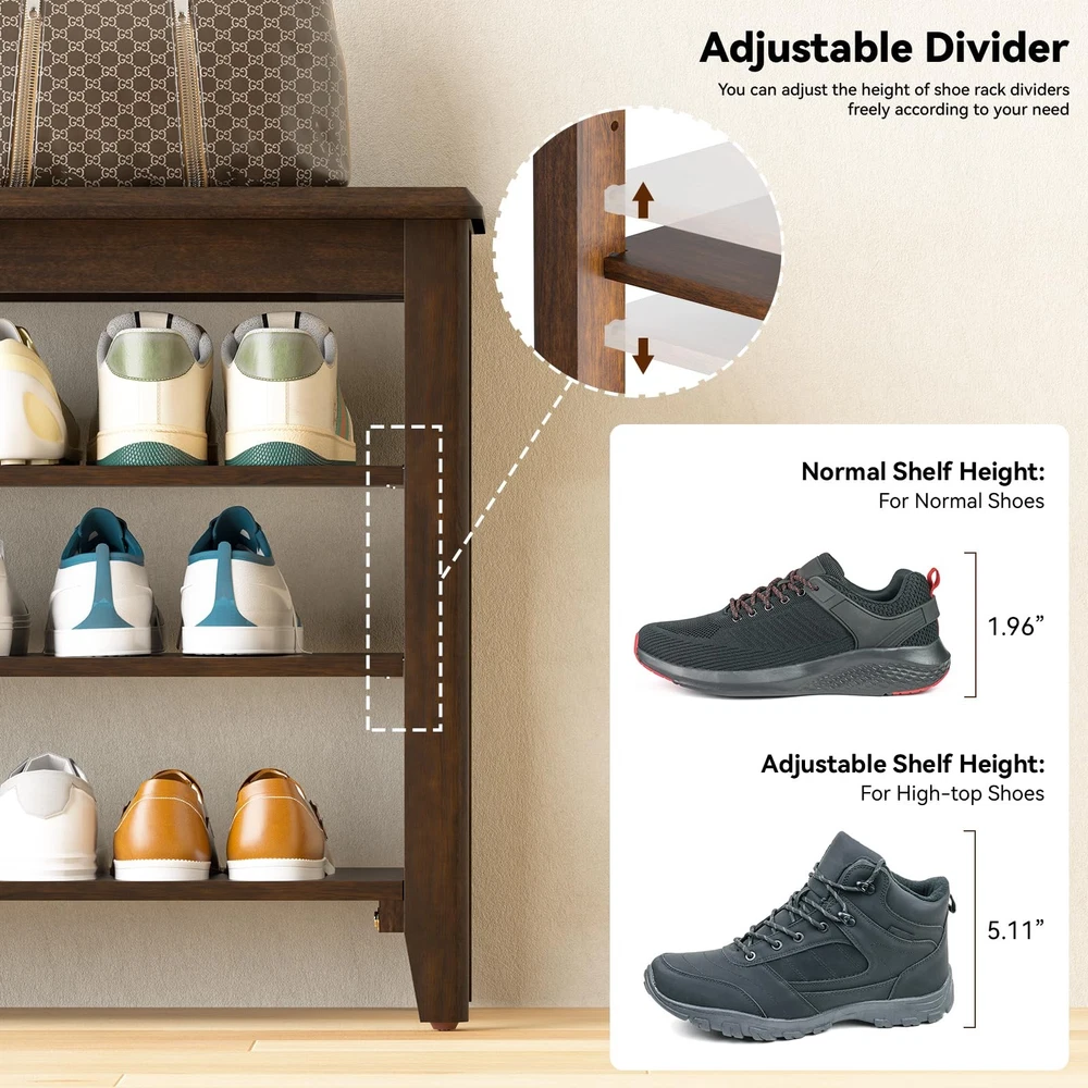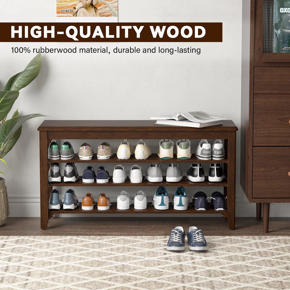 Entryway Bench Shoe Storage Bench Wooden Shoe Bench, 3 Tiers Shoe Storage Bench Customizable Storage: With three adjustable tiers that can be raised or lowered by 1.18 inches, this shoe bench accommodates various shoe types, from high heels to tall boots. Easily modify the shelf heights to fit your footwear needs, allowing you to maintain an organized and clutter-free entryway Spacious Seating: Measuring 39.4"L*11.81"W*20.47"H, the thoughtfully designed height of this shoe storage bench ensures comfortable seating as you slip on or remove your shoes, making it ideal for daily use. Its sturdy construction provides a stable seating experience, perfect for quick shoe changes Sturdy & Durable: Built with a solid rubberwood frame and legs, this entryway bench boasts a remarkable weight capacity of 500 lbs, ensuring stability and safety, no more wobbling annoyances anymore. The robust construction means this shoe organizer bench will withstand everyday use, providing peace of mind while you sit and slip on your footwear Easy Assembly: Say goodbye to complicated instructions! Our shoe bench with storage comes with clear, step-by-step assembly guidelines and all necessary hardware, allowing you to set it up in just 15 minutes. Enjoy a hassle-free installation experience that gets you organized in no time Versatile & Stylish: This wooden shoe storage is perfect for various spaces, including hallway, closet, living room. Its modern design complements any decor style. Plus, with its adjustable anti-scratch foot pads, this bench adapts effortlessly to uneven surfaces. Say goodbye to scratched floors and noisy movements—its a smart and stylish choice for any household