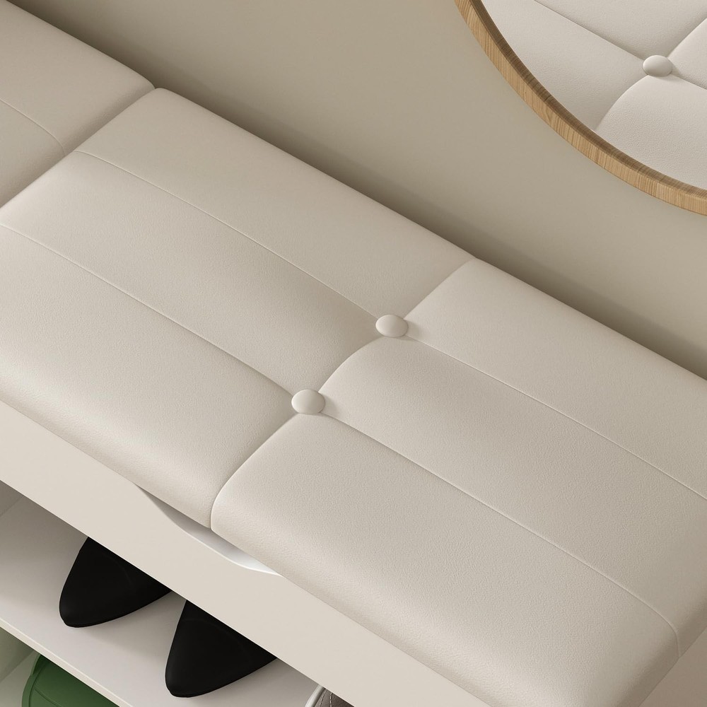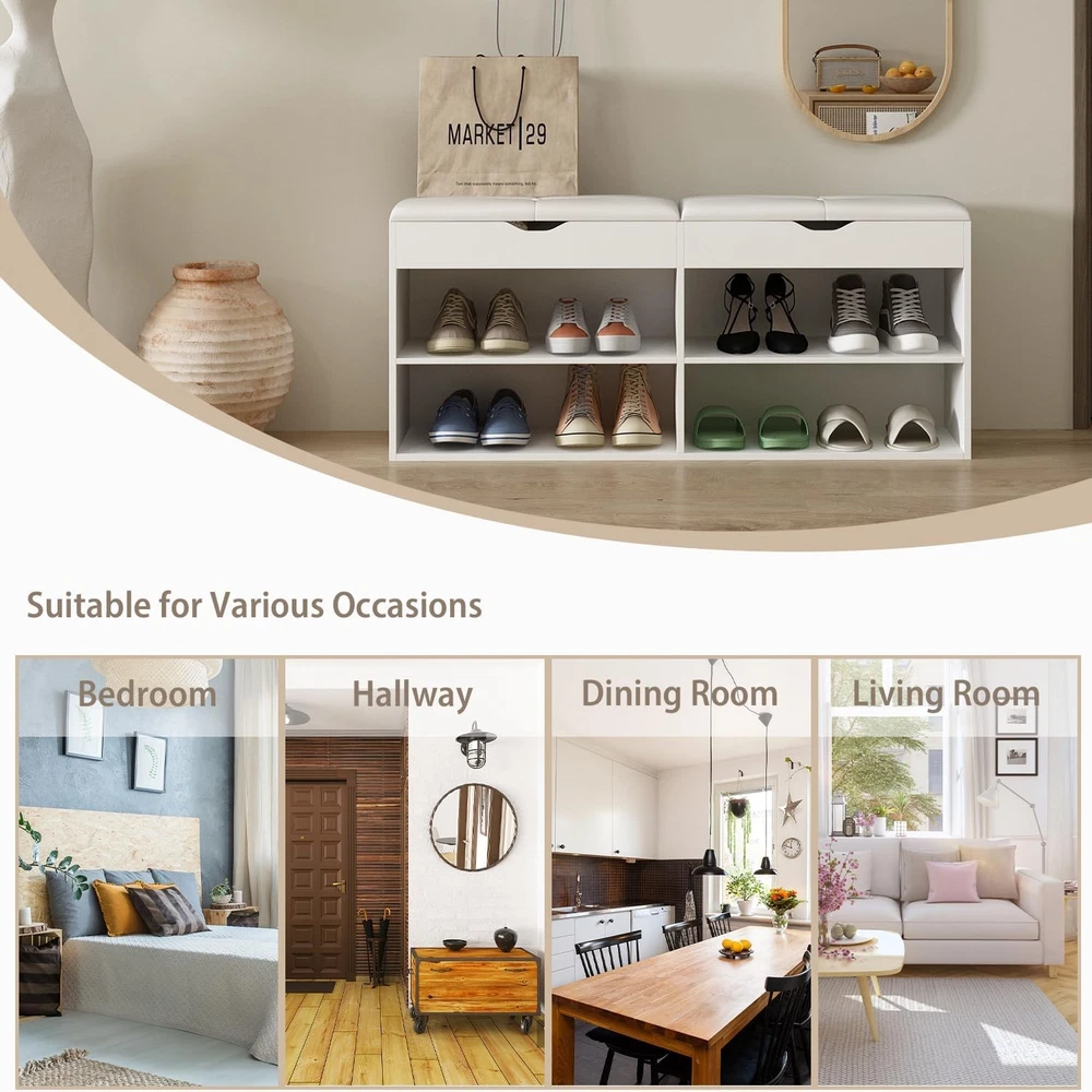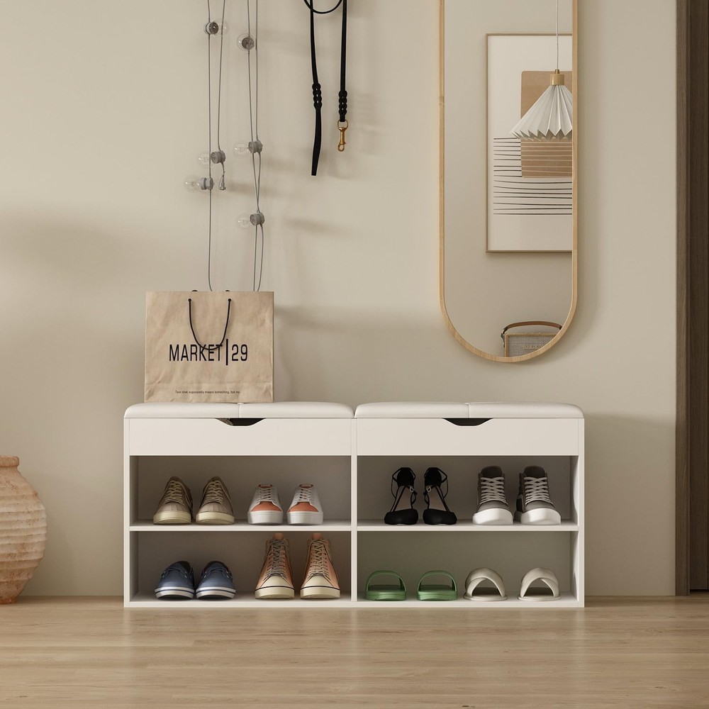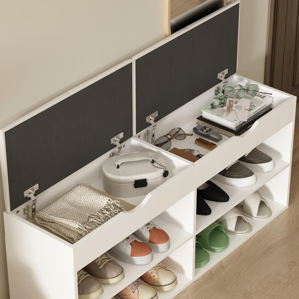 Product Description About this item Ample Space - The entryway shoe bench possesses 2 lift top storage boxes and 2-tier storage shelves. It will provide you with ample space to organize belongings, like umbrella, purses and other items for outing. And shelves with adjustable design can meet various storage needs. Bench with Cushion Seat - This shoe storage bench comes with a cushion seat, covered with PU leather, offering you a comfortable experience when changing shoes or taking a break. The cushion is soft to sit while its surface is easy to clean. Just take a damp cloth to wipe the dirt. Sturdy to Use - The double seat bench is mainly made of sturdy PB, MDF and PU leather, ensuring stability and durability. With sturdy construction, it boasts good load bearing capacity and you can sit with no worry. Dimension: 11.6”D x 47.2”W x 21.2”H. Multi-Use - Possessing modern appearance and practical storage design, this warm white shoe storage bench can go well with many home decor styles and fit to many scenes. Our shoe storage is suitable for placing in entryway, living room, hallway, mudroom or cloakroom. Assembly - The shoe bench include a detailed instruction and labeled hardware. Please check out that all parts are received and intact before your assembly process. And please follow the directions to assemble it carefully. Shoe Bench with Adjustable Shelf, Storage Bench with Lift Top Storage, Double Seat Bench Entryway Shoe Storage Bench with Cushion for Hallway Living Room White, 11.6”D x 47.2”W x 21.2”H