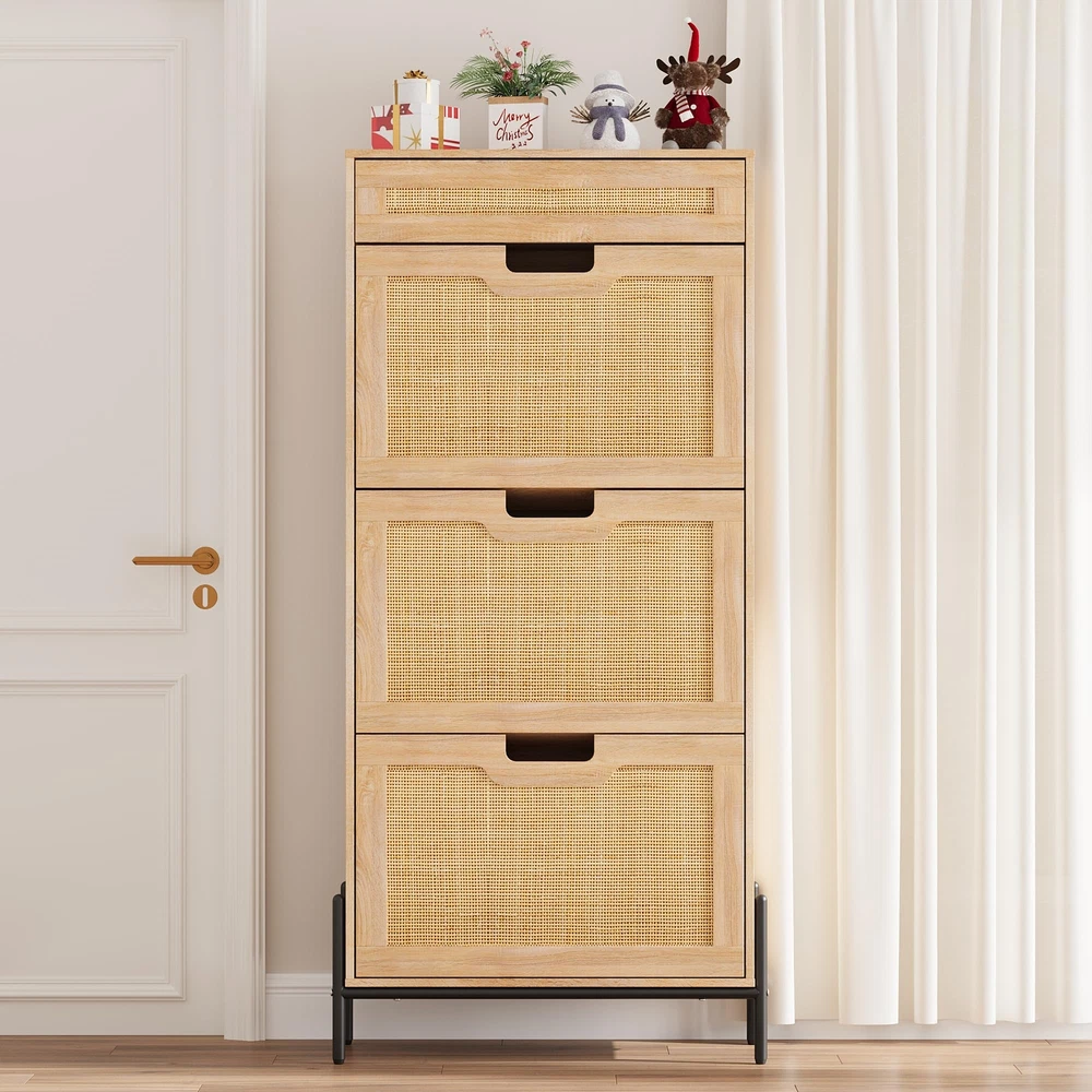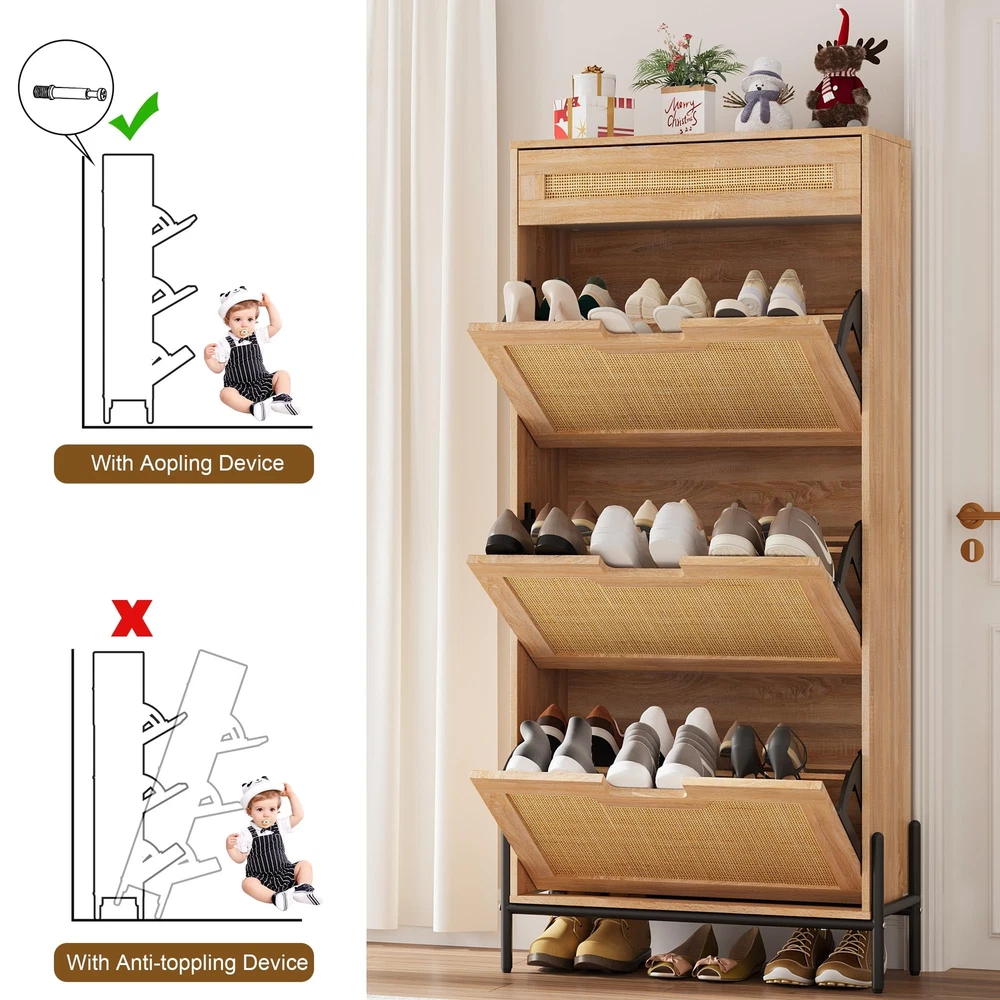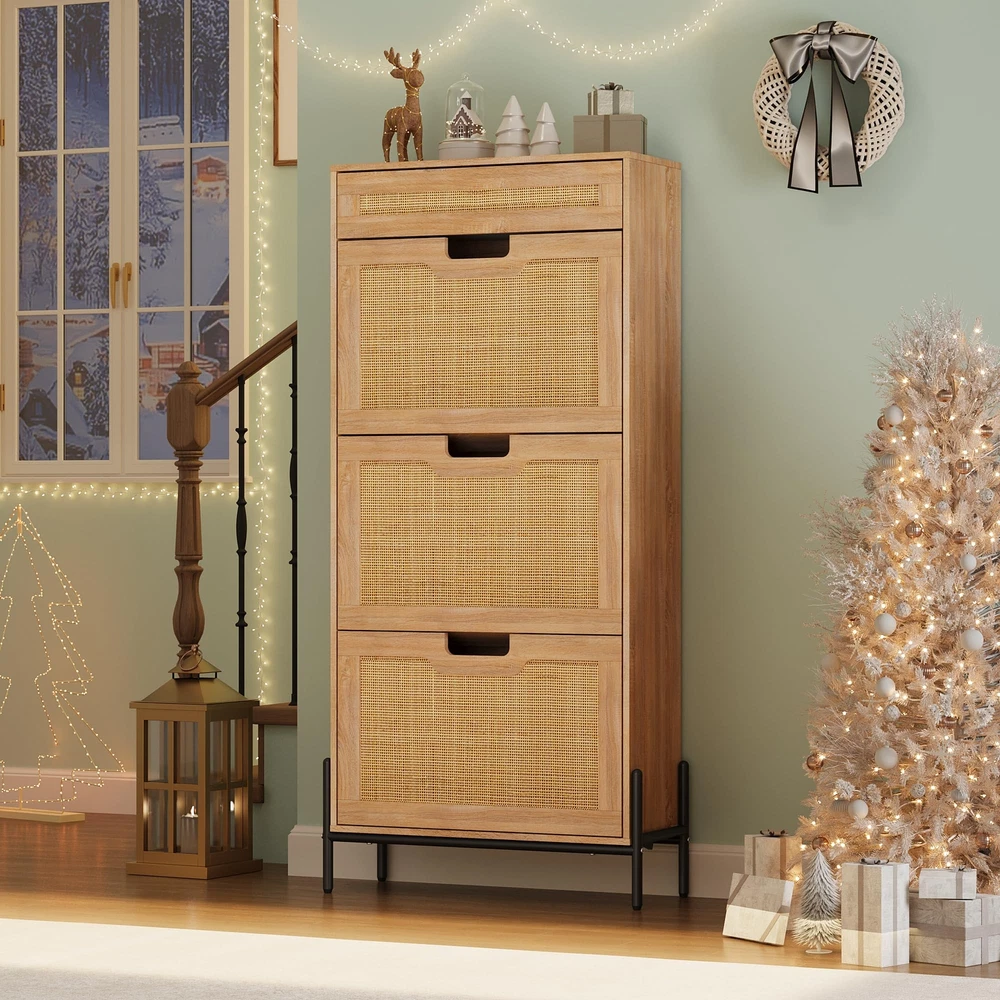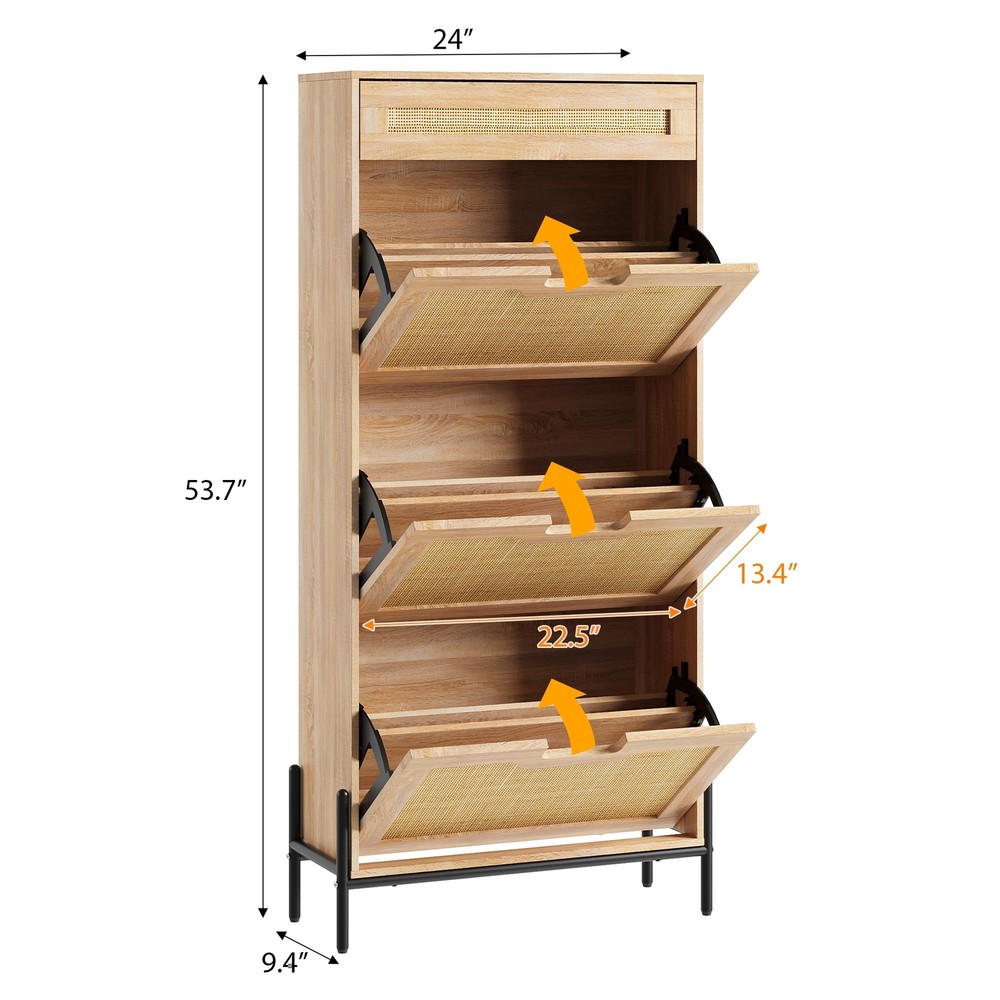 Shoe Storage Cabinet 3 Flip Door with 1 Drawer for Entrance Entryway Shoe Rack Natural 3 Flip Door Rattan Storage Cabinet, Modern Entry Way Cabinet with Storage, Drawer and 3-Tier Adjustable Shelves, Freestanding Entrance Shoe Cabinet for Entryway, Oak Elegant Natural Rattan Design : This shoe cabinet combines sturdy medium-density fiberboard with hand-woven natural rattan, creating an elegant and classic look. Thoughtfully designed to maximize space, it keeps your living room, hallway, and bedroom clean and tidy. The natural rattan elements not only enhance the aesthetic appeal but also introduce organic beauty to your living environment. Sturdy and Durable Construction : The supporting feet of this rattan shoe cabinet are made of metal, while the other components utilize solid wood for added strength and durability. For safety during use, the top of the cabinet features an anti-tilt device, ensuring stability and peace of mind. Ample Storage Capacity : Equipped with large drawers to meet your various storage needs, this cabinet provides practical organization solutions. The top drawer is perfect for storing smaller items, helping to keep your space tidy, while the hinged door offers ample room for shoes. Depending on the style of your shoes, the cabinet's storage capacity will vary. Additionally, it includes 2 adjustable compartments, and the middle divider can be removed to accommodate larger footwear. Space-Saving Design : Measuring 24 × 9.4 × 53.7 inches, this rattan shoe cabinet is designed to save space while still offering generous storage capabilities. It can be placed in various locations, including the living room, bedroom, or hallway, making it a versatile and essential addition to your furniture collection. Easy Installation : Our package comes complete with installation instructions and necessary tools, allowing for a quick and straightforward assembly process. Simply follow the guide to set up your shoe cabinet in no time. Should you encounter any issues during installation or use, our customer support team is readily available to assist you.