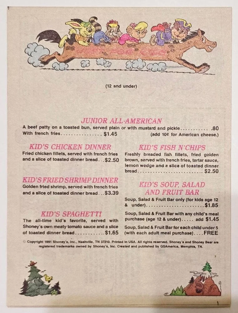 Theme: Restaurants & Fast Food Brand: Shoney's Color: Black Seller Notes: “Excellent new condition, Check out the photos for condition details.” Type of Advertising: Kids Activity Comic Book Date of Creation: 1991