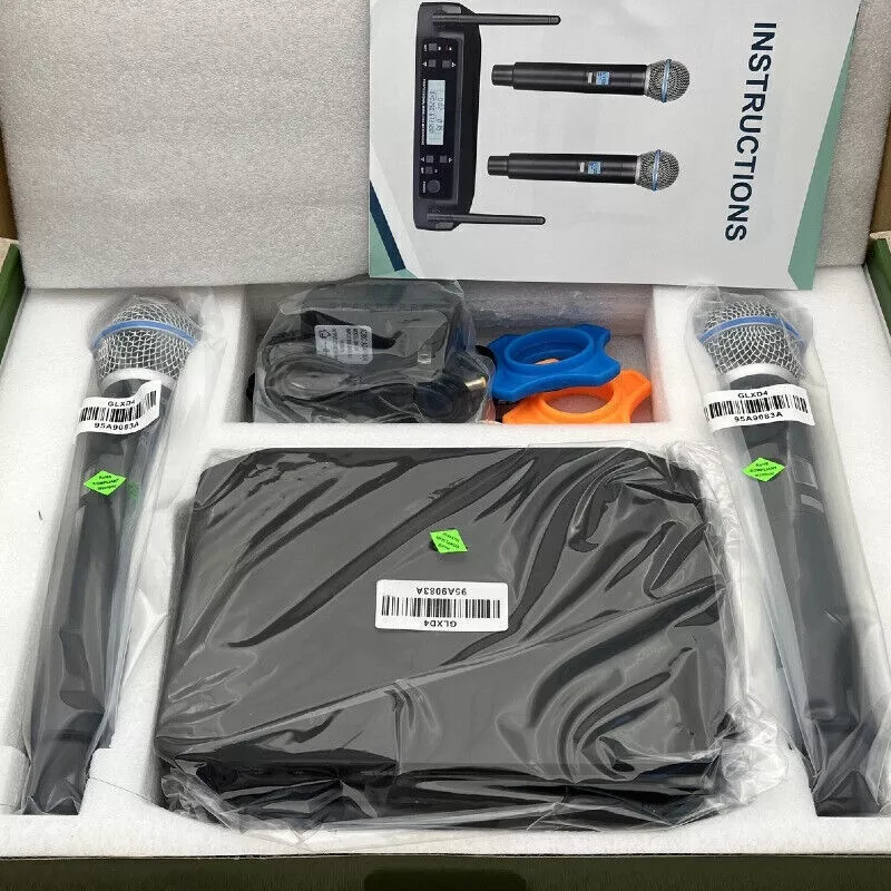 Shure Vocal Dual Channel Wireless Microphone System UHF Handheld GLXD4+BETA58A Specifications: - Style: Handheld Microphone - Transducer: Dynamic microphone - Use: Karaoke microphone - Set Type: Pairing - Polar Pattern: Cardioid - Diaphragm: Small - Communication: Wireless - Model: GLXD4 - Frequency: adjust the frequency - Frequency range: 510-590MHZ - Use distance: 50m/164ft - Use: KTV, stage, performance, church, wedding, performance, band, and family - Material: ABS engineering plastic - Number of microphones: 2 Package Included: As shown in the figure On Jan 4, 2025 at 00:37:18 PST, seller added the following information: