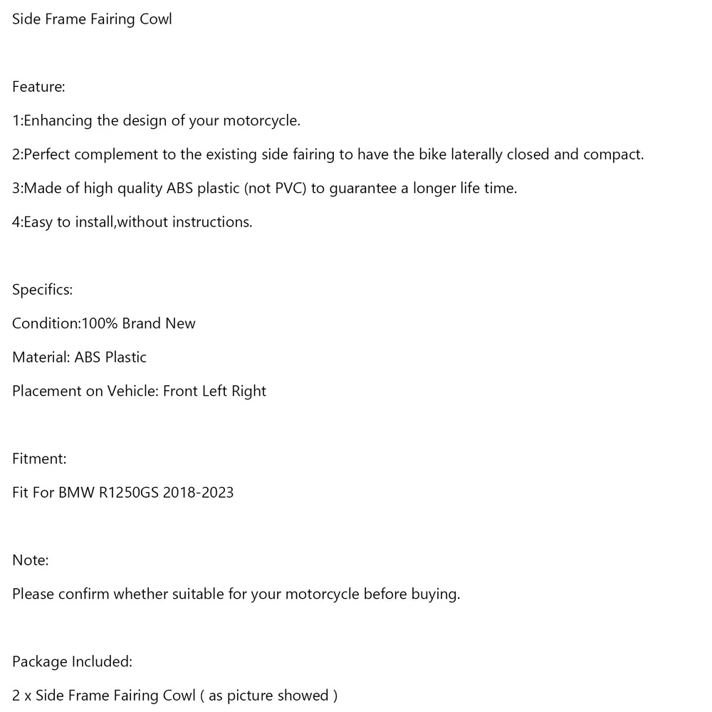 You may also like Unpainted ABS Rear Tail Seat Side Cover Fairing For Honda CBR500R 2019-2021 88.85 USD Free shipping Aluminum Shifting Gear Lever Stabilizer Green For Kawasaki Zx-25R Zx 25R 2021 16.85 USD Free shipping Motorcycle CNC Swingarm Spool Adapters / Mounts For Honda CBR250R 2011-2013 Gray 39.85 USD Free shipping Brake + Clutch Reservoir Caps Red For MV Agusta Dragster 800 RC RR SCS Rosso 27.85 USD Free shipping Front Horn Cover Decoration Trim For Vespa Sprint 300 GTS 300 HPE GTV Yellow 17.85 USD Free shipping M5 THREAD ZINC PLATED SPRING SPIRE C CLIPS U NUTS SPEEDCLIPS CHIMNEY 5MM QTY 50 16.85 USD Free shipping Steering Horn Cover fairing For VESPA Sprint Primavera 125/150 2014-2021 Yel 41.85 USD Free shipping Side Tank Traction Grip Knee Pads Protector For Honda CBR650F 2014-2021 15.85 USD Free shipping Rear Tail Light Seat Cover Fairing For Suzuki GSX-S 1000 2015-2020 Black 48.85 USD Free shipping Injection Fairing Kit Bodywork Plastic ABS fit For BMW S1000RR 2019-2022 739.0 USD Free shipping Gas Tank Side Trim Cover Panel Fairing Cowl For Suzuki GSXR1000 2005-2006 K5 24.85 USD Free shipping Headlight Fairing Windshield Cover For Yamaha XVS 950 SPEC BOLT 950 2014-2020 AV 88.85 USD Free shipping Side Frame Fairing Cowl Feature: 1:Enhancing the design of your motorcycle. 2:Perfect complement to the existing side fairing to have the bike laterally closed and compact. 3:Made of high quality ABS plastic (not PVC) to guarantee a longer life time. 4:Easy to install,without instructions. Specifics: Condition:100% Brand New Material: ABS Plastic Placement on Vehicle: Front Left Right Fitment: Fit For BMW R1250GS 2018-2023 Not suitable R1250GS ADV Note: Please confirm whether suitable for your motorcycle before buying. Package Included: 2 x Side Frame Fairing Cowl ( as picture showed ) -About US Founded in 2012, VIPJQ have professional development and sales, and are involved in various products, providing customers with various high-quality products. Since its establishment, VIPJQ has always adhered to the service concept of "customer first" and the management concept of "pursuit of quality", and is committed to providing customers with high-quality original designs. We commit to provide you the best innovative, quality products & professional services with competitive prices. We value every customer, and we look forward to providing solutions for your business needs to help your business achieve its goals, please contact us immediately! We are all about you! We are a Japanese seller,but with large warehouse in USA. We are profesional on Auto Parts,Car Parts,Motorcycle Parts,3C,other hot sale items and so on. We aim to provide to customers high quality product and best service. -About Shipment&Returns The item usually will be dispatched within 3 days after you ordered.All are free shipping. And it usually takes 3-10 working days to delivery depends on buyers' address or other majeure on the way. If you are not satisfied with the items and want to return the item,we hope you could message us first,we will give you the return details, we think we could give you the best service to save your time and money.Thank you. -About Feedback&Customer Service If you are enjoy your shopping here,not only enjoy the items but also the service,we are appreciate you could give us a 5-star feedback. If you are not satisfied with the item,before you give us the negative feedback,we hope we could give you the best solution through our commutication. We think we could do it if you give us the chance.Thank you.