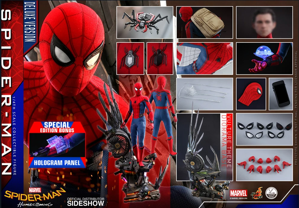 ✨New Condition/Never Displayed. Box has only been opened to inspect condition upon arrival from manufacturer. Will arrive in original shipper box from manufacturer. ⭐⭐⭐ Price listed or Best Offer ⭐⭐⭐ Discounts for local pickup or when buying multiple listings! Info from Sideshow: The Spider-Man (Deluxe Version) Special Edition Quarter Scale Figure features: An authentic and detailed likeness of Spider-Man in Spider-Man: Homecoming Newly developed interchangeable head sculpt with authentic likeness of Tom Holland as Peter Parker Five (5) pairs of interchangeable Spider-Man eyepieces that can create numerous combinations of expressions Newly developed body with 31 points of articulation Approximately 43.5 cm tall Ten (10) pieces of interchangeable hands with black cobweb pattern including: - One (1) pair of fists - One (1) pair of relaxed hands - One (1) pair of hands for cobweb shooting - One (1) pair of hands for cobweb swinging - One (1) pair of open hands Each head sculpt is specially hand-painted Costume: One (1) newly developed red and blue colored Spider-Man suit embossed with grayish black trims, cobweb pattern and black spider emblem on chest One (1) pair of red-color boots embossed with grayish black cobweb pattern One (1) pair of black colored web shooter One (1) pair of magnetic web-wings Accessories: One (1) Spider Drone One (1) GPS projection mapping One (1) smartphone One (1) beige backpack One (1) Spider-Man mask (not wearable on figure) Four (4) strings of spider web in different shapes and lengths, attachable to the web-shooters One (1) open spider web effect accessory Three (3) interchangeable Vulture themed diorama accessories*** Exclusive to Deluxe Version A specially designed Spider-Man vs. Vulture fight inspired diorama dynamic figure base features 2 LED lighting modes including general light effect and breathing light effect (battery operated) Exclusive Bonus Accessory for Special Edition: One (1) hologram panel . . . . . . . . . . . . . . . . . . . . . . . . . . . . . . . . . Height: 17.12" (43 cm) * Box Size Height: 11.25" (29 cm) Width: 12.50" (32 cm) Depth: 22.50" (57 cm) * Shipping Weight 13.50 lbs (6.1 kg) * * Size and weight are approx. values SKU 9049201 Vendor ID QS015B UPC 4895228602503 More info: https://www.sideshow.com/collectibles/marvel-spider-man-deluxe-version-hot-toys-904920?var=9049201