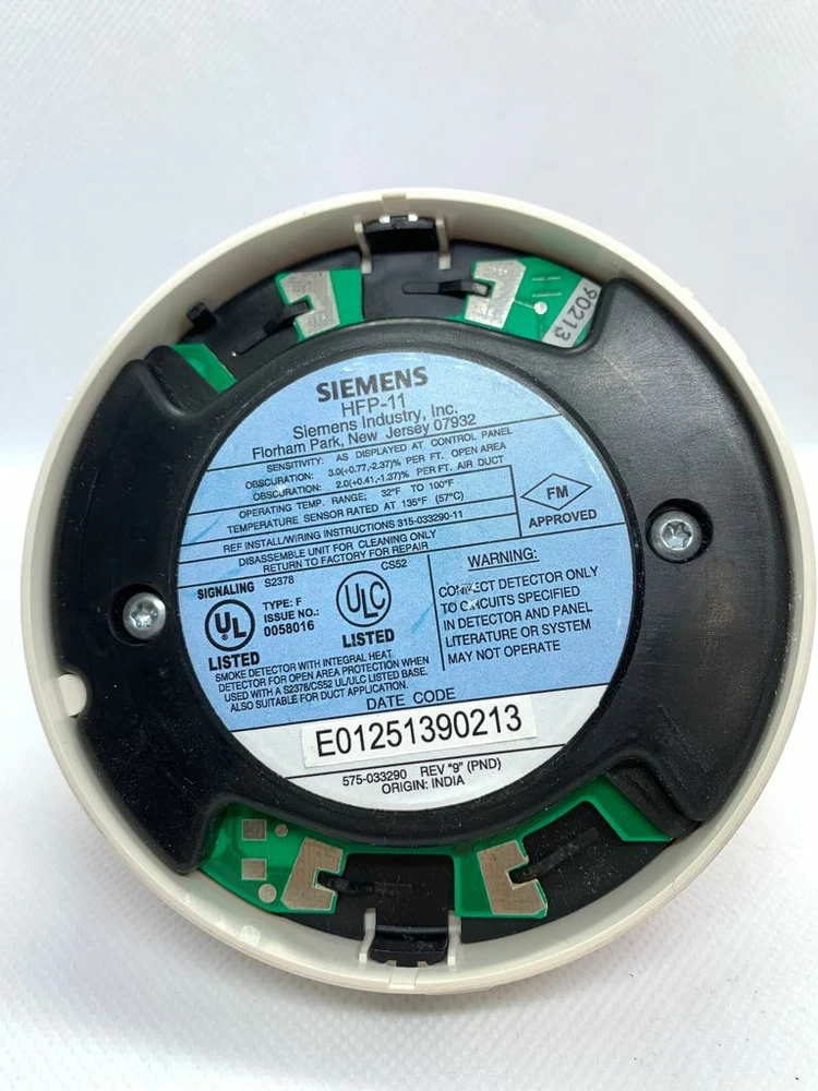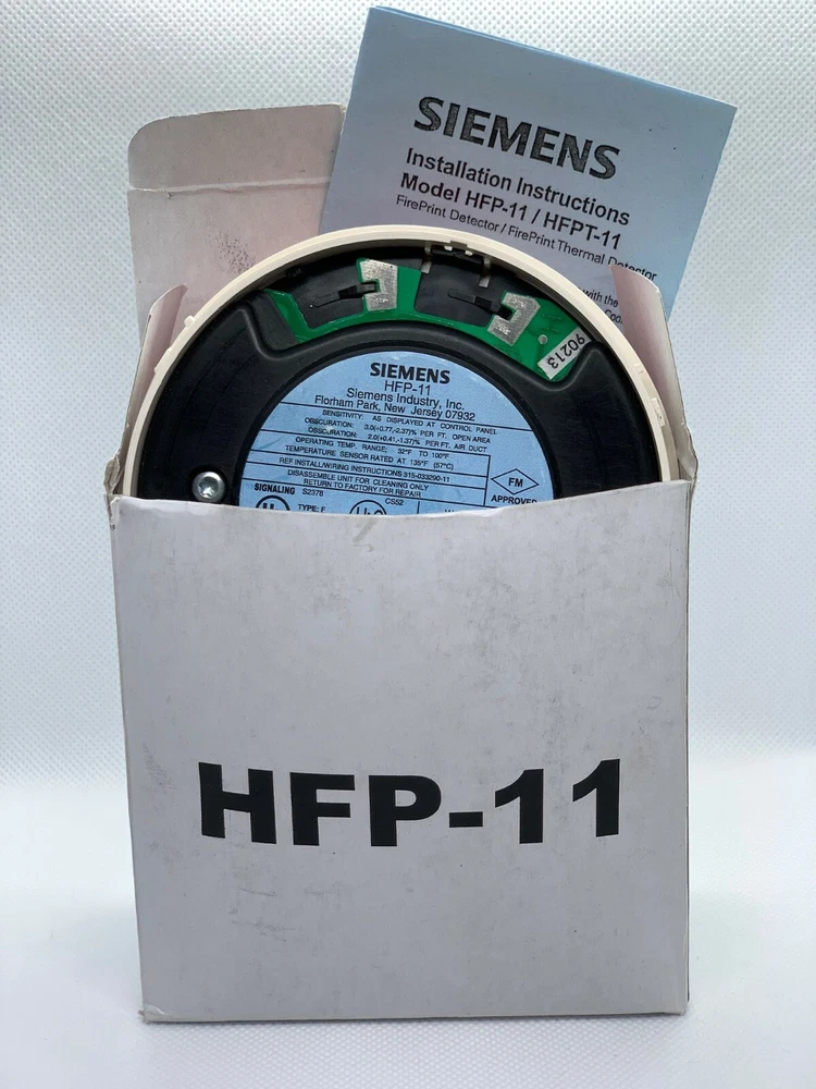 HFP-11 Siemens | Addressable Fire Print Fire Detector | Same Day Shipping Compatible with the Cerberus PRO 50-point, 252-point and 504-point addressable fire alarm control panels; FireFinder XLS and Siemens Modular systems, Model HFP-11 is a plug-in, two-wire multi-sensor and intelligent fire detector epitomizes a highly evolved detection system. Model HFP-11 utilizes advanced detection technology, allowing the detector to distinguish non-threatening deceptive phenomena, such as cigarette smoke, from actual fire hazards, while optimizing detection for the area in which it is installed. Detectors are optimized by selecting one of the following applications: Office/Retail, Lobby, Computer Room, Dormitory, Healthcare, Parking Garage, Utility/Transformer Room, Harsh (atmospheric) Environment, Precious Storage, Air Duct, and Warehouse/Light Manufacturing. Model HFP-11 uses state-of-the-art microprocessor circuitry with error check, detector self-diagnostics and supervision programs. Each detector consists of a dust resistant, field-cleanable photoelectric chamber; a solid state non-mechanical thermal sensor, and microprocessor-based electronics with a low-profile plastic housing. Compatible with the field-device programmer / test unit (Model DPU), programming of each Model HFP-11 intelligent detector is easy and reliable, eliminating the need for cumbersome, unreliable mechanical programming methods, such as dials or switches and reduces installation and service costs by electronically programming and testing the detector prior to installation. Shipped in a protective dust cover, Model HFP-11 is UL, ULC Listed, as well as FM and CSFM Approved.