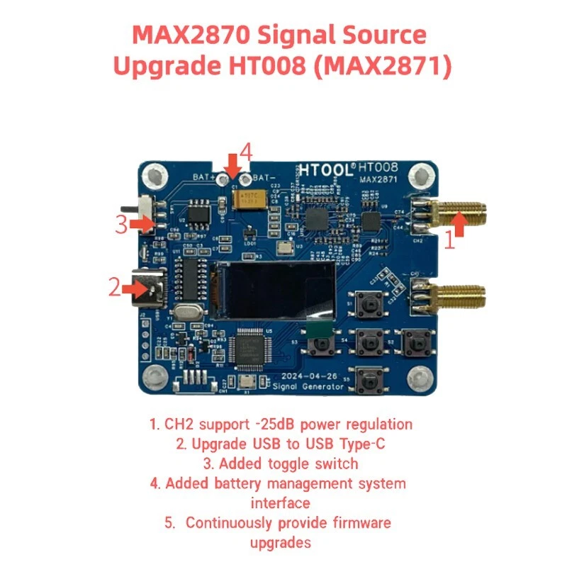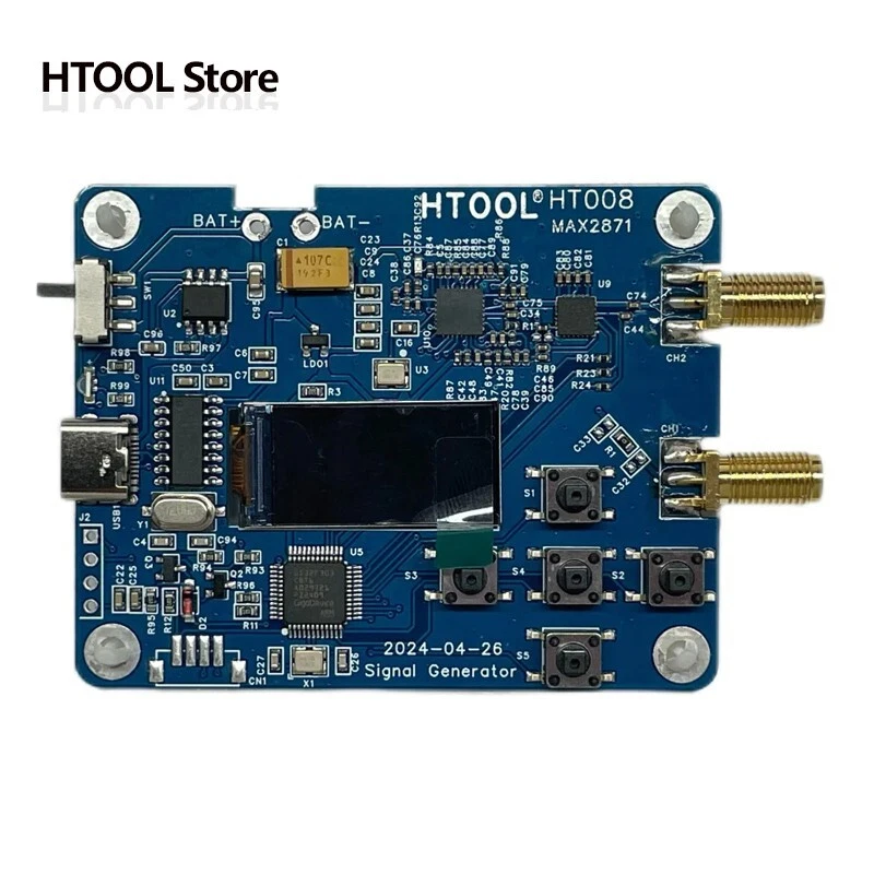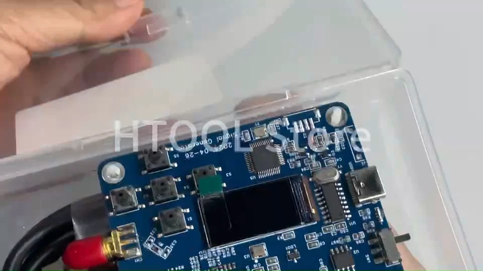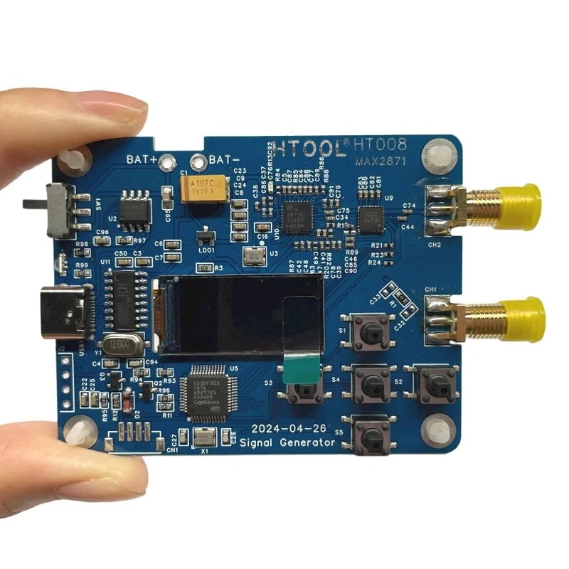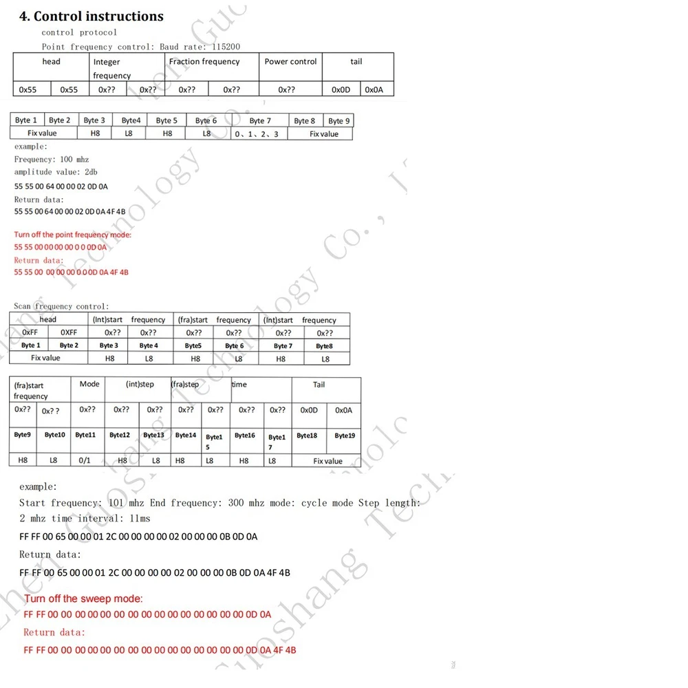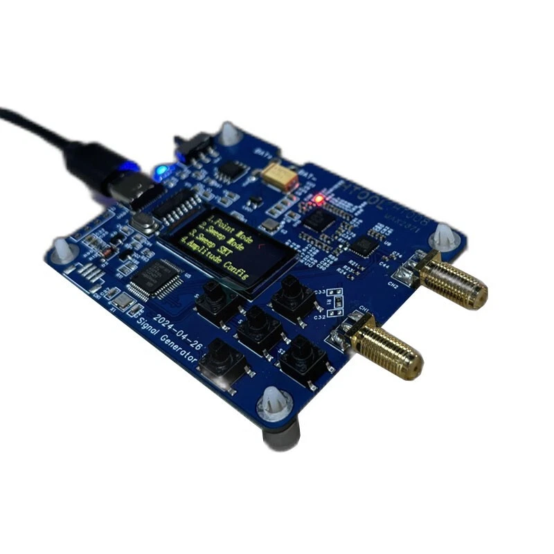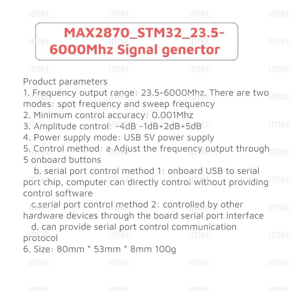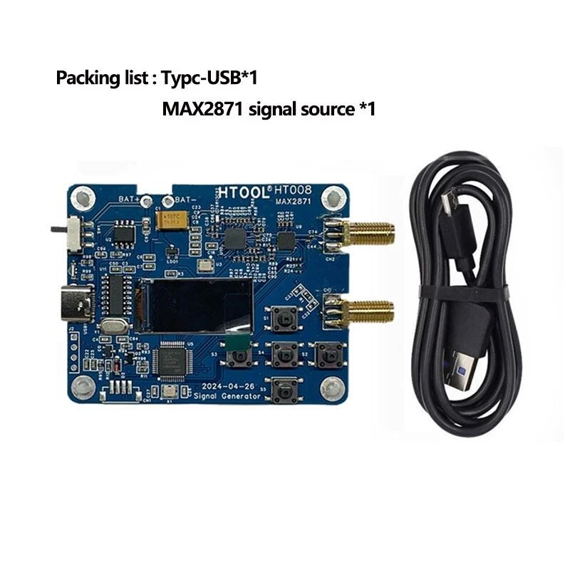 1. Product Description MAX2871, 90*160 (0.96inch) OLED screen, CH340G USB for serial communication. Yes The following functions are available. (1) 23.5MHz to 6000MHz frequency transmission; (2) Accuracy: 0.01MHz; (3) Power output of -4dB, -1dB, 2dB, 5dB: (4) Support frequency sweep: (5) Support serial port communication, and control the start frequency and end frequency of the sweep frequency selection by the host computer and serial port. (6) Channel 1 (CH1) supports -4db, -1db, 2db, 5db Channel 2 (CH2) supports power output from -15 to -25 (7) Support USB serial port control, sweep frequency, point frequency and other operations (8) Support USB power supply and 5V 1A lithium battery power supply 2. Point frequency description Use the left and right buttons to control the left and right movement of the coordinate point, and use the up and down keys to change the frequency and select the channel OK key to enter and exit the point frequency interface 3. Sweep command Use the left and right keys to move the cursor left and right, use the up and down keys to change the start and end frequency, as well as switch modes and switches on and off 4. Sweep description This function needs to set the start frequency and end frequency of the productNote: If the start frequency is less than the end frequency, the operation will not be performed, and when the step size and interval time are not set, it will not be executed, and the start frequency, end frequency, step size and interval time of the product should be set first during use. Then turn on the enable switch to control. The product now only opens the power setting of channel 1 in sweep mode, and the sweep power of channel 2 will be upgraded in the future.