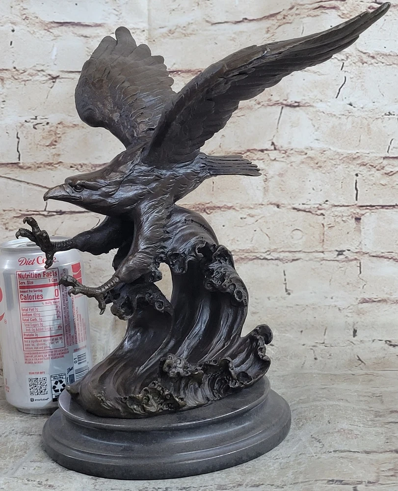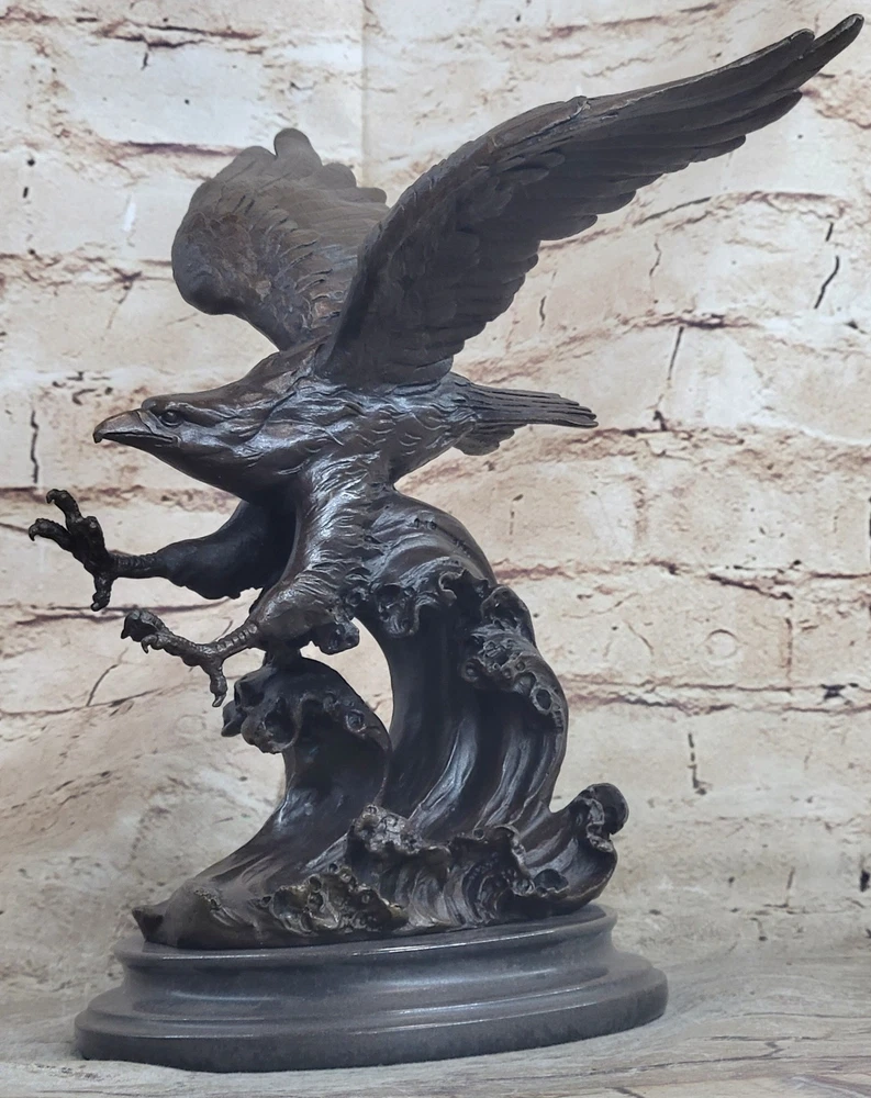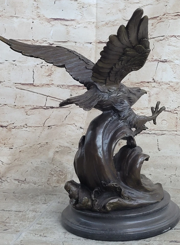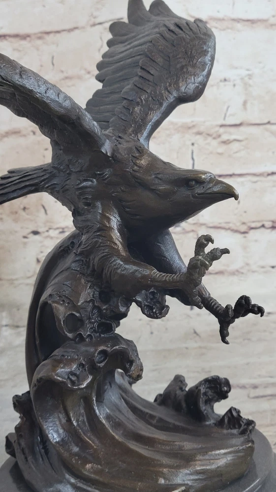 Signed Large Milo Eagle Falcon Art Deco Genuine Bronze Sculpture Figure Deal Signed Large Milo Eagle Falcon Art Deco Genuine Bronze Sculpture Figure Deal Condition : This sculpture is in perfect condition. Bronze Dimensions with Marble Base: Height 12 " X Width 10" Marble Dimensions: Diameter 8" Height without base: 11" Weight: 15 LBS Inventory: 68DW0795486 Introducing a captivating bronze sculpture depicting a majestic eagle in the midst of its hunt. With wings outstretched and talons poised for action, the eagle descends upon the ocean's surface, ready to snatch its prey. The sculpture beautifully captures the intensity and focus of this remarkable bird of prey. The keen eyesight of the eagle is a notable characteristic, allowing it to spot potential prey from great distances. This sculpture highlights the eagle's piercing gaze, with carefully crafted eyes that exude a sense of determination and power. The intricate details of the feathers and the dynamic pose of the eagle showcase the artist's skill and attention to capturing the essence of this magnificent creature. Crafted using the ancient "Lost Wax Method," this bronze sculpture exemplifies exceptional quality and durability. The brown patina finish adds depth and richness to the artwork, accentuating its lifelike features. Signed by the esteemed artist Milo, this sculpture is a testament to his talent and expertise. Whether displayed in a home, office, or as part of an art collection, this eagle sculpture is sure to command attention and evoke a sense of awe. It is a timeless symbol of strength, freedom, and the power of nature. Shipping Terms : Most of our items are shipped via USPS (United States Postal Service) mail or UPS. Most orders are shipped within 24-48 hours of purchase. Please be aware that not all items are available for USPS shipping due to size and weight. We do ship to Hawaii, Alaska, Canada, Puerto Rico, APO/AE, and U.S. Virgin Islands, however, an additional charge may be required. Please contact us before making any purchases in these areas. For Non-USA customers, you may be responsible for all duty, tax, brokerage fees that may be due upon delivery (shipping costs cover freight charges only). We also ship internationally. Please refer to the "Shipping and Handling" chart for the rates for each area. Payment : We accept just about any form of payment. PayPal, Master Card, Visa or American Express credit cards. Money orders, cashiers checks, and even personal or business checks. For governmental institutions, we will also accept a purchase order. Please understand that for personal or business checks we have to wait for the check to clear (usually 7 days) before shipping. Condition : New Detailed Hand Crafted Hot Cast Bronze Satisfaction Guaranteed. This is Stock Photo, Slight Color Variation!! Listing and template services provided by inkFrog