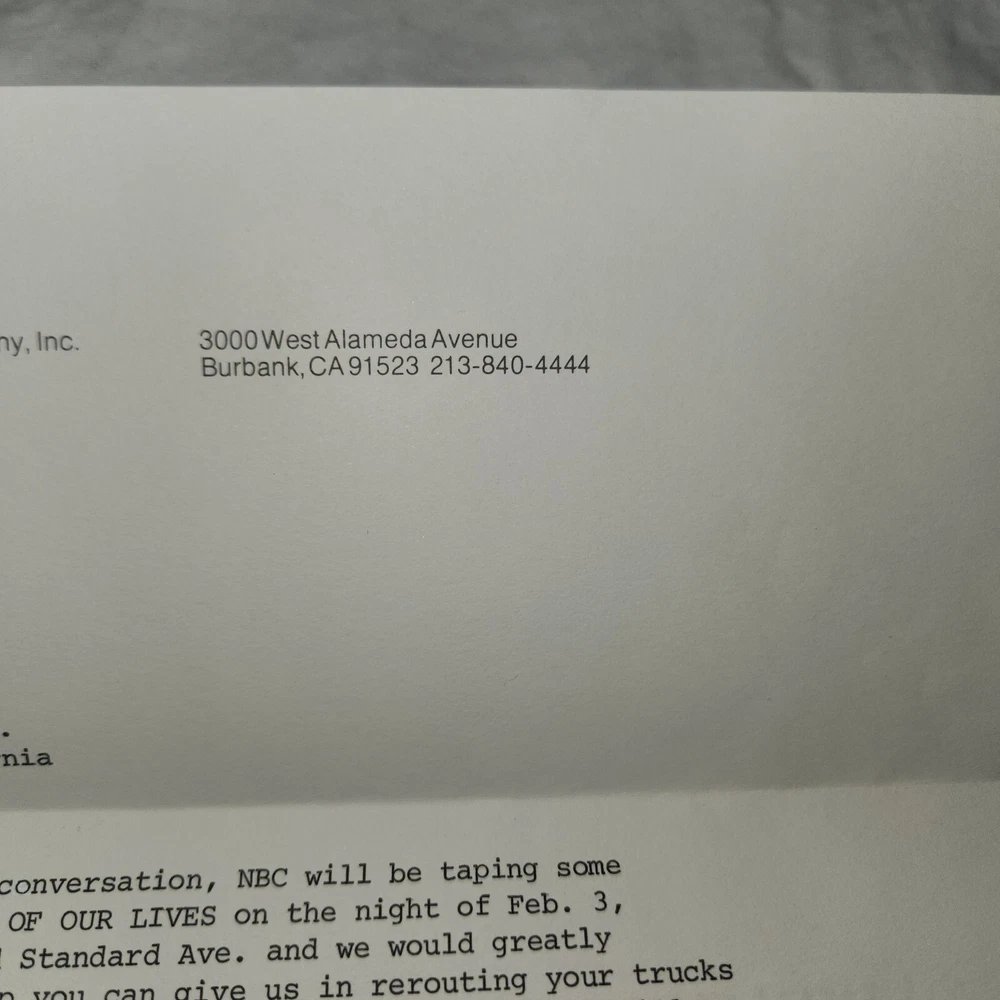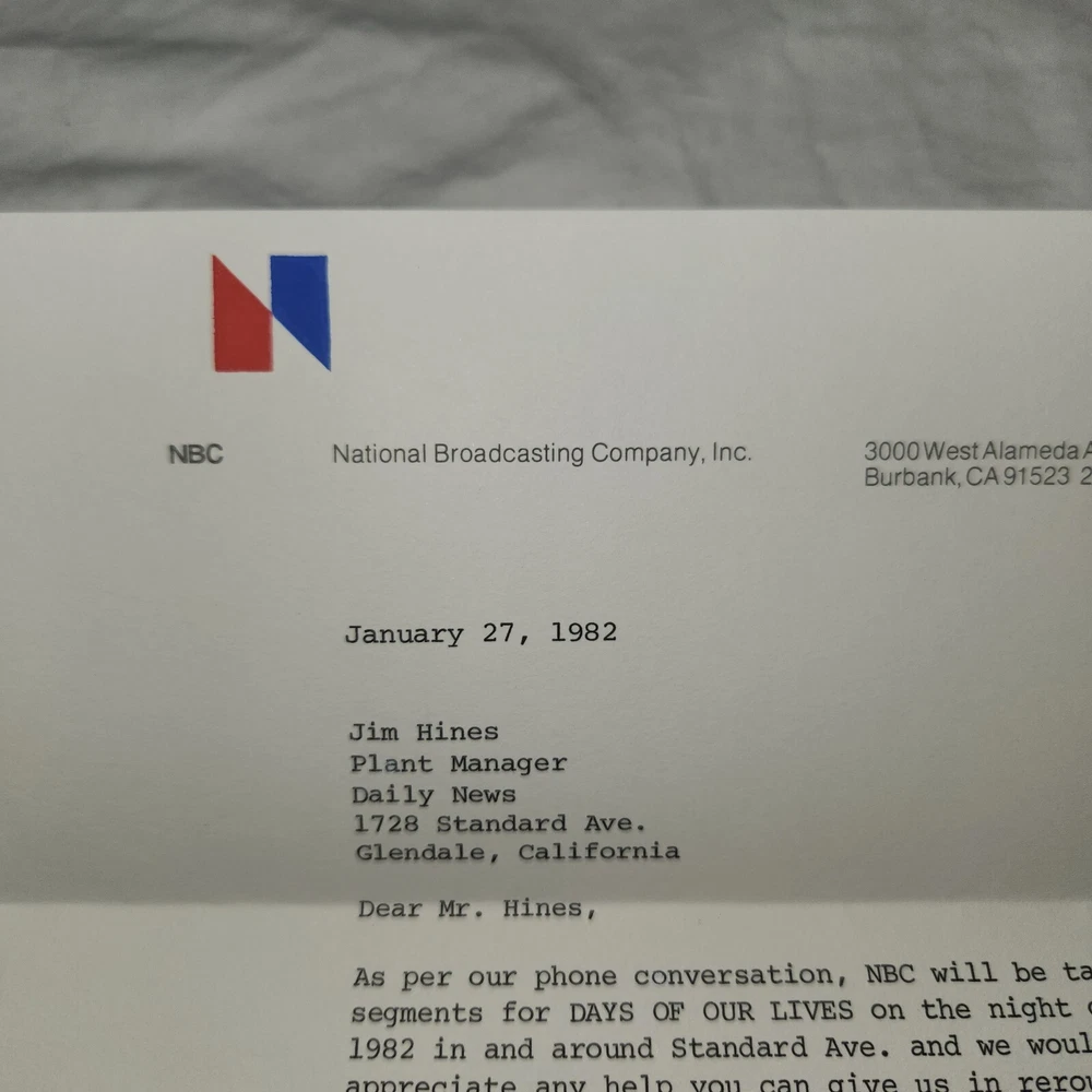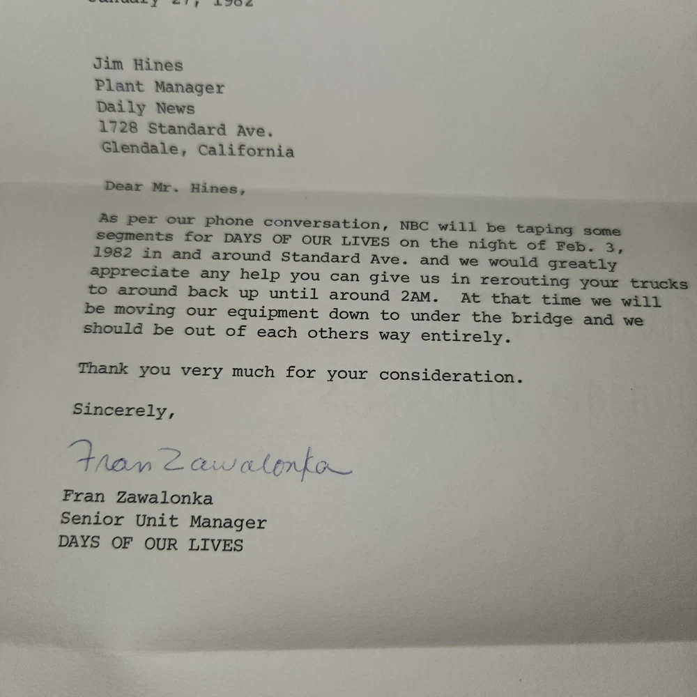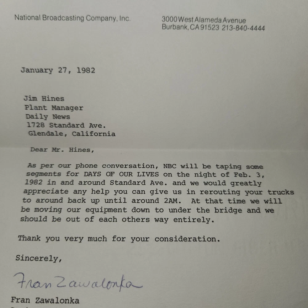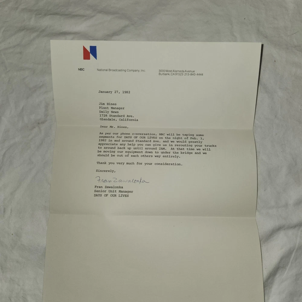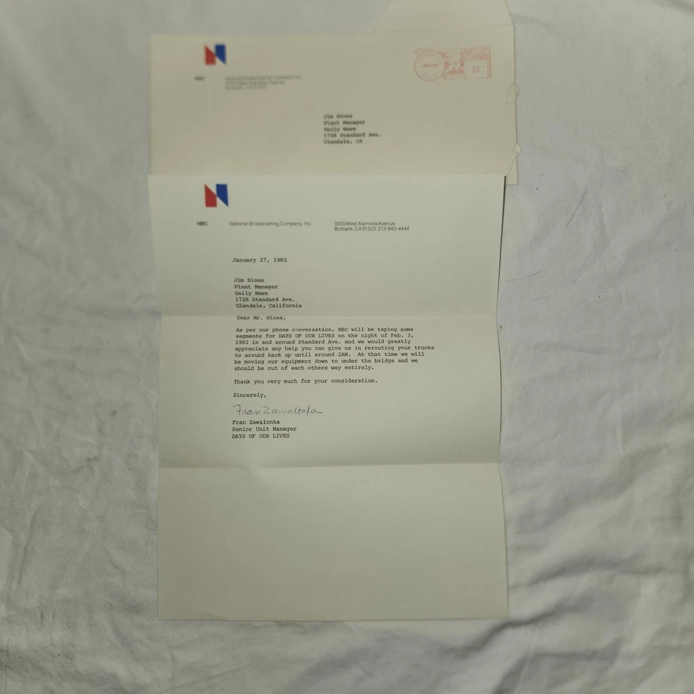 FREEEEEEEEEEEEE!!!!!!! SHIPPPPPPPPPPPING!!!!!! TO U.S. BUYERS!!!!! D 8 SIGNED LETTER, BY DAYS OF OUR LIVES SENIOR UNIT MANAGER FRAN ZAWALONKA, DATED JANUARY 27, 1982, ON NBC (NATIONAL BROADCASTING CORPORATION INC.) LETTERHEAD, AND AN NBC ENVELOPE, POSTMARKED JAN. 28, 1982, BURBANK, CALIF., SUBSTANCE OF THE LETTER IS REGARDING TAPING OF DAYS OF OUR LIVES ON STANDARD AVE. AND ASKING IF THE PERSON COULD REROUTE THEIR TRUCKS UNTIL 2 AM, WHEN THEY WILL MOVE THEIR EQUIPMENT UNDER THE BRIDGE AND THEN BE OUT OF EACH OTHER'S WAY. OWN THEIS PIECE OF AMERICAN TELEVISION HISTORY AND ADD IT TO YOUR LIBRARY, COLLECTION OR MOTIF TODAY....... PLEASE SEE ITEM CONDITION AND PHOTOS ABOVE. FROM THE EMERALD CITY TO YOUR CITY, THANK YOU FOR TAKING THE TIME, AND YOUR INTEREST IN THIS LISTING. IT IS GREATLY APPRECIATED. PLEASE TAKE A MOMENT TO LOOK AT OUR OTHER VINTAGE, UNIQUE AND EMERALD CITY TREASURES. THANK YOU AGAIN, AND HAVE A WONDERFUL DAY. :) WE HERE AT EMERALD CITY PLEASURES HAVE SAVED THESE MANY TREASURES FOR YEARS FROM THE CATACOMBS OF THE FUNKY GRUNGY URBAN JUNGLE OF THE PACIFIC NORTHWEST. SEATTLE TO BE EXACT. WE BELIEVE THAT IT IS IMPORTANT, NO MATTER HOW BIG OR SMALL, TO PRESERVE THESE TRINKETS, AND COLLECTIBLE ITEMS SO THEY MAY LIVE TO SHINE ANOTHER DAY IN SOMEONE ELSE'S COLLECTION, LIBRARY, DECORATING MOTIF, HOME, OFFICE, BOAT, CAR, OR WHEREVER THEY MAY WIND UP. EVERYTHING THAT HAS PASSED THROUGH THE HANDS OF MANKIND, OR THE SOILS OF THIS PLANET, HAS ITS' OWN UNIQUE STORY, AND SOUL. EVERY PIECE IS A MEMENTO OF A PASSING MOMENT IN TIME, AND DESERVES ANOTHER DAY TO BE A BRIGHT SHINING STAR. IT MAY BE AN OLD 45 THAT WAS CRACKLING ON A TURNTABLE DURING THE BEATNIK GENERATION OF THE 1950'S. IT MAY BE AN ANTIQUARIAN BOOK, THAT PASSED THROUGH THE HANDS OF A FAMOUS PERSON, MINER, FISHERMAN, OUTLAW, OR ANY OTHER NUMBER OF PEOPLE. IT MAY BE A PRESS PHOTO OF A FORMER PRESIDENT. IT MAY BE A SNAPSHOT OF A WWII SAILOR STUCK ON AN OBSCURE LONELY DESOLATE ISLAND IN THE SOUTH PACIFIC. IT MAY BE SOMEBODY YOU KNOW OF. IT MAY BE SOMEBODY YOU'VE NEVER HEARD OF. IF IT'S CURIOUS, UNIQUE, FUNKY, VINTAGE, OR JUST COMMON, IT MUST BE THE EMERALD CITY. WHATEVER IT IS, IT WAS MEANT TO BE, BECAUSE YOU LANDED ON THIS PAGE. ADD THIS TREASURE TO YOUR MOTIF, COLLECTION OR WHEREVER ELSE IT SUITS YOU TODAY. FROM THE EMERALD CITY TO YOUR CITY. THANK YOU, AGAIN. :) ONE DAY HANDLING ONCE PAYMENT IS RECEIVED. FREEEEE!!!!!!! SHIPPING TO U.S. BUYERS!!!! ECONOMY MAIL SHIPPING.