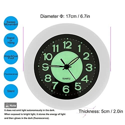 Return Policy Fast Delivery Trusted seller Silent Wall Clock, 6.7" Round Non-Ticking Quality Modern Quartz Battery Operated Easy to Read Wall Decorative Clock for Home/Office/School/Kitchen/Bedroom/Living Room Product Description Night Light Function: The Arab numbers on the dial contains fluorescent components, it can illuminate in dark when it absorb enough light energy during the day.(Tips: the wall clock will glow in the dark for 5-6 hours or so, The glow time depends on the light absorbed in the day). It must absorb enough light, then it will glow in night. Non-Ticking & Silent Running: No annoying ticking, and its built-in Precise Quartz Sweep Movement s accurate time. Clear and Easy to Read: The large Arab numbers on the 6 inch dial are clear and easy to read for you from any corner, perfect for bedroom, living room, office decoration. Easy to install: Back slot design offers easy installation, operated by 1*AA battery (included). Good Texture Modern and Simple Design: Round in shape and made of ABS, it gives you a nice feeling when you hold it. Stylish enough to be a Great gift choice for your family, friends, classmates in festivals and other important time. Shipping Returns Payment Shipping Shipping is FREE to all addresses other than APO/PO boxes in the lower 48 states. All our stock ships from US-based warehouses. Shipped via USPS or UPS (depending on location and package weight) Unless stated otherwise, all orders will ship within 24-72 hours of your payment being processed. Check our feedback to see the great reviews of FAST shipping we offer. Returns Seller does not accept returns Payment We currently accept payment via eBay managed payments only. Once payment is cleared, we will dispatch your shipment within 1-3 business days. Please refer to the "Shipping" tab for more information regarding shipping speed to your destination.